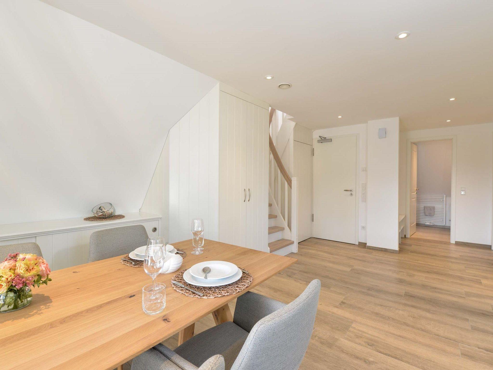 Im ersten Obergeschoss befindet sich ein Schlafzimmer mit einem komfortablen Boxspringdoppelbett und Morgensonne. Zudem gibt es ein Duschbad und einen hellen Wohnbereich mit integrierter Küche und Zugang zum überdachten und windgeschützten Südbalkon.