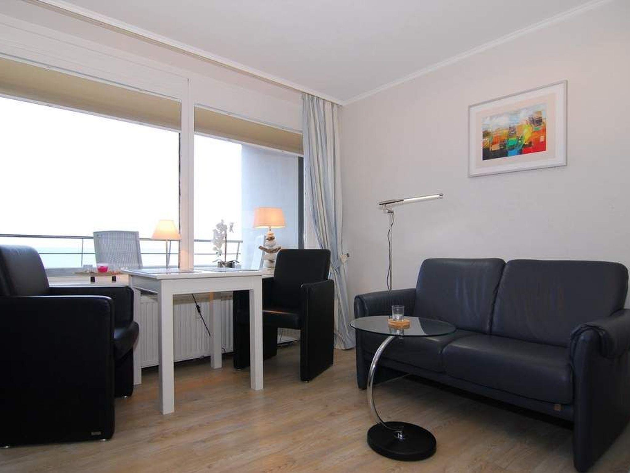 Exklusive 1-Zi.-Ferienwohnung im 2.OG zur Seeseite, ca. 34 m², Haus am Meer. Nichtraucher![ Wohn-/Schlafraum mit Doppelbett (160x200, 2 Matratzen á 80 cm), Zweisitzercouch, Tisch, 2 Sessel, Essplatz am Fenster mit Blick aufs Meer, Radio, Flat-TV, DVD, W-LAN ( ohne Gewähr ). Westbalkon mit Balkonmöbel, Duschbad/WC, Küchenzeile mit Geschirrspüler u. Mikrowelle im Flurbereich! Tierhaltung ist nicht gestattet! Bettwäsche und Handtücher sind zur Anreise aufgezogen. Ein PKW-Stellplatz kann kostenpflichtig zugebucht werden. Beginnend vom 15.10.2025 bis 5.4.2026 (Ostern) findet die Fassandensanierung der Landseite (Osten) sowie des Südgiebels statt. Mit Baulärm ist in dieser Zeit zu rechnen.