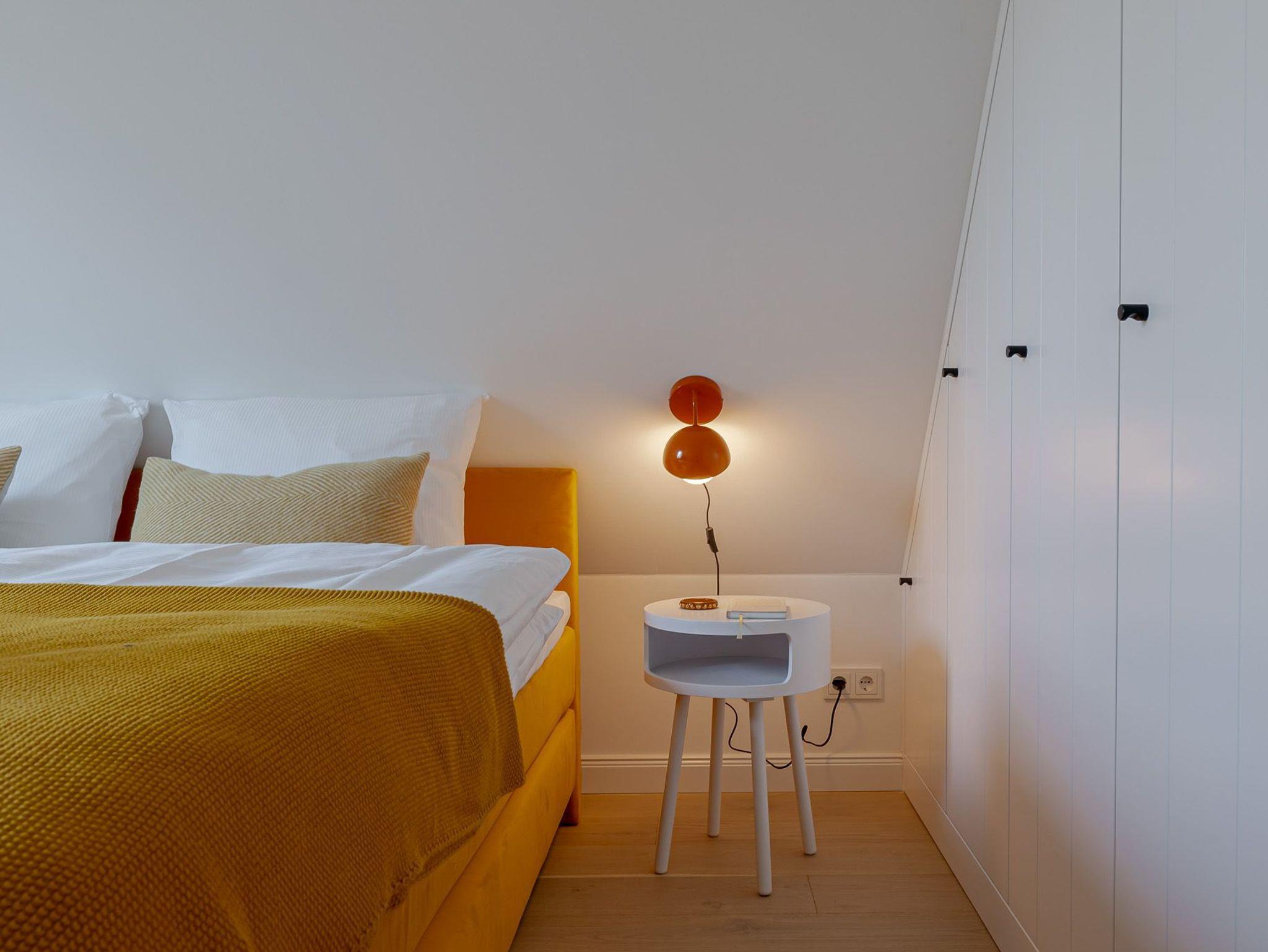 Nun geht es hoch hinaus, und zwar auf Ihr Oberdeck! Entdecken Sie Ihr kuscheliges Schlafzimmer, welches über die Treppe erreichbar ist. Sie erwartet dort ein komfortables Schramm-Boxspringbett, in dem es sich prima träumen lässt. Tipp: Öffnen Sie das Fenster, manchmal kann man hier noch das Rauschen der Wellen leise hören. Herrlich.