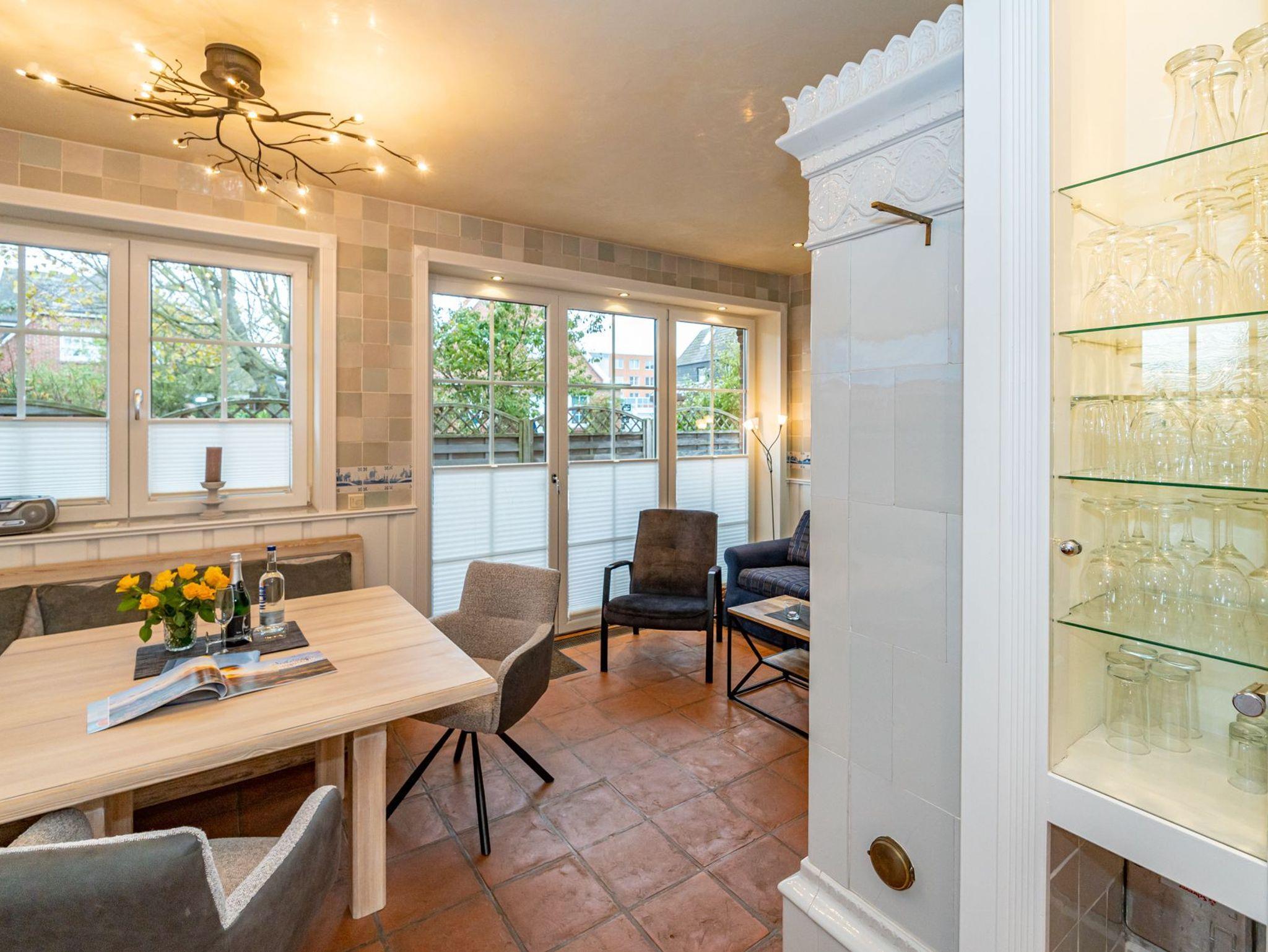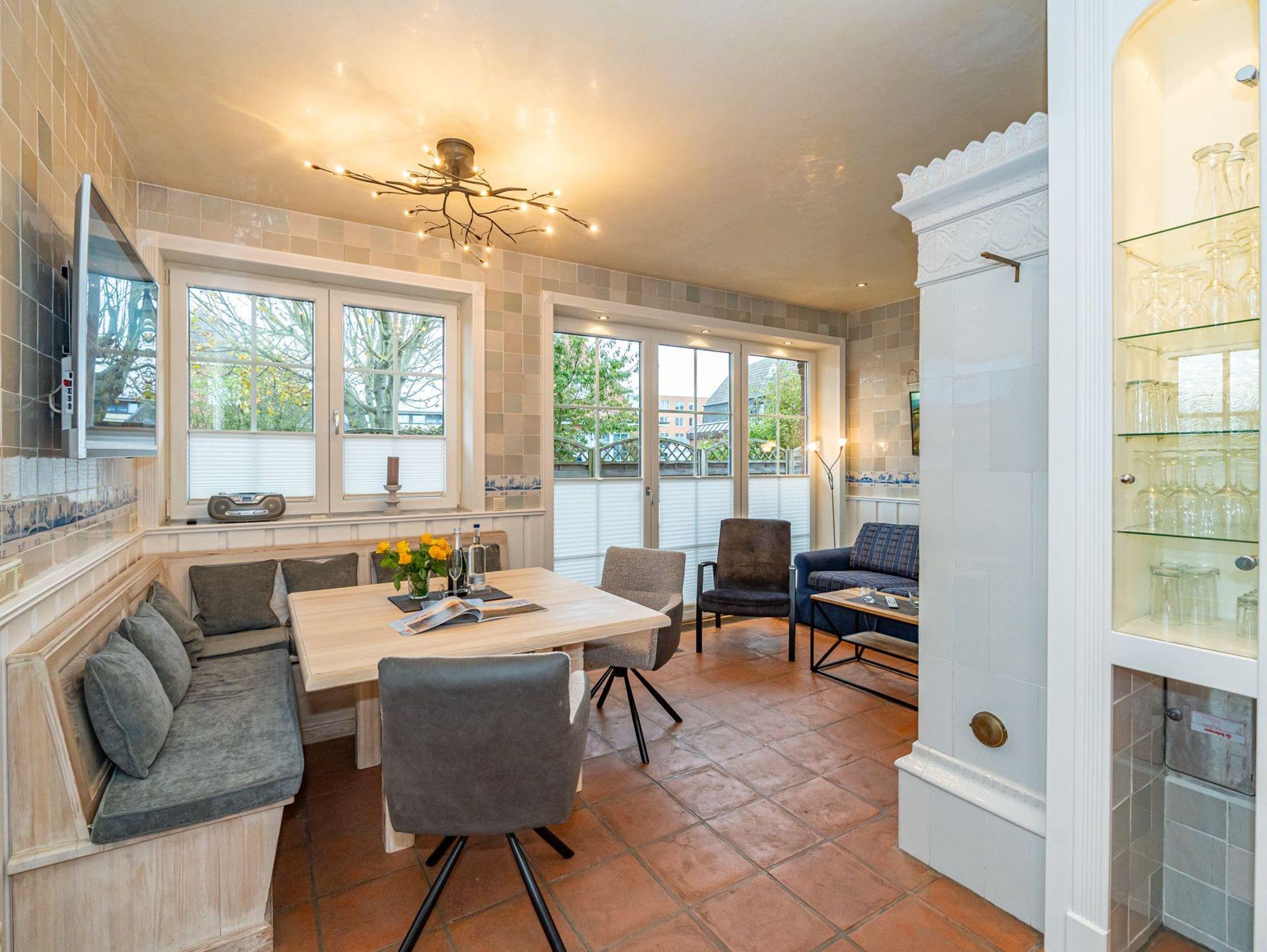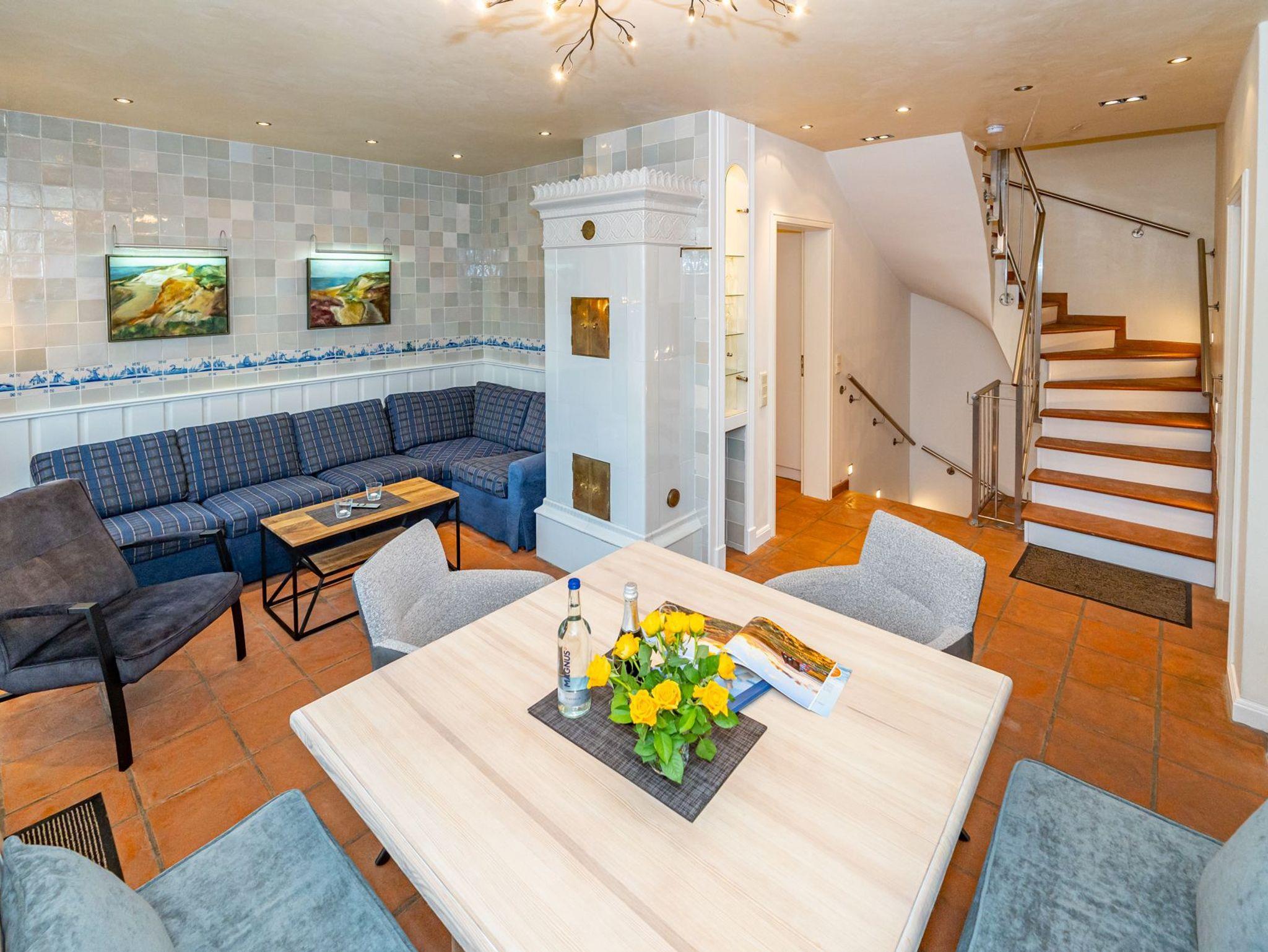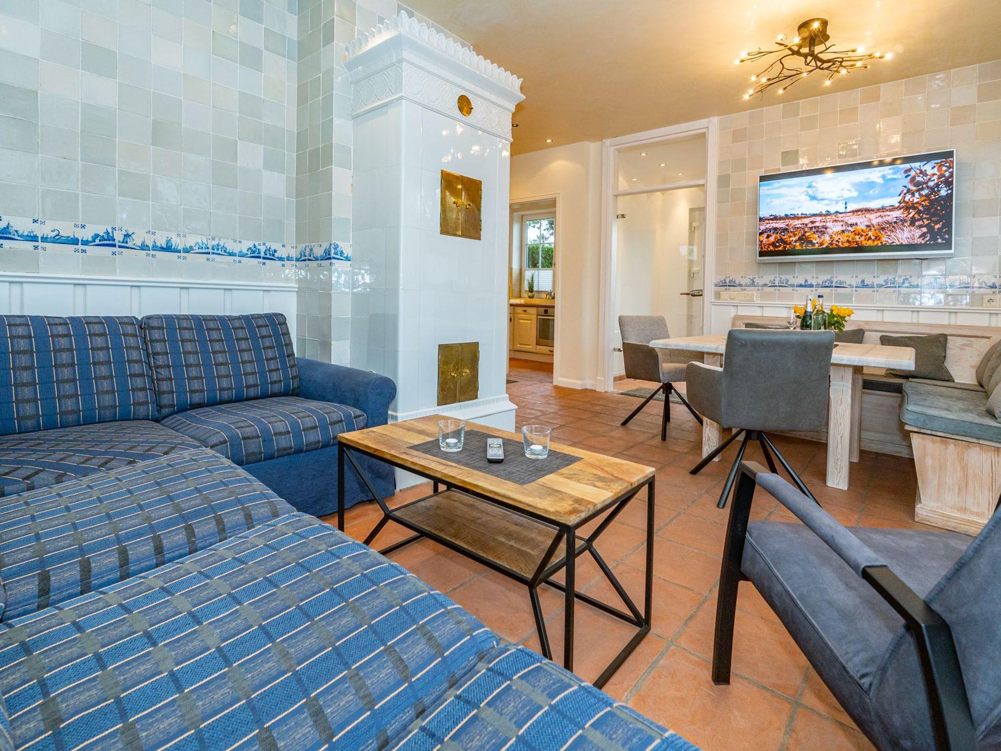 Ein einladender Vorflur mit Garderobe führt in den großzügigen Wohnbereich mit stilvoller Möblierung. Die hochwertige Eckgarnitur von Bielefelder Werkstätten sowie der große Esstisch mit gepolsterter Sitzbank schaffen eine gemütliche Atmosphäre. Der antike Kachelofen sorgt für besondere Behaglichkeit. Moderne Unterhaltungstechnik mit einem großen Flachbildfernseher sowie eine Telefon- und Internetflatrate (WLAN) ins deutsche Festnetz stehen zur Verfügung.