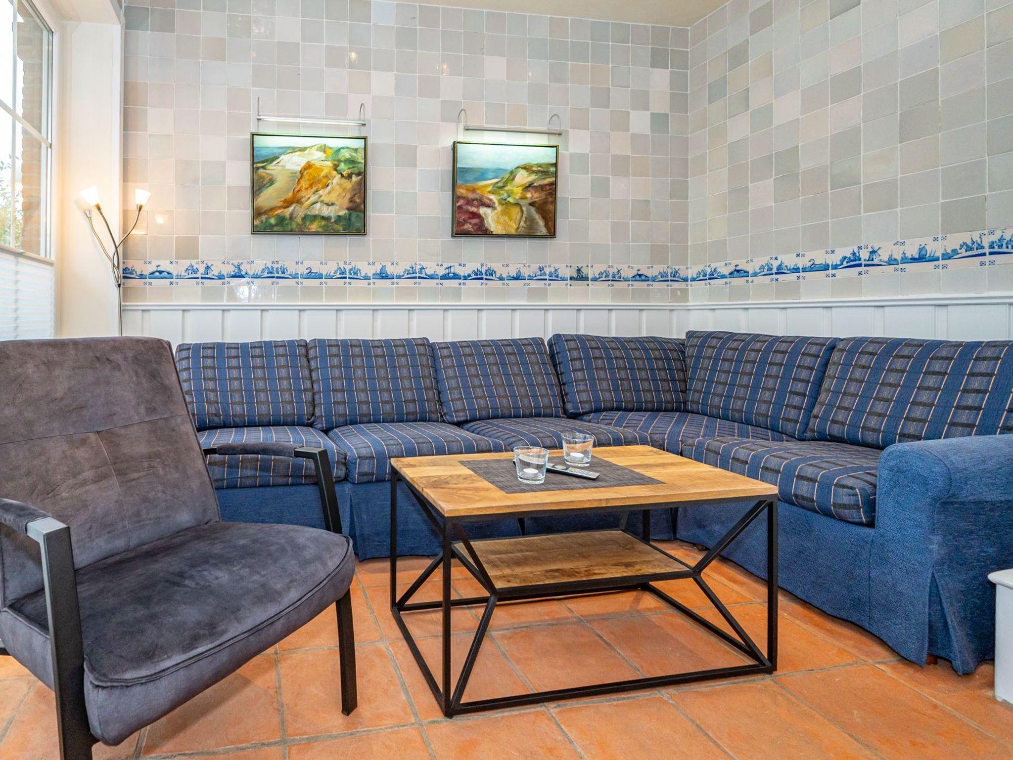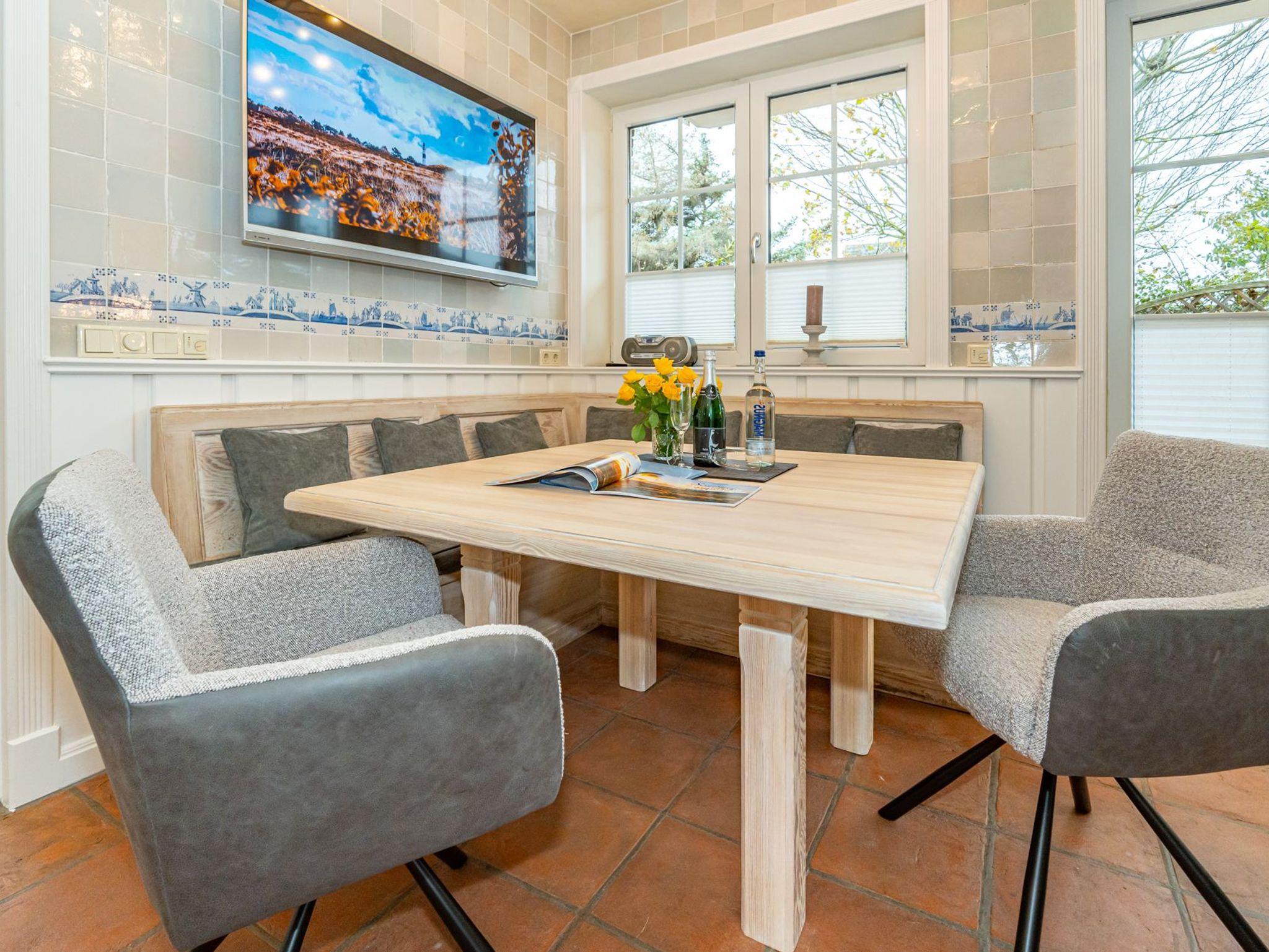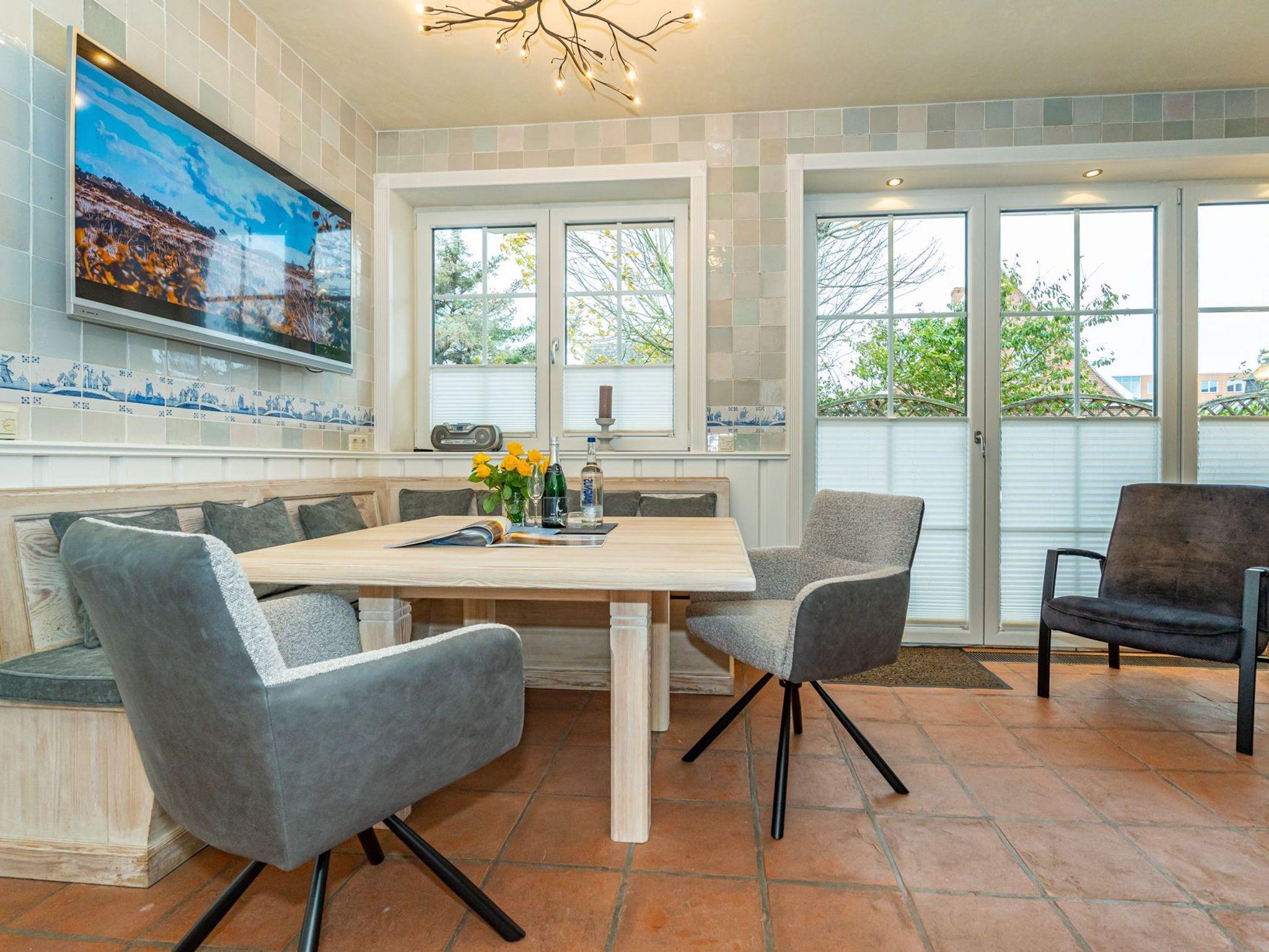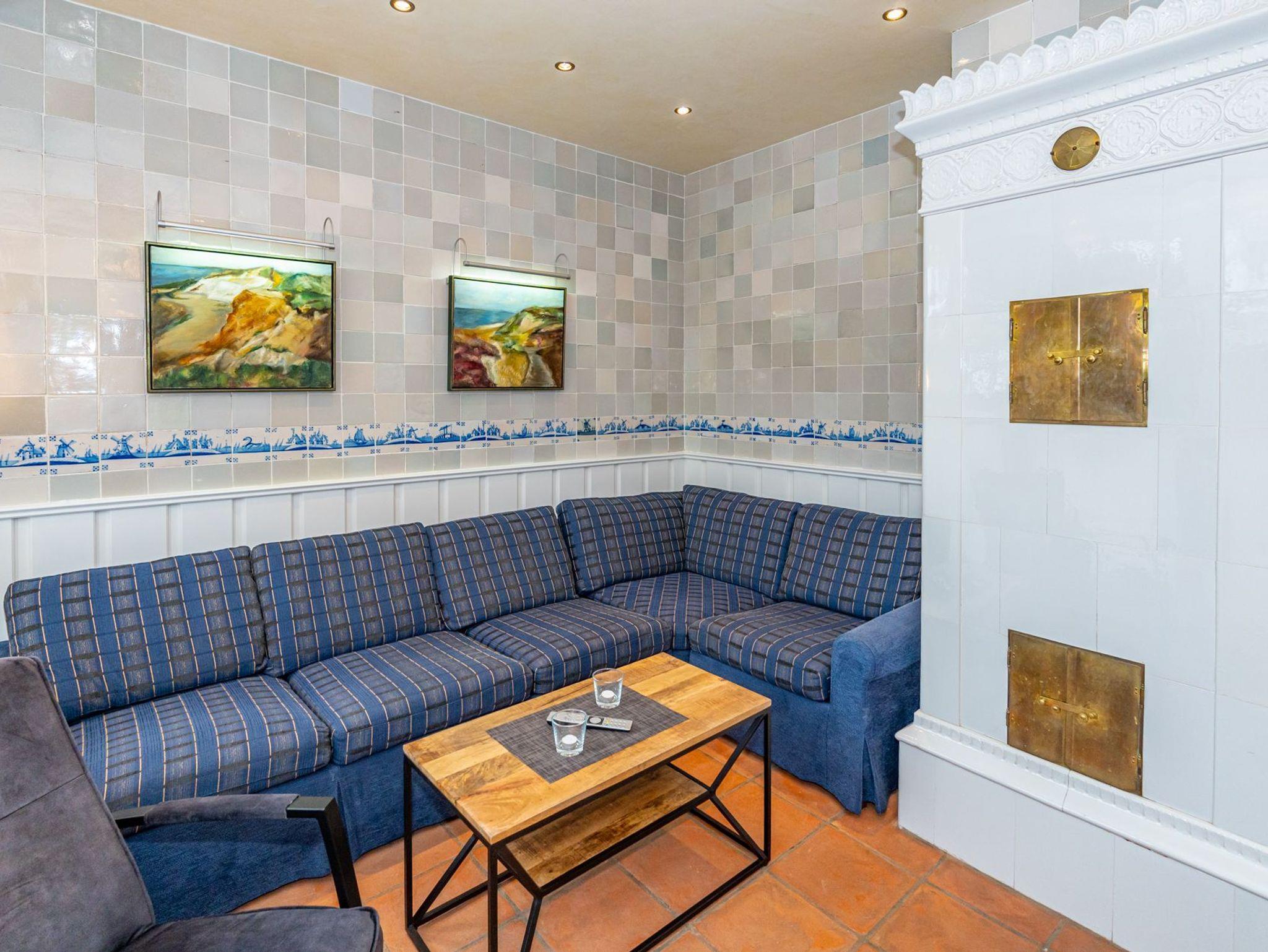 Ein einladender Vorflur mit Garderobe führt in den großzügigen Wohnbereich mit stilvoller Möblierung. Die hochwertige Eckgarnitur von Bielefelder Werkstätten sowie der große Esstisch mit gepolsterter Sitzbank schaffen eine gemütliche Atmosphäre. Der antike Kachelofen sorgt für besondere Behaglichkeit. Moderne Unterhaltungstechnik mit einem großen Flachbildfernseher sowie eine Telefon- und Internetflatrate (WLAN) ins deutsche Festnetz stehen zur Verfügung.