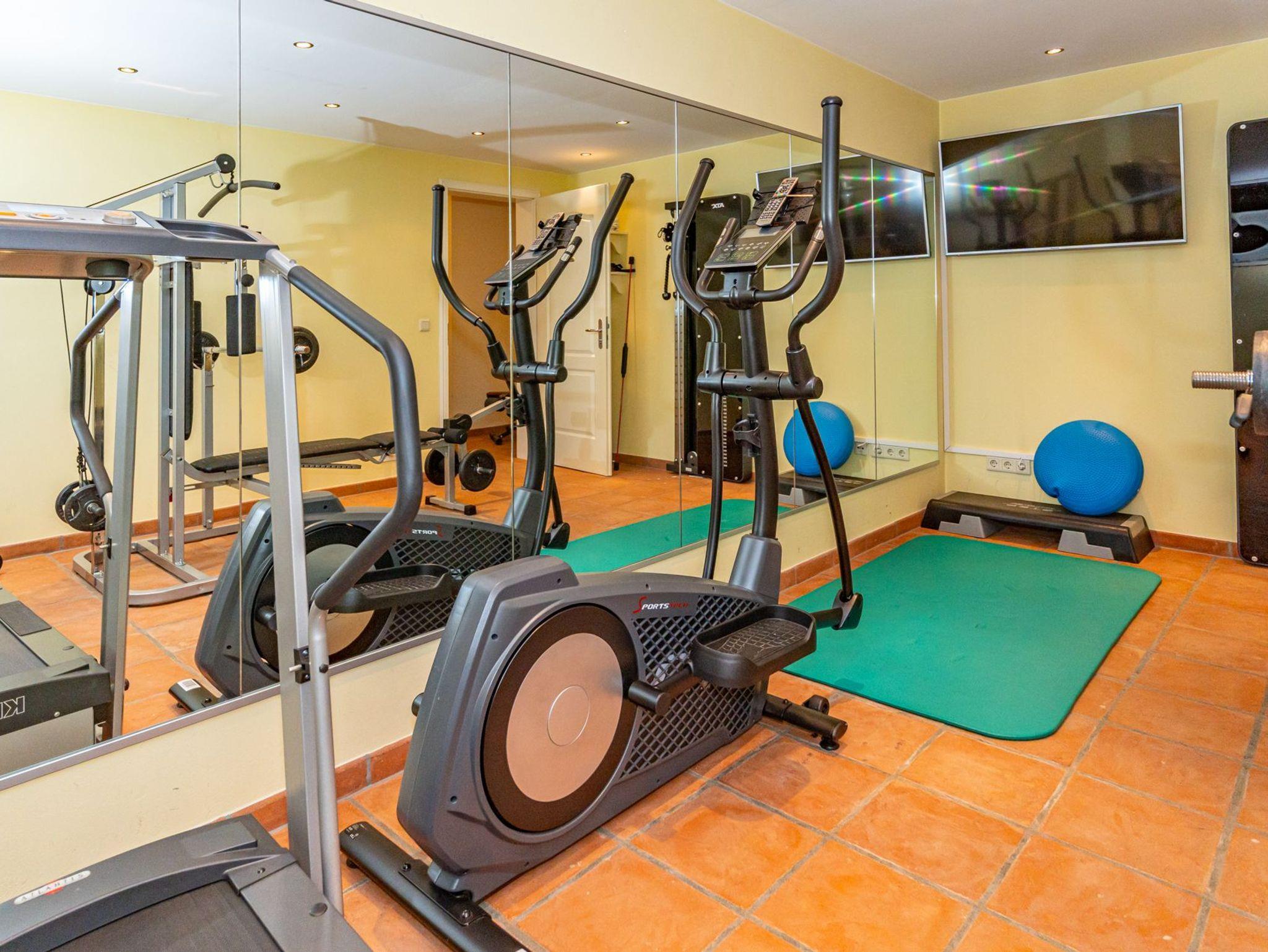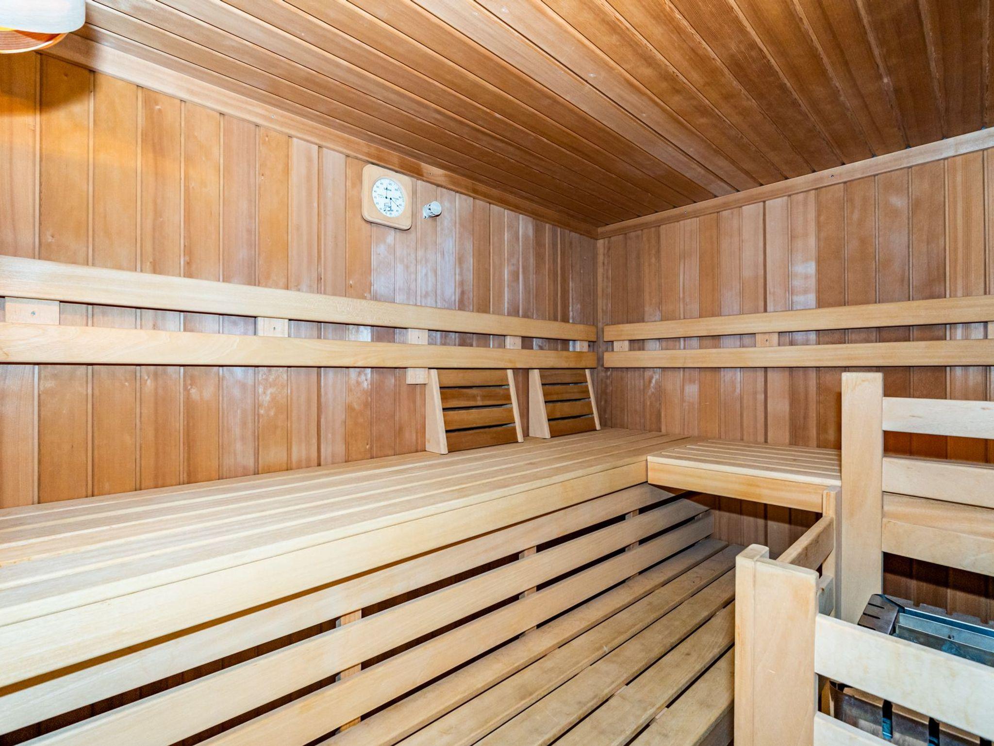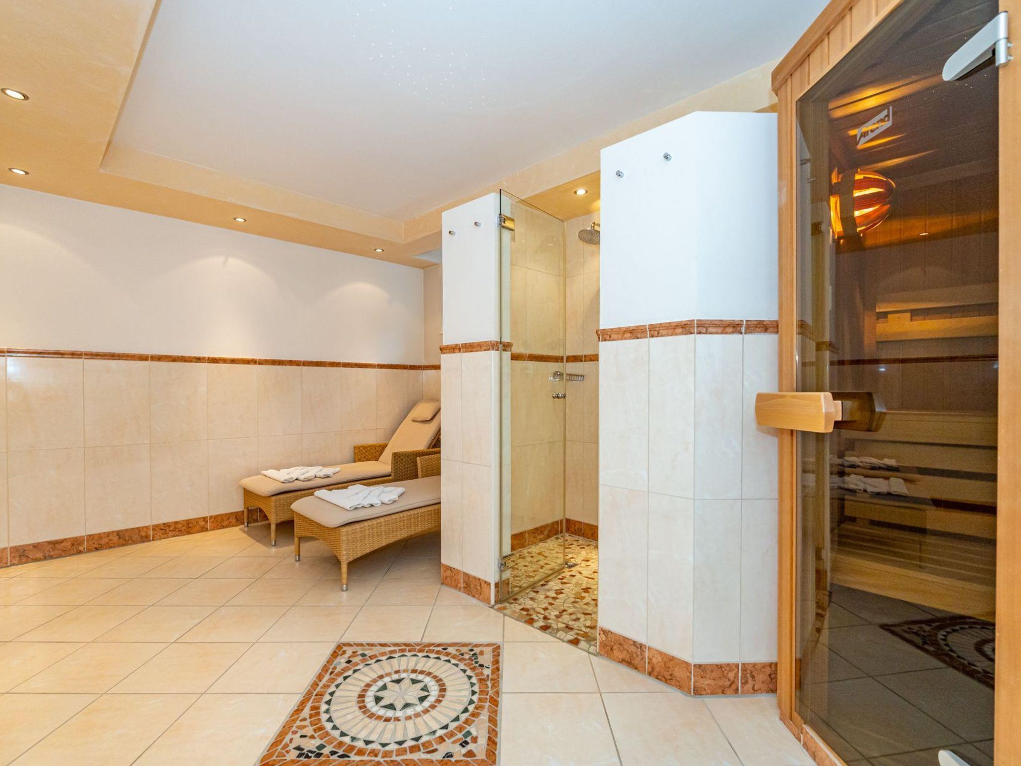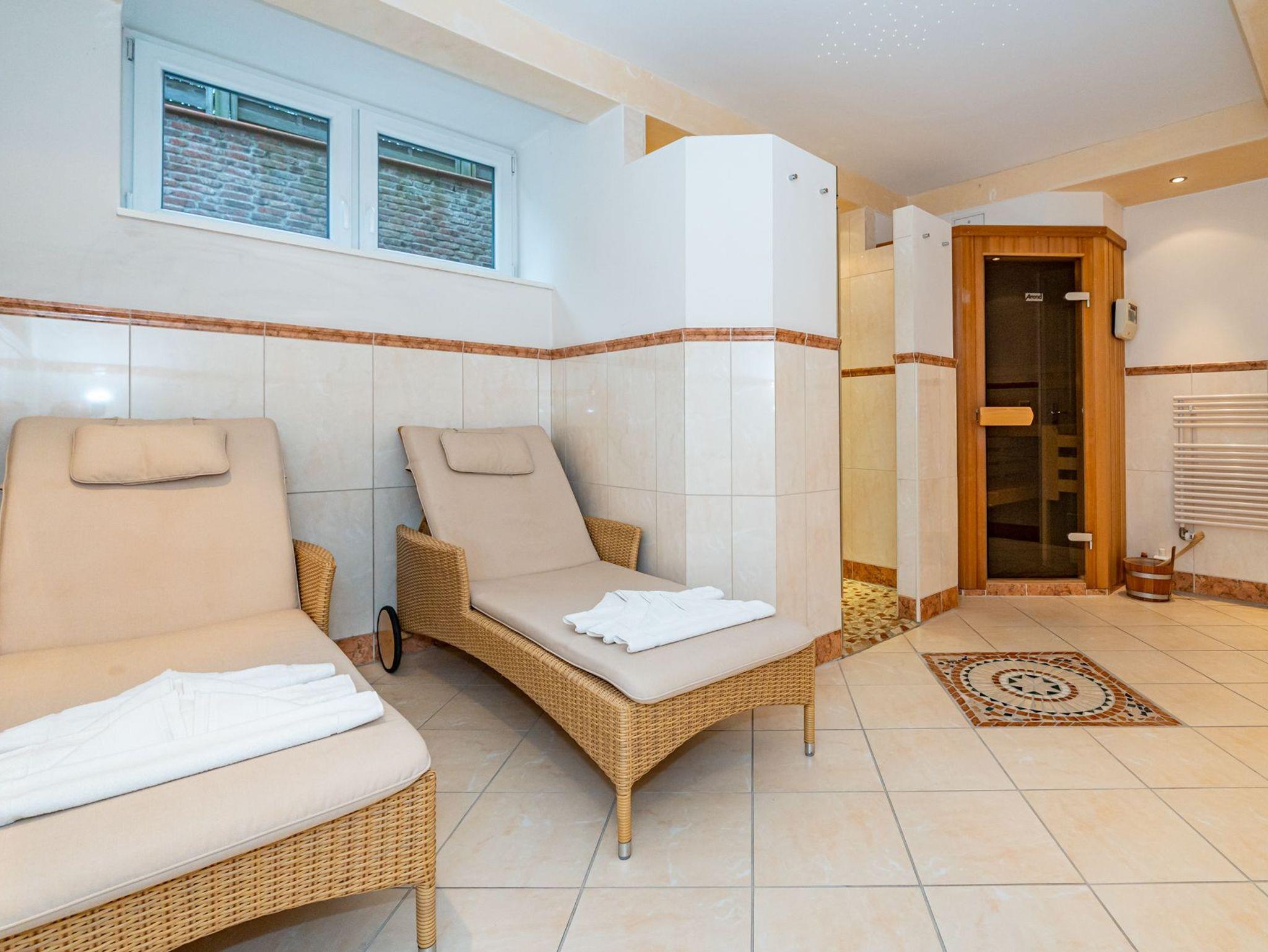 Der hauseigene Wellness- und Fitnessbereich steht Ihnen zur freien Nutzung zur Verfügung. Die Sauna ist mit zwei zusätzlichen Duschen und einem Ruhebereich mit zwei Liegen ausgestattet. Ein separates Gäste-WC befindet sich zwischen Saunabereich und Fitnessraum. Der Fitnessraum verfügt über moderne Geräte und einen Flachbild-TV. Für Ihren Komfort stehen Bademantel und Saunatuch zur Verfügung.