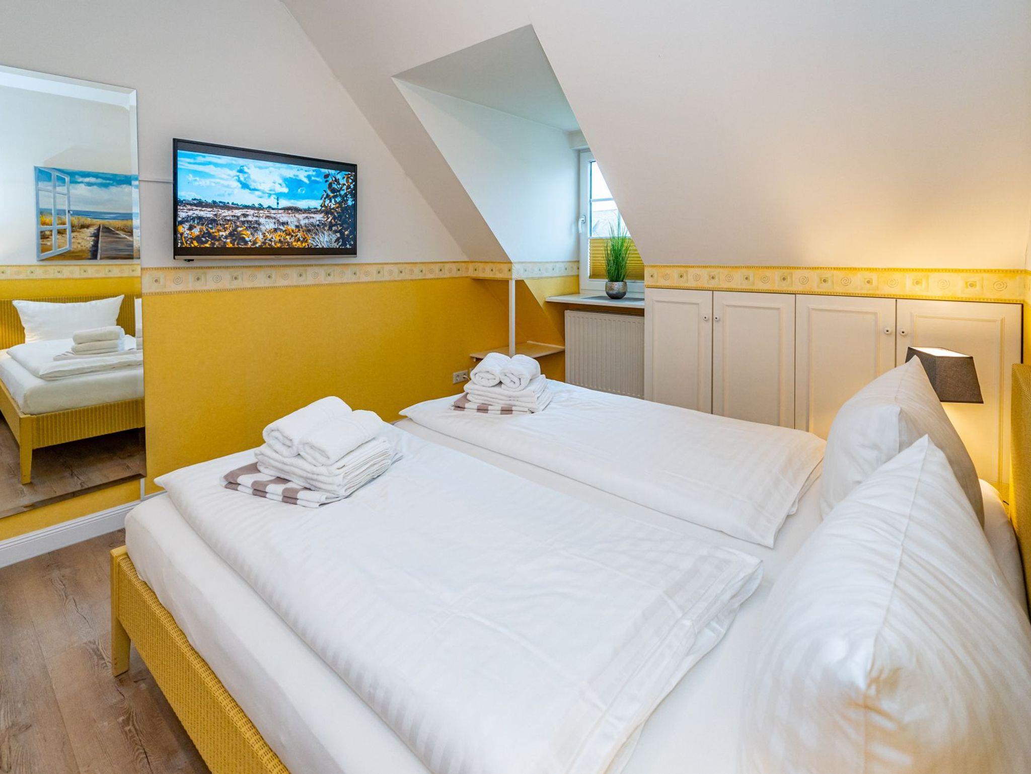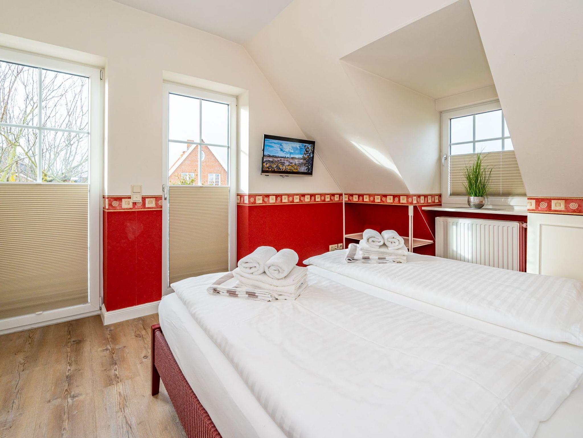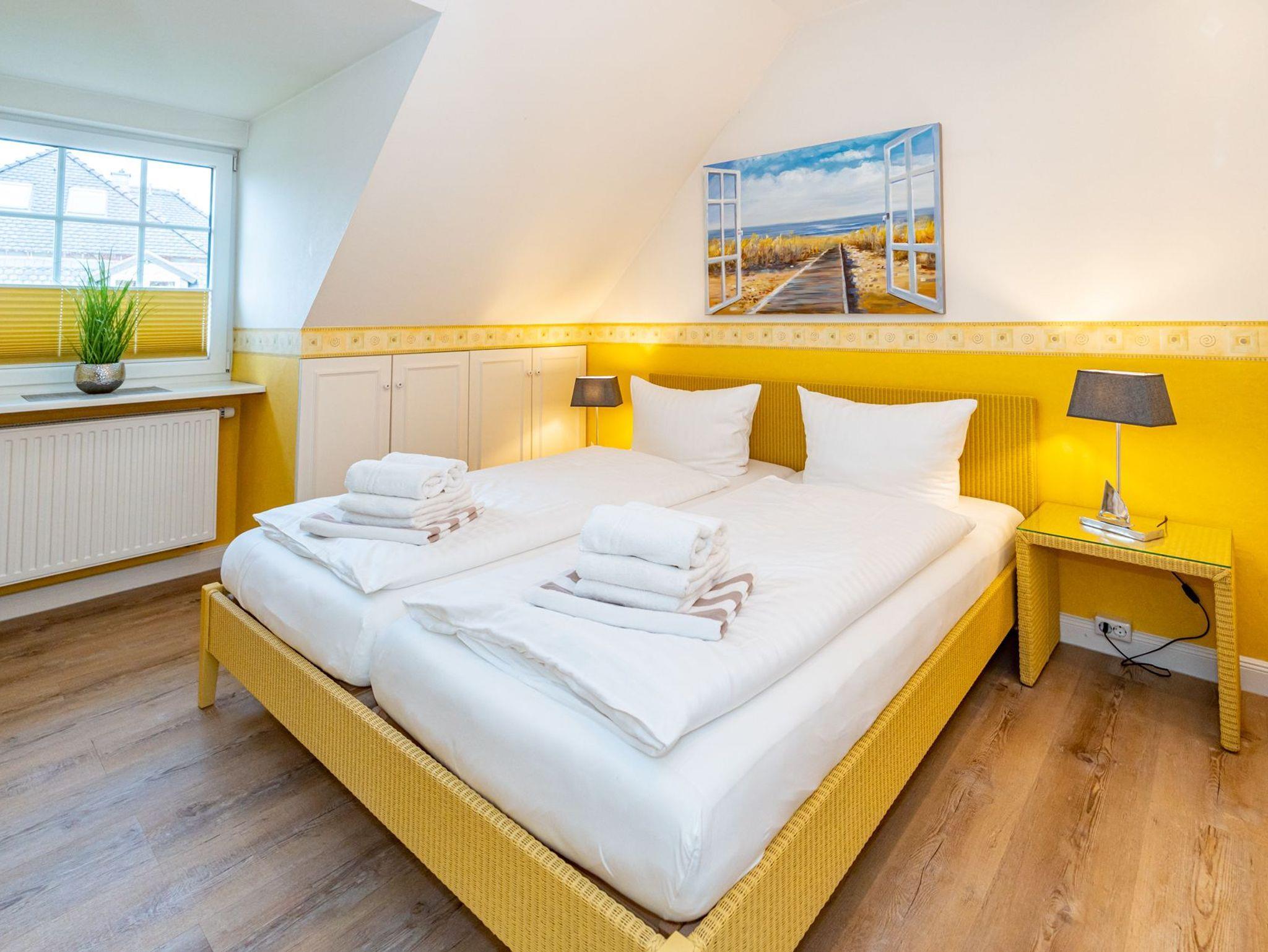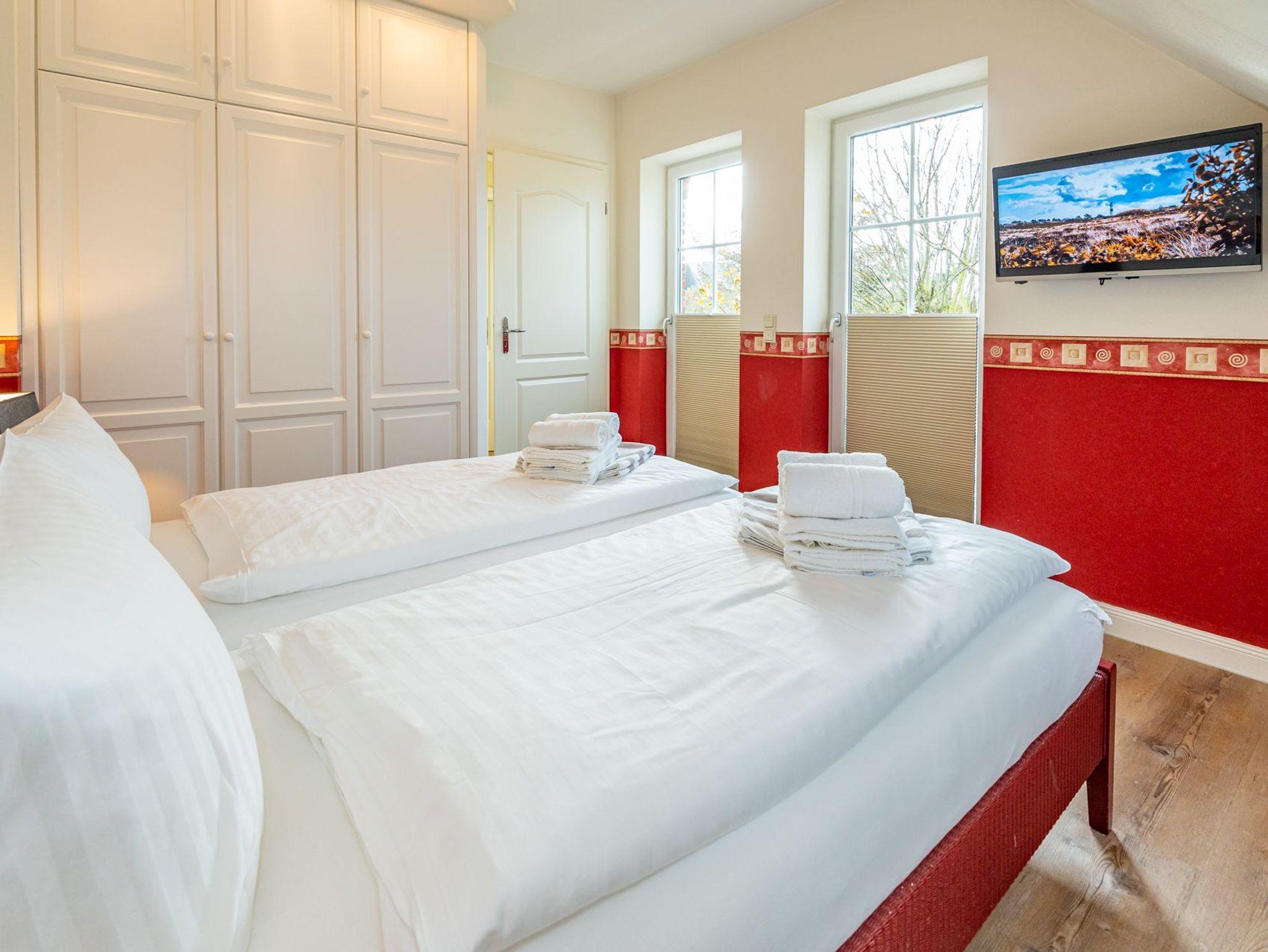 Das komplett mit modernem Designerboden in Holzoptik ausgestattete Obergeschoss umfasst drei weitere Schlafzimmer. Zwei geräumige Doppelzimmer verfügen jeweils über ein Doppelbett mit Einzelmatratzen (0,90 x 2,00 m) und einen eigenen Flachbild-TV. Das dritte Schlafzimmer ist mit einem Einzelbett (1,00 x 2,00 m) sowie einem zusätzlichen Kinderbett ausgestattet und verfügt ebenfalls über einen Flachbild-TV. Ein weiteres Badezimmer mit kombinierter Dusch-/Badewanne, Waschtisch, WC und integriertem Radio bietet zusätzlichen Komfort. Sämtliche gefliesten Räume sind mit Fußbodenheizung ausgestattet und sorgen für eine angenehme Wohnatmosphäre.