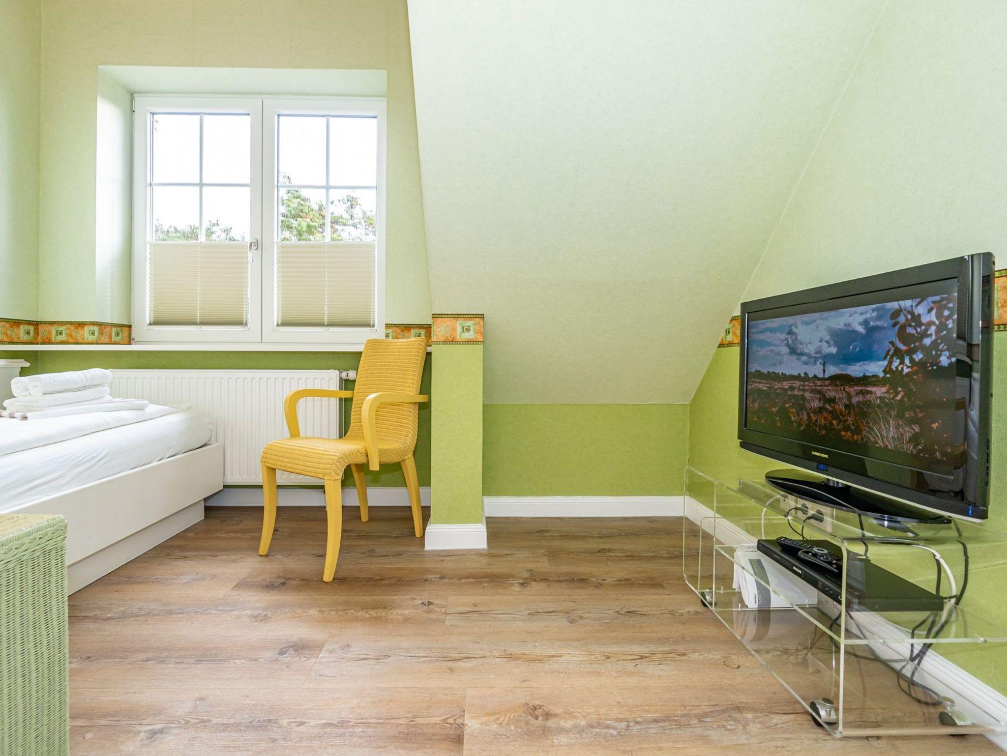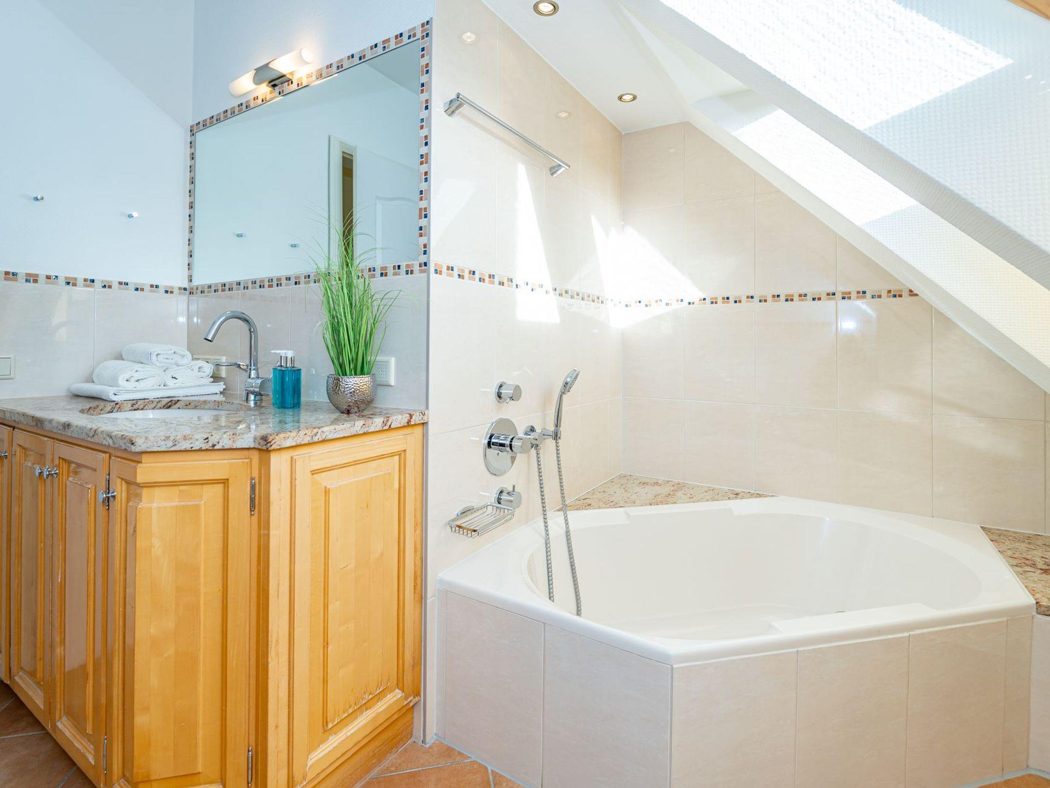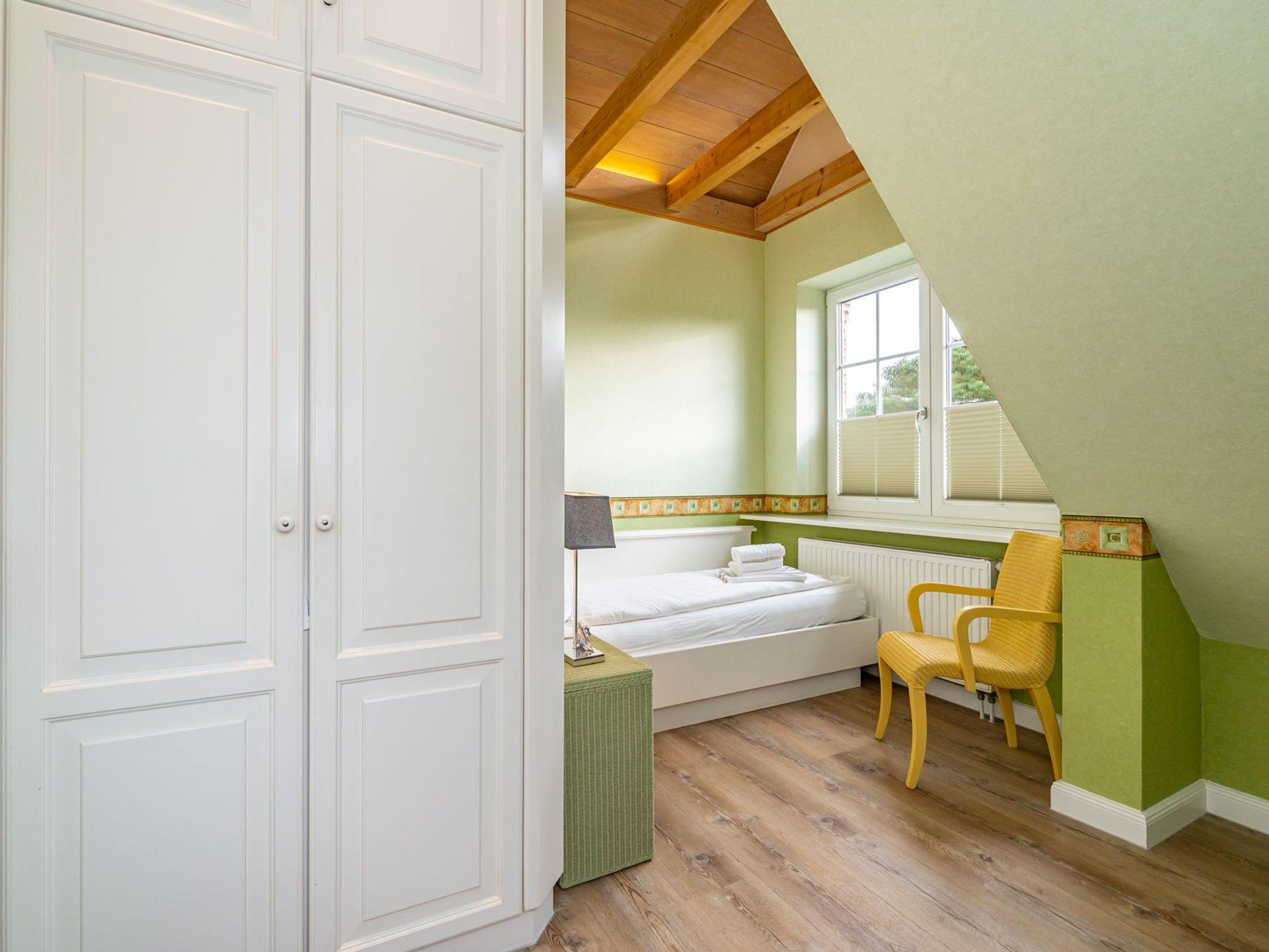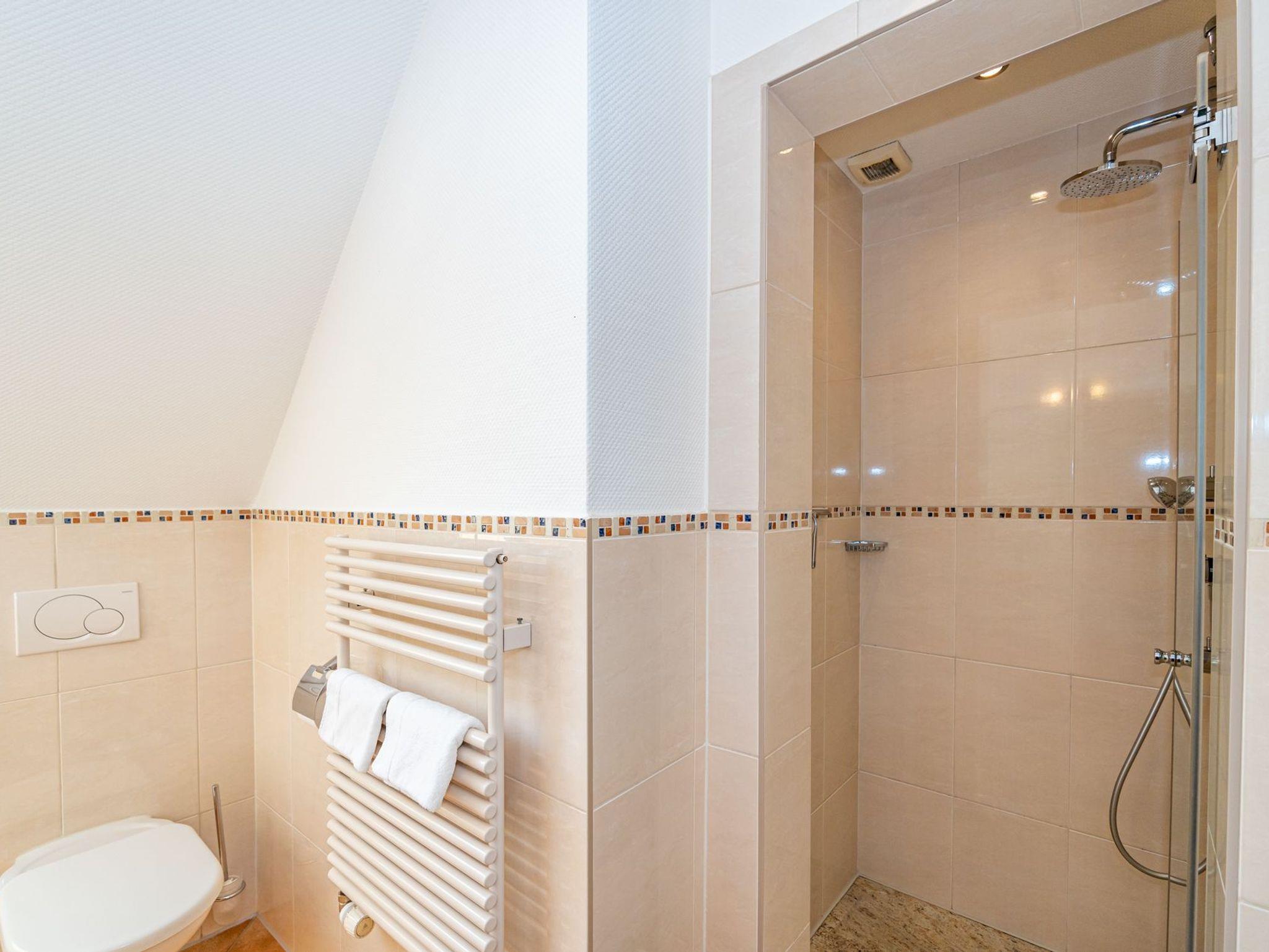 Das komplett mit modernem Designerboden in Holzoptik ausgestattete Obergeschoss umfasst drei weitere Schlafzimmer. Zwei geräumige Doppelzimmer verfügen jeweils über ein Doppelbett mit Einzelmatratzen (0,90 x 2,00 m) und einen eigenen Flachbild-TV. Das dritte Schlafzimmer ist mit einem Einzelbett (1,00 x 2,00 m) sowie einem zusätzlichen Kinderbett ausgestattet und verfügt ebenfalls über einen Flachbild-TV. Ein weiteres Badezimmer mit kombinierter Dusch-/Badewanne, Waschtisch, WC und integriertem Radio bietet zusätzlichen Komfort. Sämtliche gefliesten Räume sind mit Fußbodenheizung ausgestattet und sorgen für eine angenehme Wohnatmosphäre.