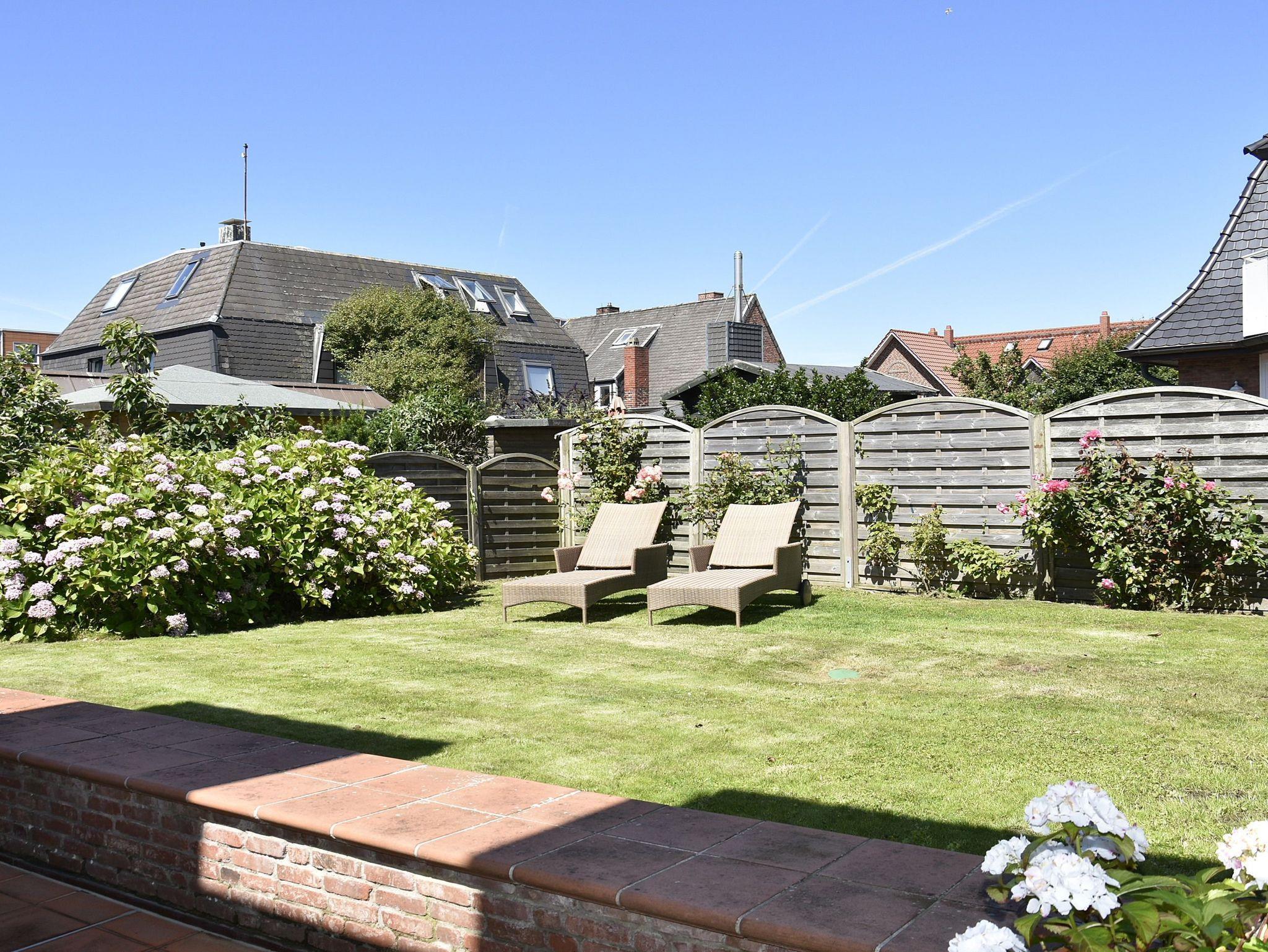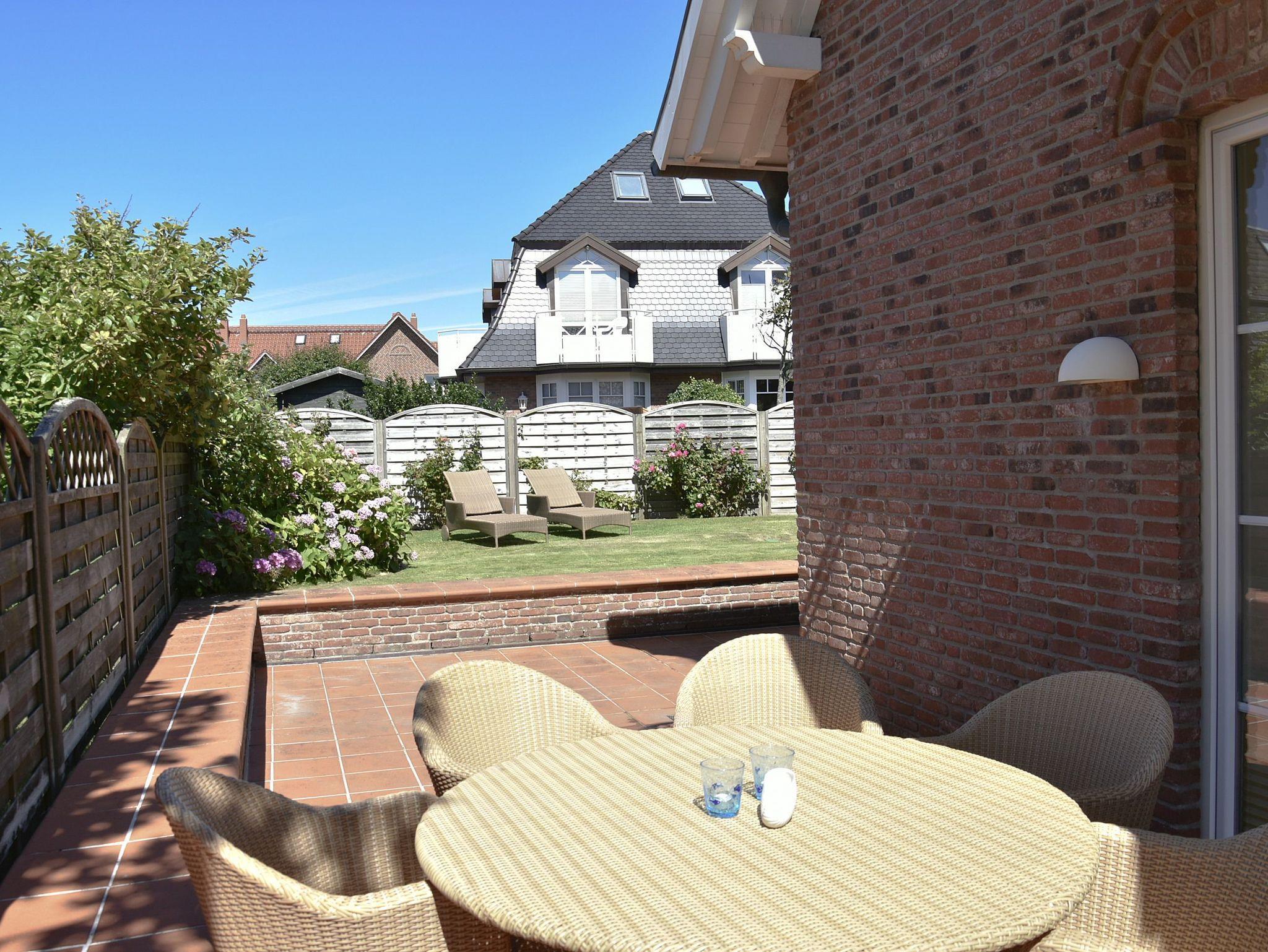 Großzügige Sonnenterrassen für entspannte Stunden. Das Haus verfügt über eine umlaufende Terrasse von Westen nach Norden, sowie eine zusätzliche kleine Süd-Terrasse mit einem weiteren Gartenteil mit einem Strandkorb.