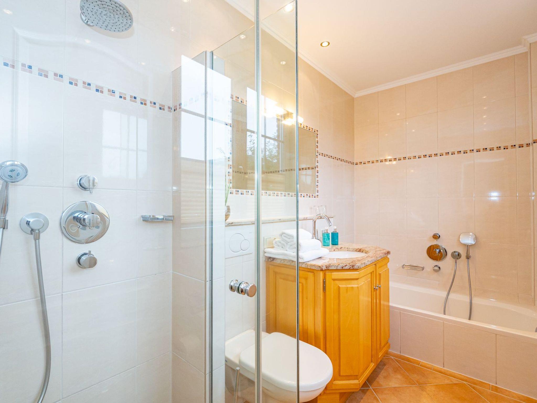 Ein hochwertig ausgestattetes Schlafzimmer mit einem überlangen Doppelbett (0,90 x 2,20 m, Einzelmatratzen) bietet direkten Zugang zur Terrasse. Das angrenzende Ensuite Badezimmer verfügt über eine kombinierte Dusch-/Badewanne, ein WC und ein integriertes Radio. Ein separates Gäste-WC befindet sich ebenfalls im Erdgeschoss.