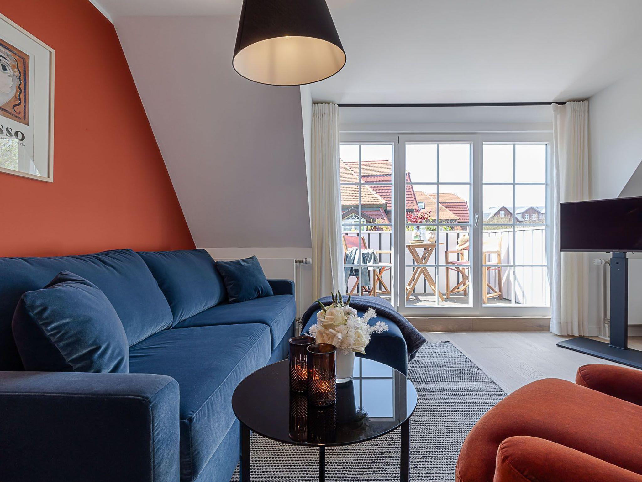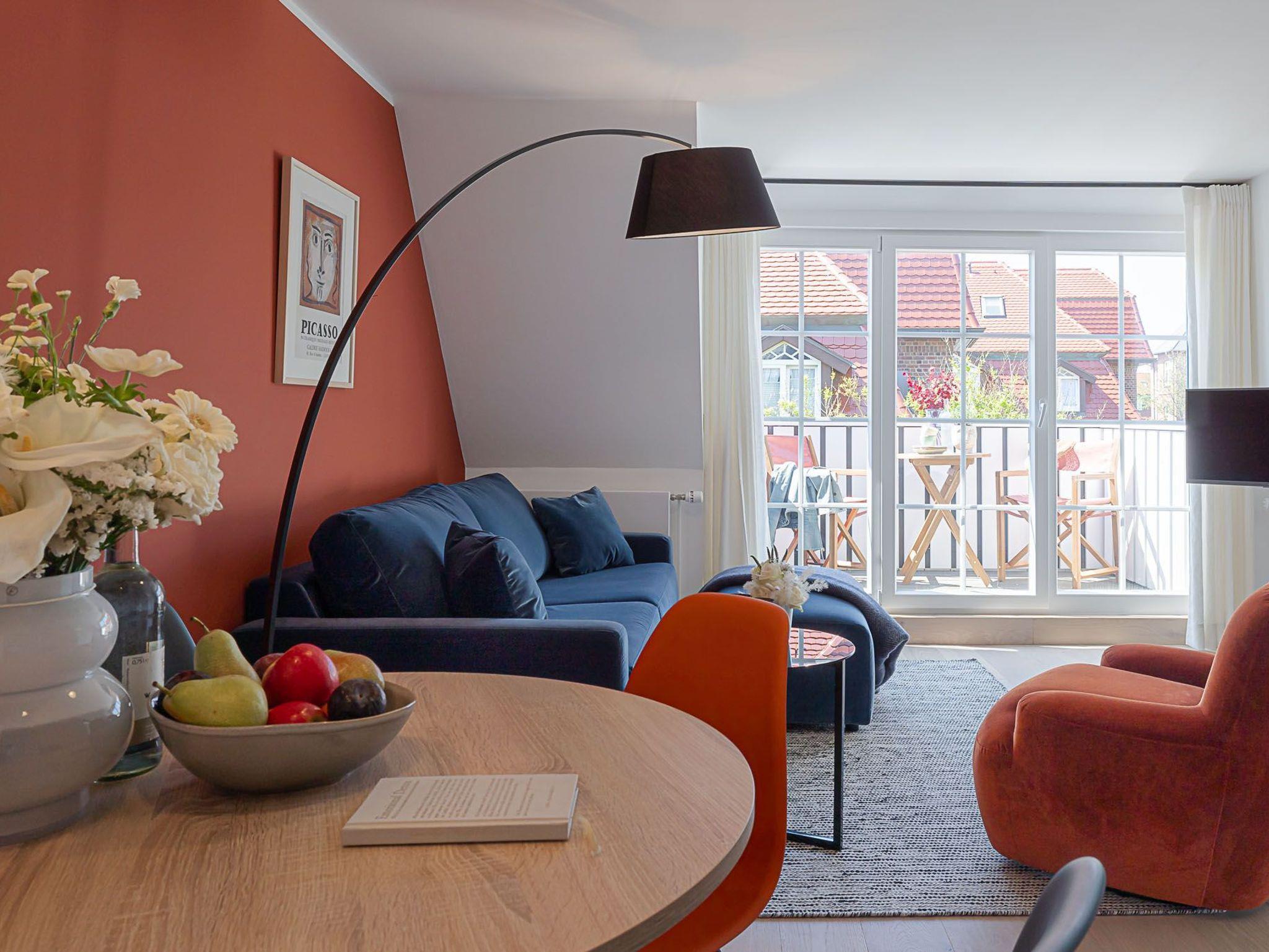 Moderne 2-Zimmerwohnung im CPTN Nicolai Resort auf Sylt mit Balkon und Zugang zu Pool und Sauna.