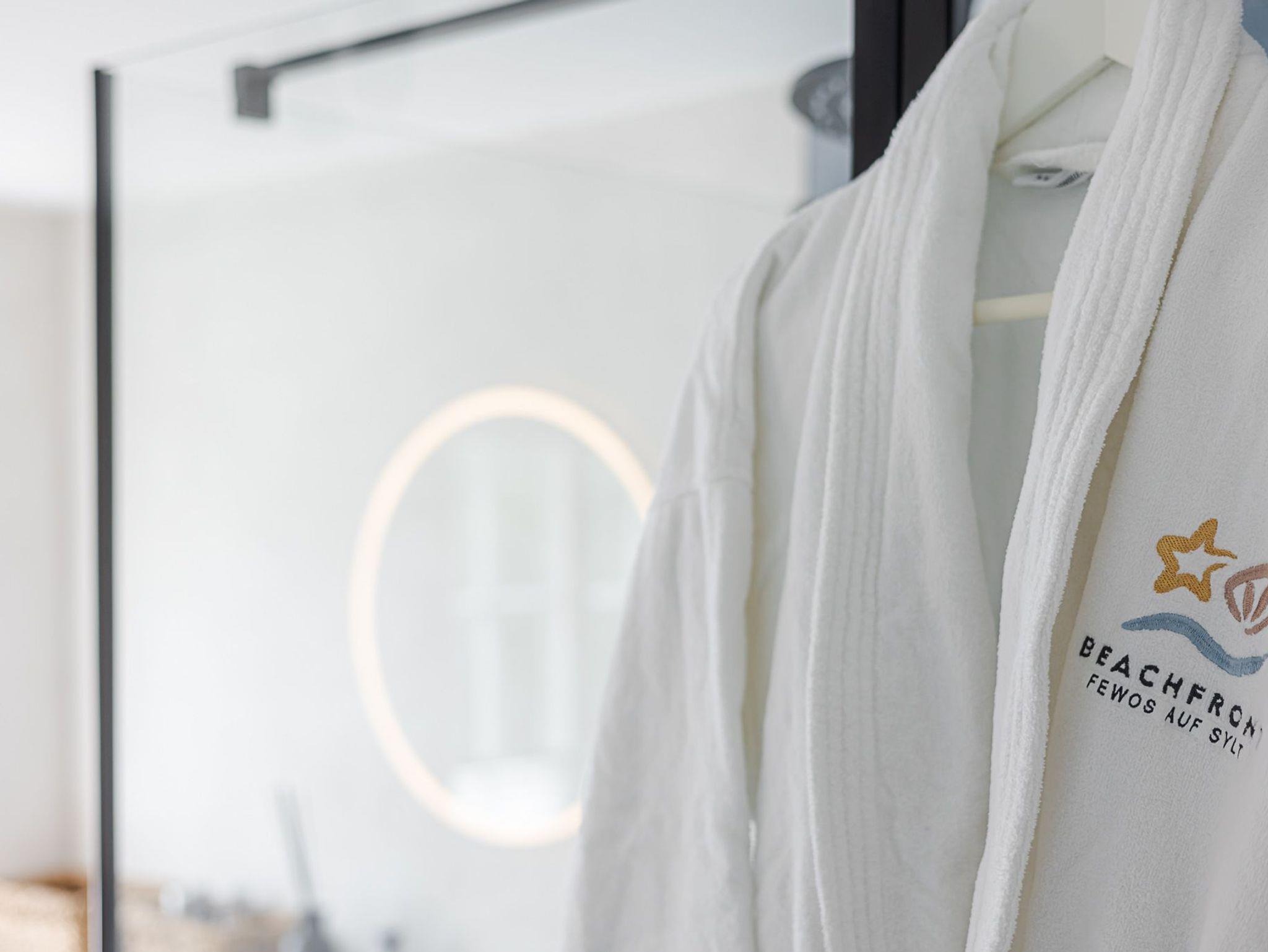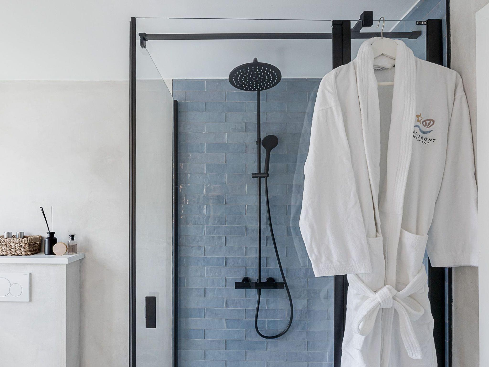 Im Bad treffen Sie auf ein Farbkonzept in Meerblau und Sand - Farben, denen Sie auch jederzeit auf der Insel begegnen. Ein echtes Highlight in Ihrer kuscheligen Wellnessoase ist die erfrischende Regendusche, unter der man auch ganz gerne mal ein wenig länger verweilt. Die Fußbodenheizung und der Handtuchwärmer sorgen an den etwas kühleren Tagen und Nächten für ein optimales Wohlbefinden. Nichts ist schließlich schlimmer, als im Bad zu frieren!