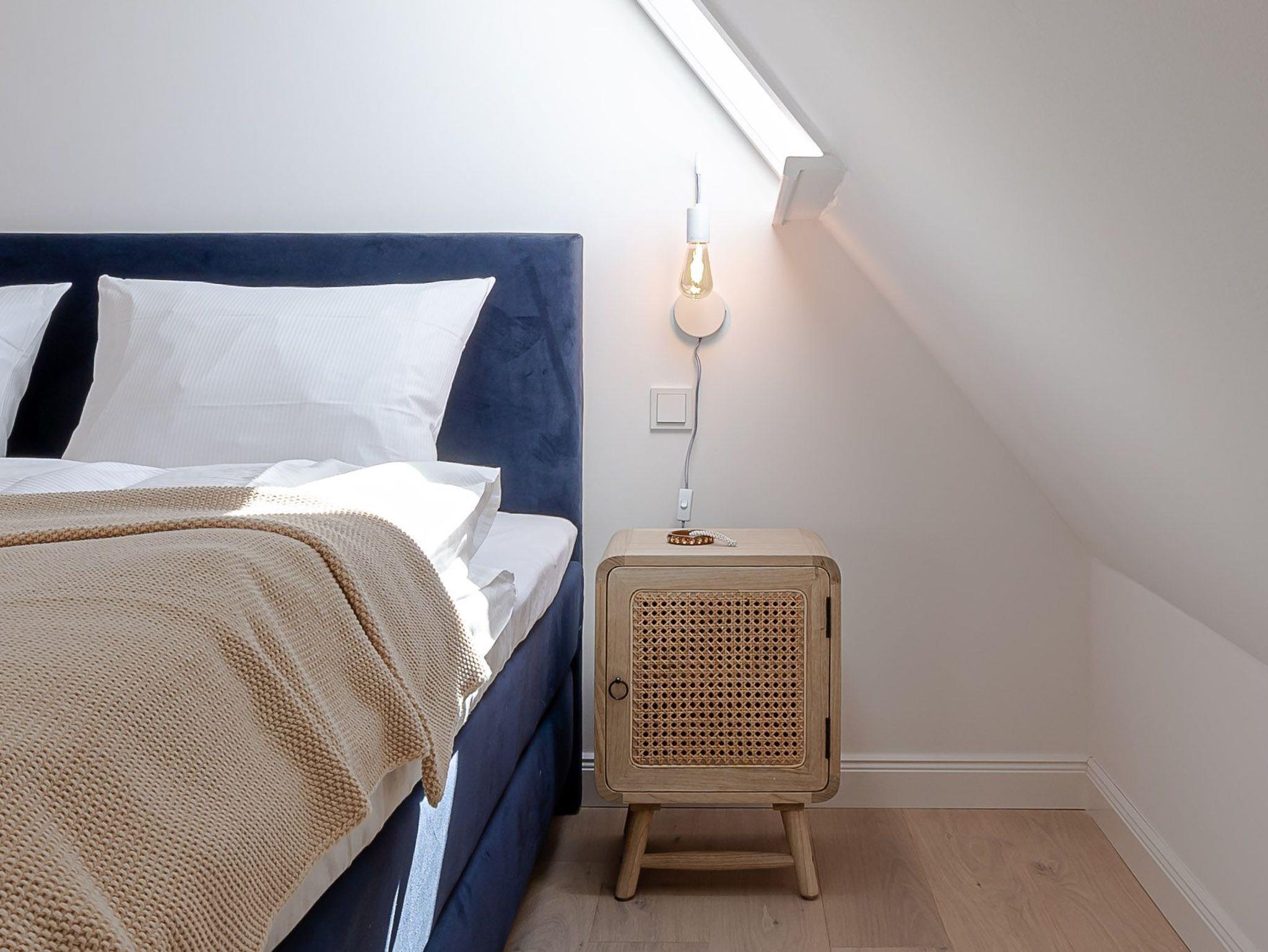 Wenn die Nacht kommt, können Sie sich auf Ihr Oberdeck zurückziehen. Hier befindet sich Ihr Schlafzimmer, das über die Treppe erreichbar ist. Erwartet werden Sie dann dort mit einem komfortablen Boxspringbett, welches sich dem Körper hervorragend anpasst und somit für einen erholsamen Schlaf sorgt.