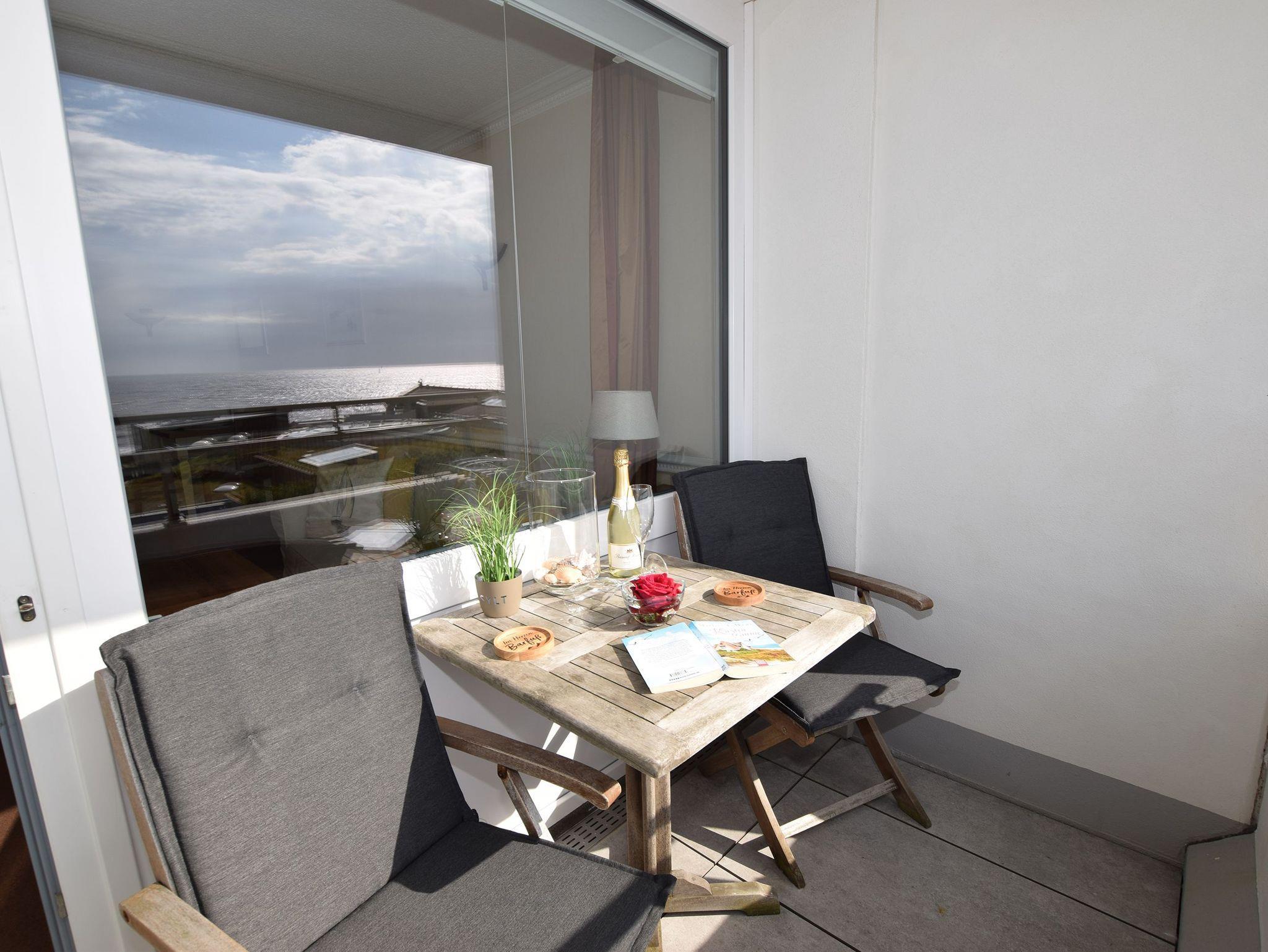 Schicke 1-Zimmer-Nichtraucher-Ferienwohnung (ca. 25 qm) in der 6. Etage (letzte Etage zu Fuß) zur Seeseite mit Westloggia und herrlichem Meerblick (Nachmittagssonne mit Balkonmöbeln und Auflagen) für max. 2 Personen.