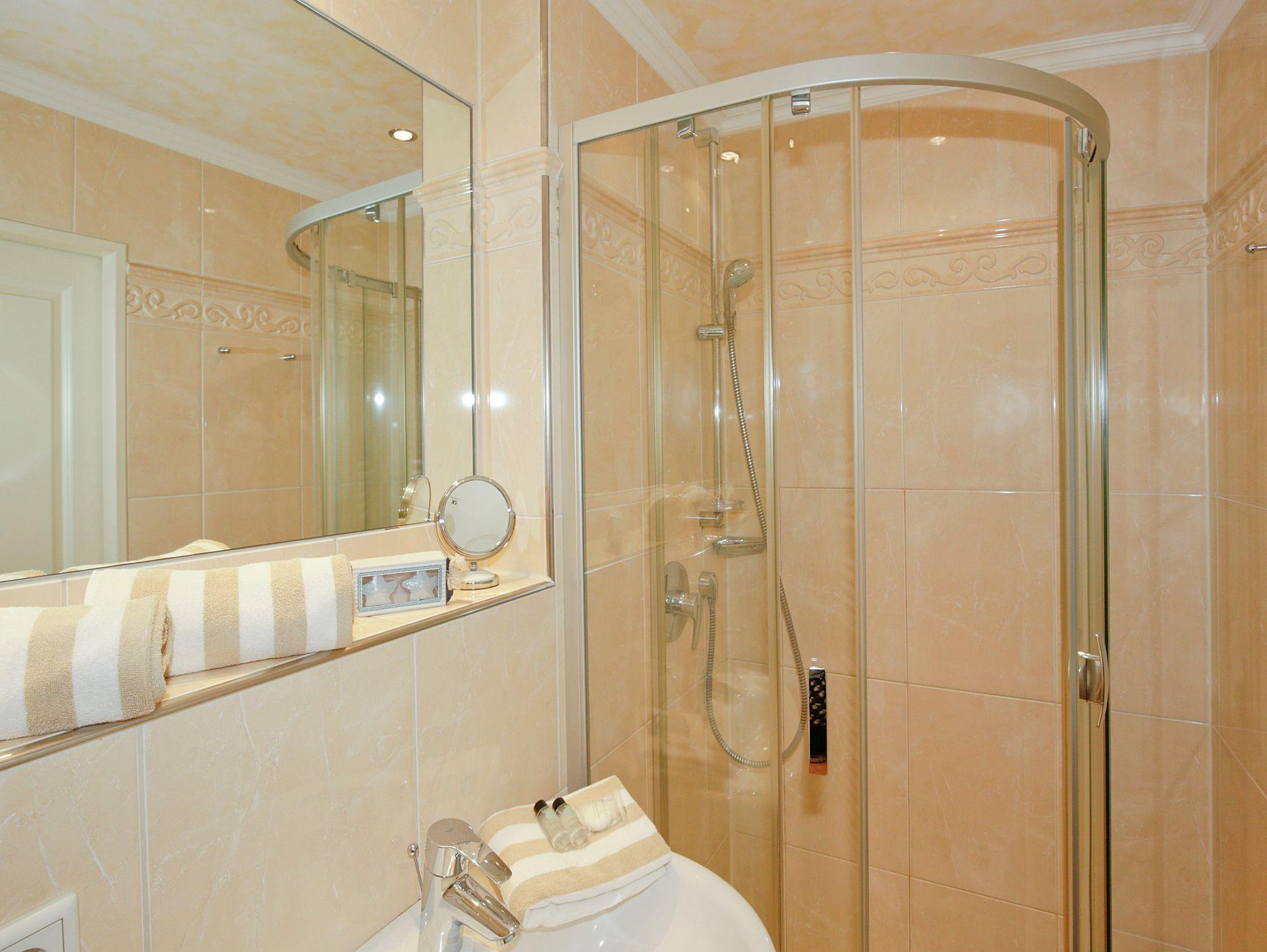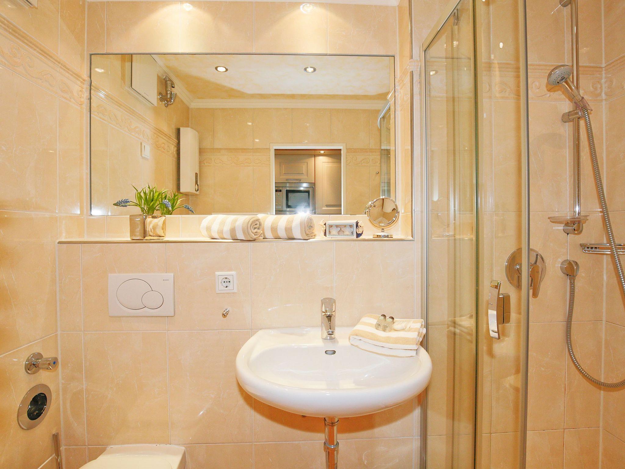 Im Bad befinden sich eine Dusche, ein WC, ein Waschtisch und ein Fön.