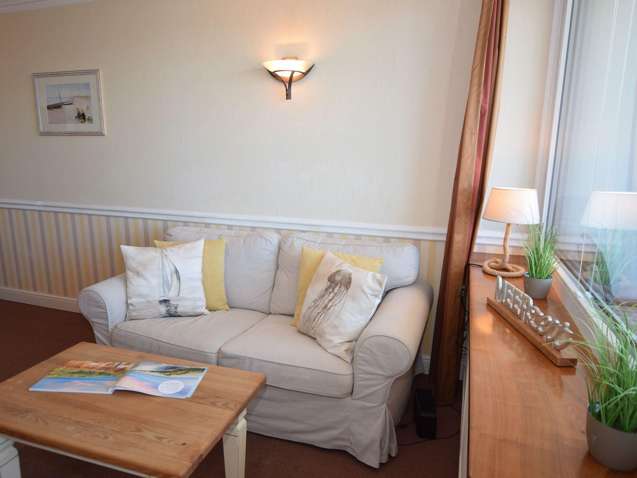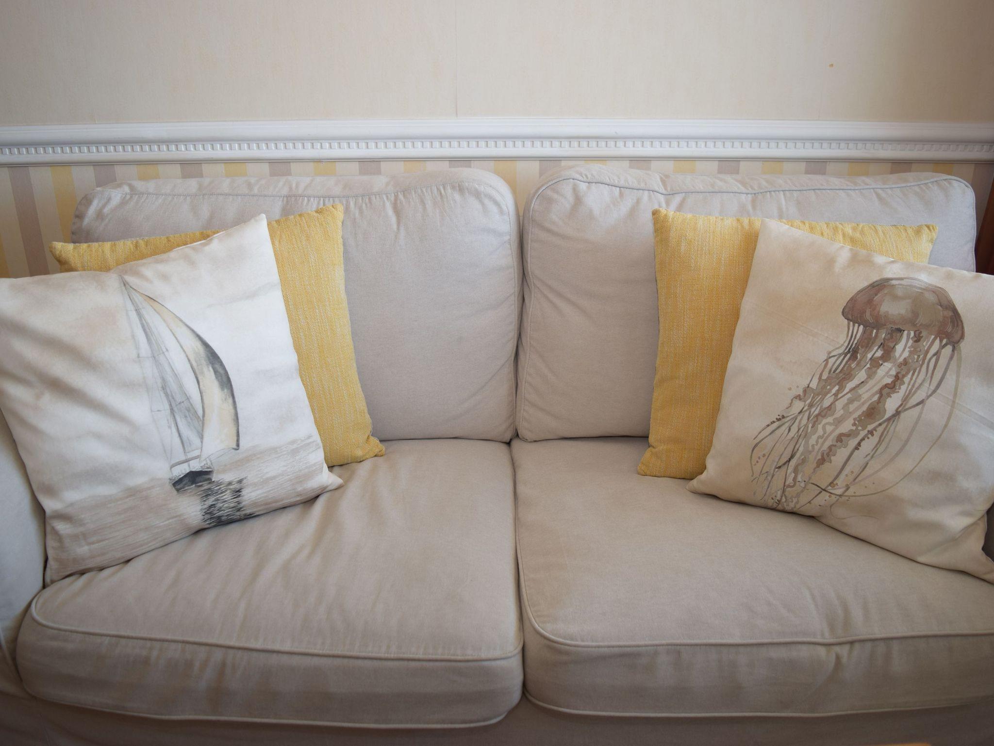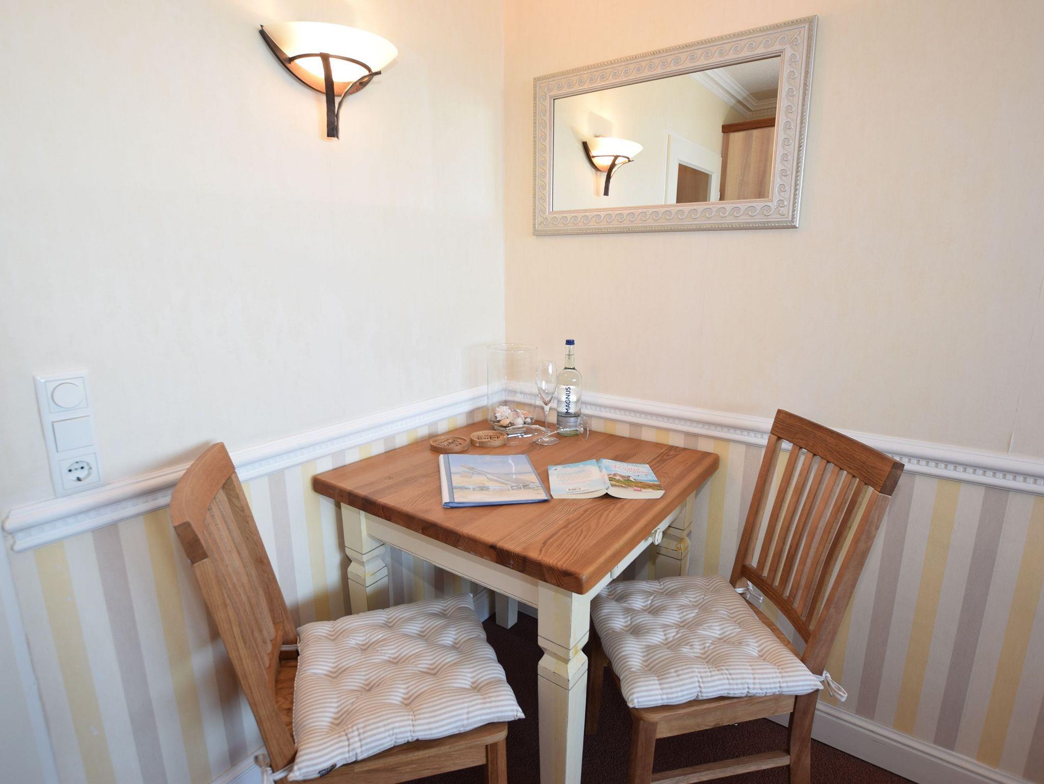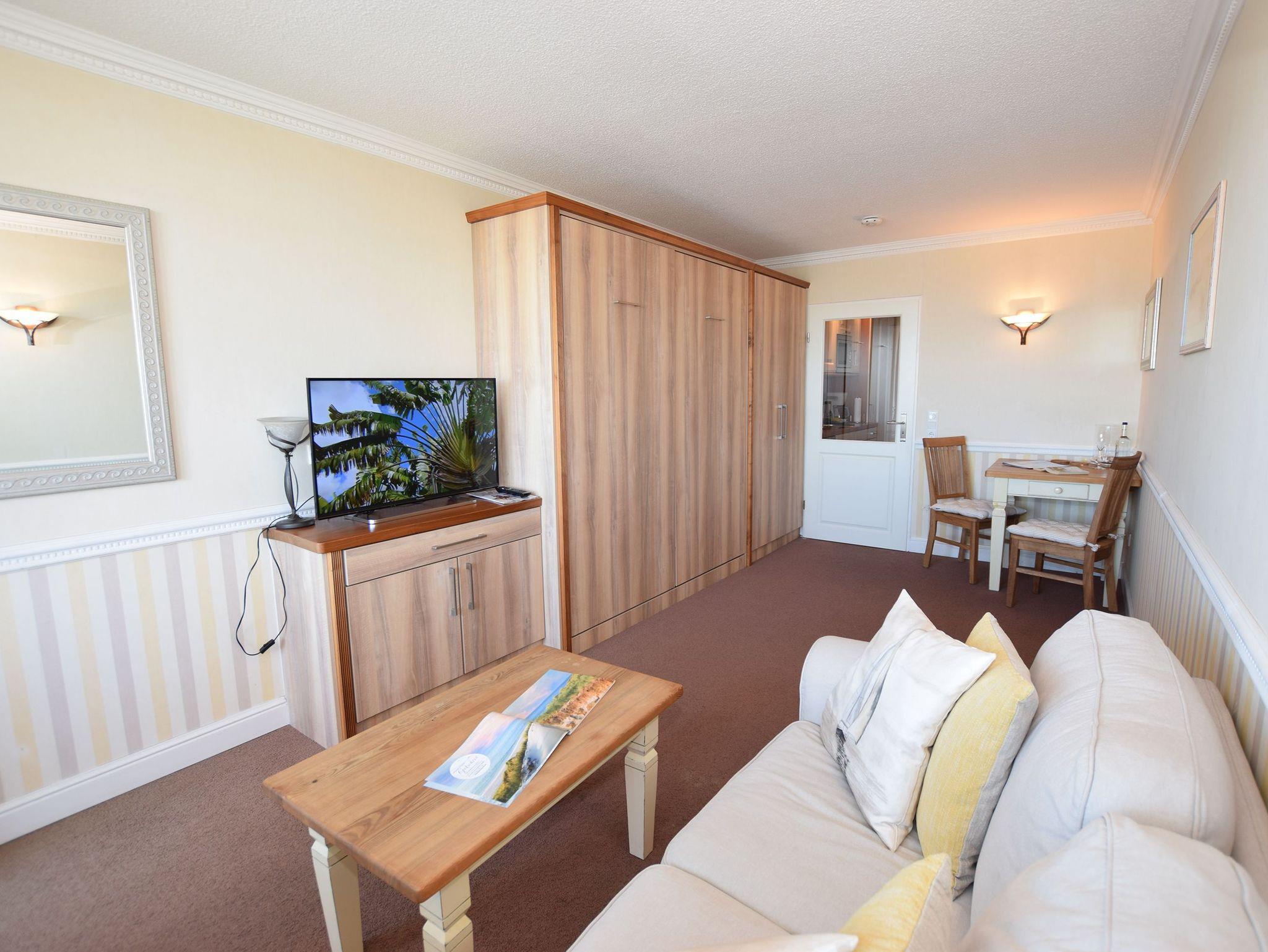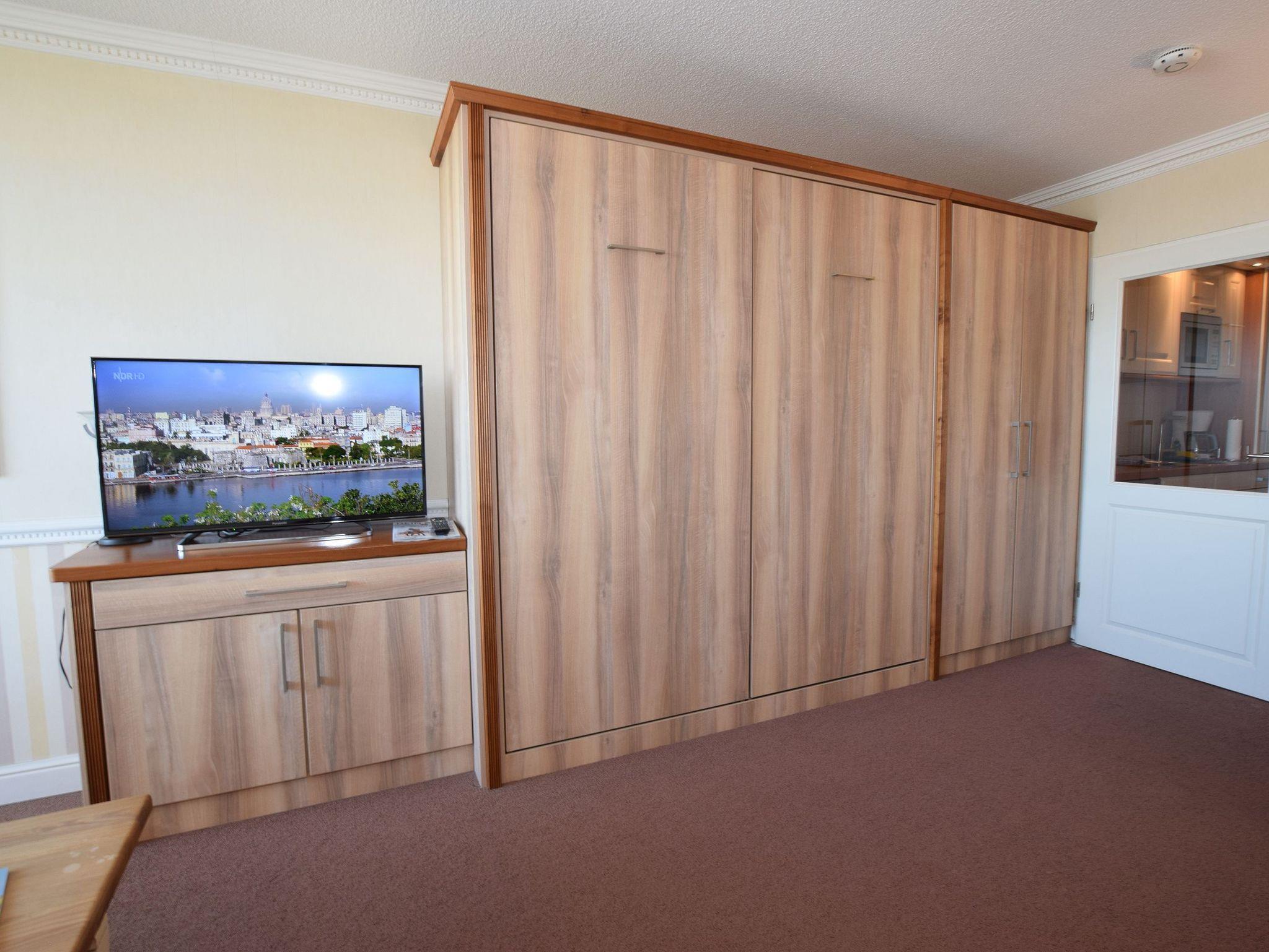 Der gemütliche Wohn-/Schlafraum besteht aus einem 2-Sitzer-Sofa, einem Sessel, einem Essplatz, einem Doppelschrankbett (einzeln klappbar), Flachbild-TV. Die Küchenzeile hat ein Induktionskochfeld, einen Geschirrspüler, eine Mikrowelle und einen Kühlschrank. Kaffeemaschine, Wasserkocher und Toaster gehören zur Grundausstattung.
