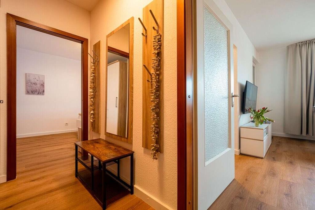 50 qm Apartment für 2 P, OG, Nichtraucher, keine Haustiere 2 Zimmer, Küche, Bad, Flur und Südbalkon, kostenloser eigener PKW-Stellplatz?? voll ausgestattete separate Küche, Festnetz-Wandtelefon helles, lichtdurchflutetes Wohnzimmer mit 50’’ Smart-TV, Digitalradio, schnelles Glasfaser-Internet und WLAN, gemütliche Couch + TV-Sessel, Esszimmer-Sitzbereich, Steckdosen reichlich vorhanden Schlafzimmer in Hotelqualität: 50’’ Smart-TV, 180 cm x 200 cm Doppelbett mit Bettwäsche, gr. Kleiderschrank modernes Bad mit gr. bodengleicher Dusche mit gemauertem Sitz, gr. beleuchteter Spiegel, Kosmetikspiegel, Duschtücher überdachter möblierter Südwest-Balkon mit Weitblick Fahrradkeller, Waschmaschine + Trockner im Souterrain
