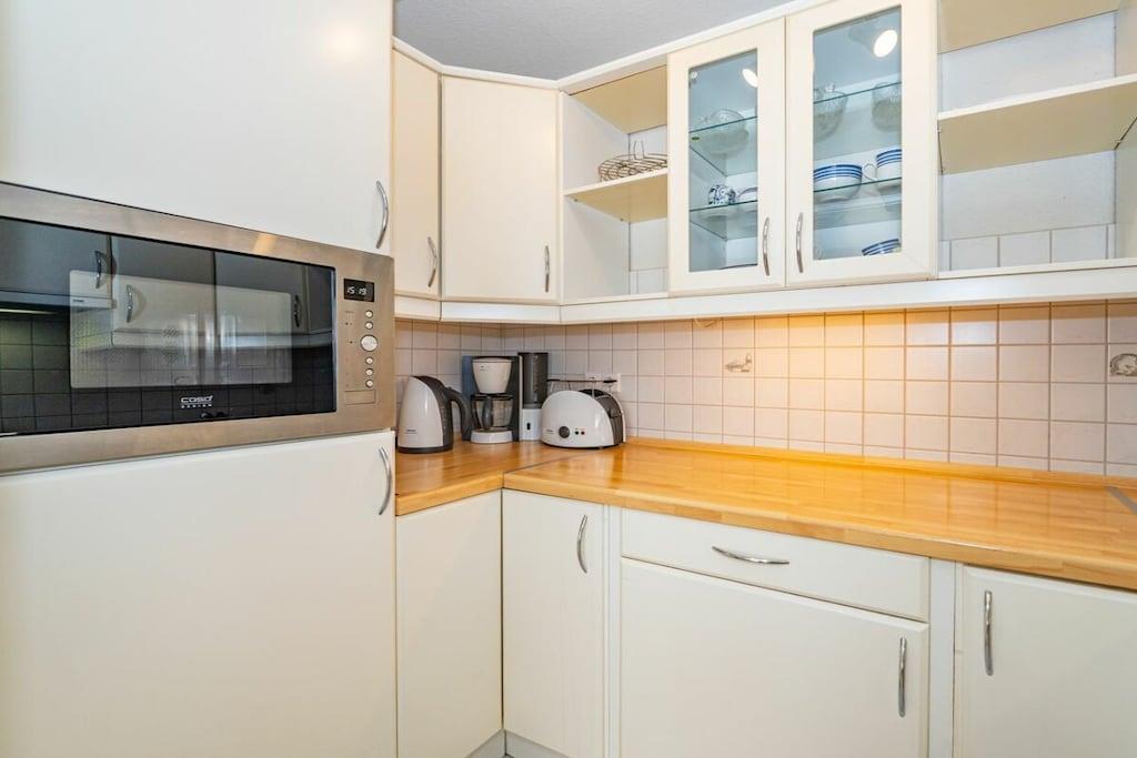, Wohnzimmer(, , TV, CD-Spieler), Küche(, Kochnische, Esstisch, Wasserkocher, Toaster, Kochherd, Kaffeemaschine, Backofen, Mikrowelle), Schlafzimmer(Doppelbett), Badezimmer(, Toilette, Dusche, Waschbecken), Internet, Balkon(Gartenmöbel), Heizung, Parkplatz