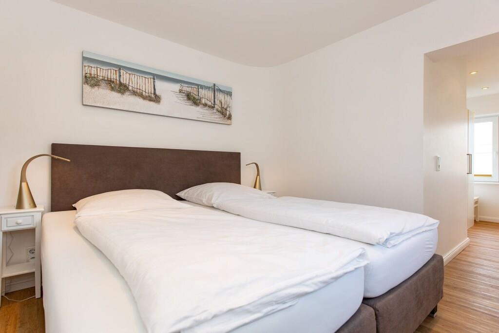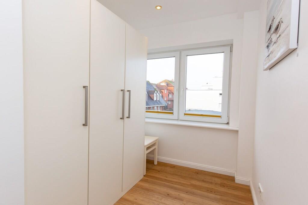 Sie wohnen in einem schönes 2 Zimmer Appartement,1 Etg., perfekt um die schönsten Tage im Jahr am Meer zu verbringen. Der helle gemütliche Wohnbereich lädt direkt zum Entspannen ein. Im Wohnzimmer befindet sich ein gemütliches Sofa, welches optional auch zum Bett umgebaut werden kann. Das Schlafzimmer ist mit einem großen 180x200 Boxspring Bett ausgestattet. Angrenzend am Schlafzimmer, befindet sich dann noch das Ankleidezimmer. Das Badezimmer verfügt auch über ein Fenster.