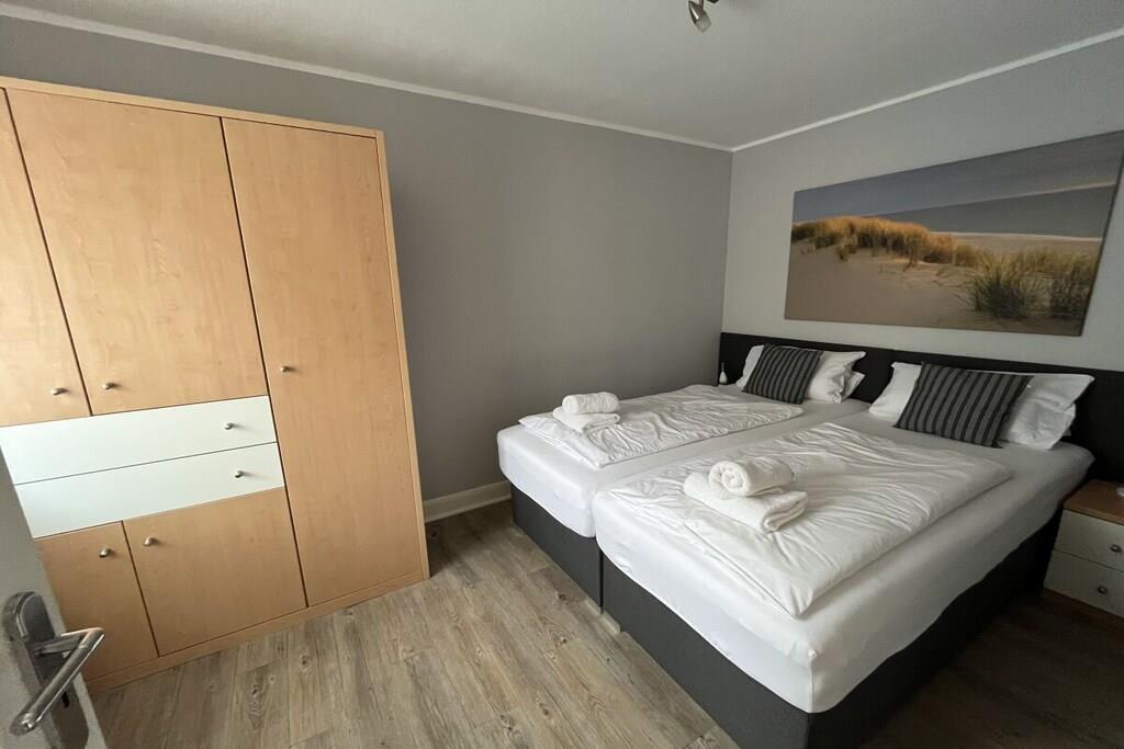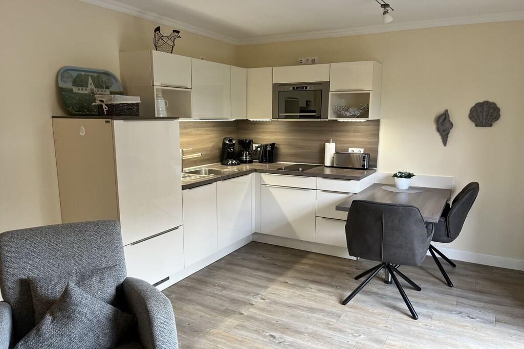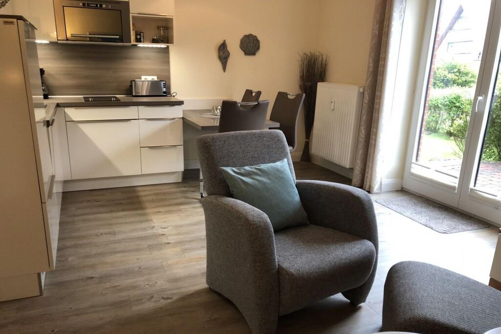 Ein separater Eingang, wie auch ein direkter Zugang zur Terrasse gehören zur Ferienwohnung. Im Außenbereich (Terrasse) stehen Ihnen ein Strandkorb, Tisch und Gartenstühle mit Auflagen zur Verfügung (April-Oktober). (www.nordsee-voigt.de) Ein Gasgrill ist vorOrt und kann mit genutzt werden. Die Ferienwohnung ist gemütlich eingerichtet und gut ausgestattet. Schlafzimmer: Boxspringbett, Kleiderschrank, Nachtschränke, Verdunklungsrollo Wohnraum: 1 voll ausgestattete Küchenzeile mit E-Geräten und Geschirr. Des Weiteren finden Sie hier ein (Schlaf)-Sofa, Sessel, Hocker und Couchtisch, 1 Leselampe und 1 Schrankwand mit Fernseher (Flachbildschirm). CD-Player und Radio Kinderhochstuhl können wir Ihnen gerne kostenfrei zur Verfügung stellen. Badezimmer: WC und Dusche, Wasch-Trockner