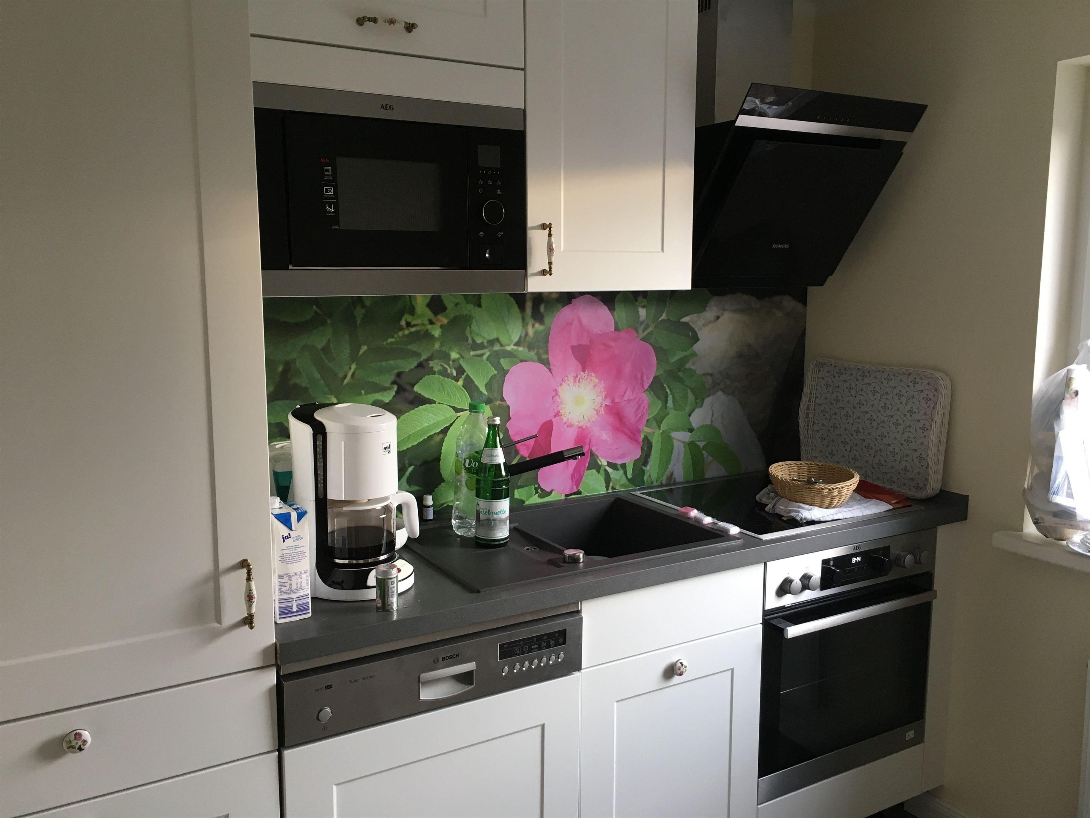 Sehr gut ausgestattete helle Küche mit Spülmaschine, 4-Plattenherd, Backofen, verschiedene Kaffeemaschinen , Wasserkocher, Eierkocher und Mikrowelle, Toaster Essplatz am Fenster in der Morgensonne .
