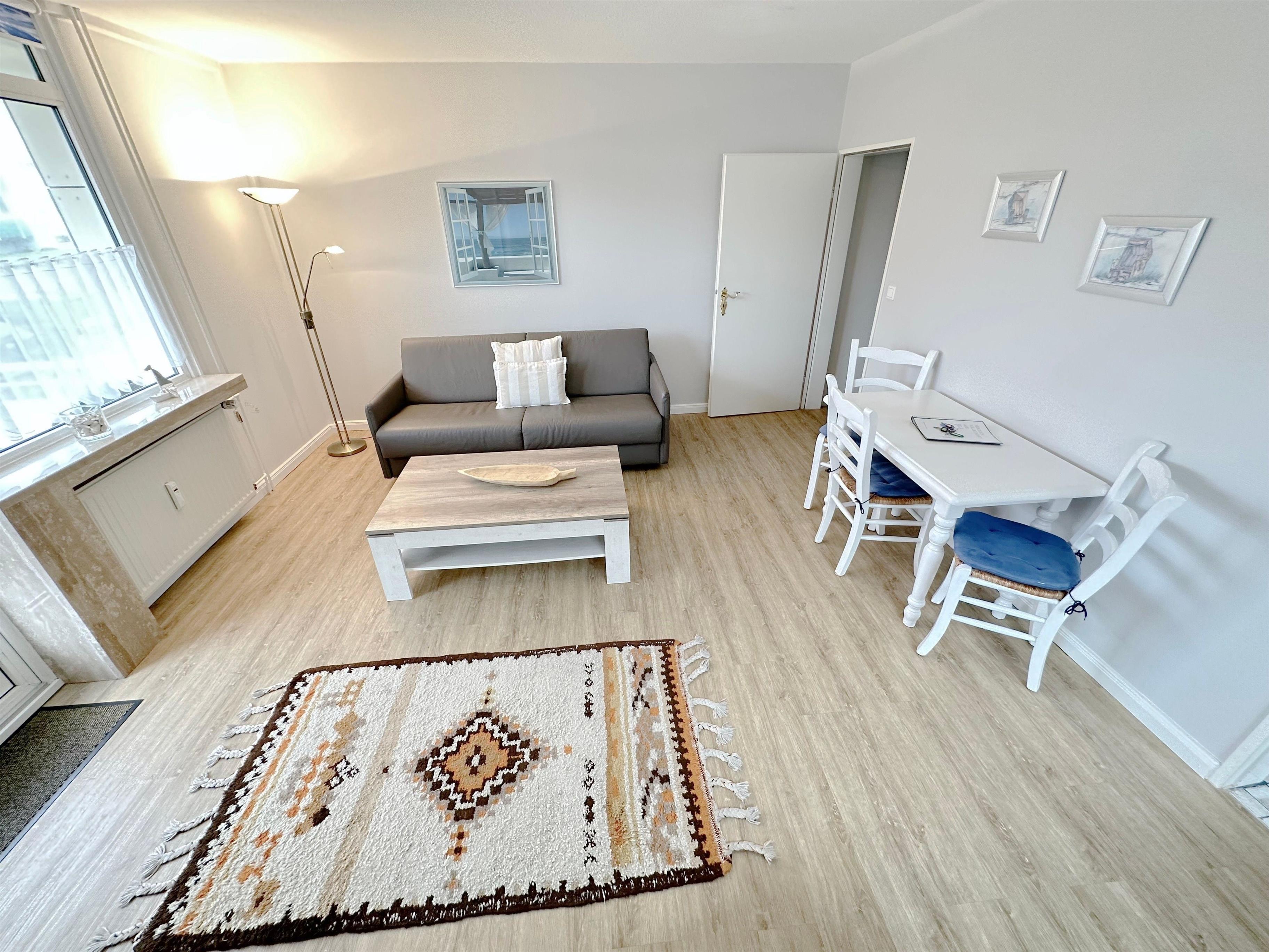 Der lichtdurchflutete Wohnbereich verfügt über eine bequeme Schlafcouch, einen LED-TV, ein Radio und eine einladende Essecke. Der Westbalkon lädt dazu ein, nach einem Tag am Strand den Sonnenuntergang zu genießen.