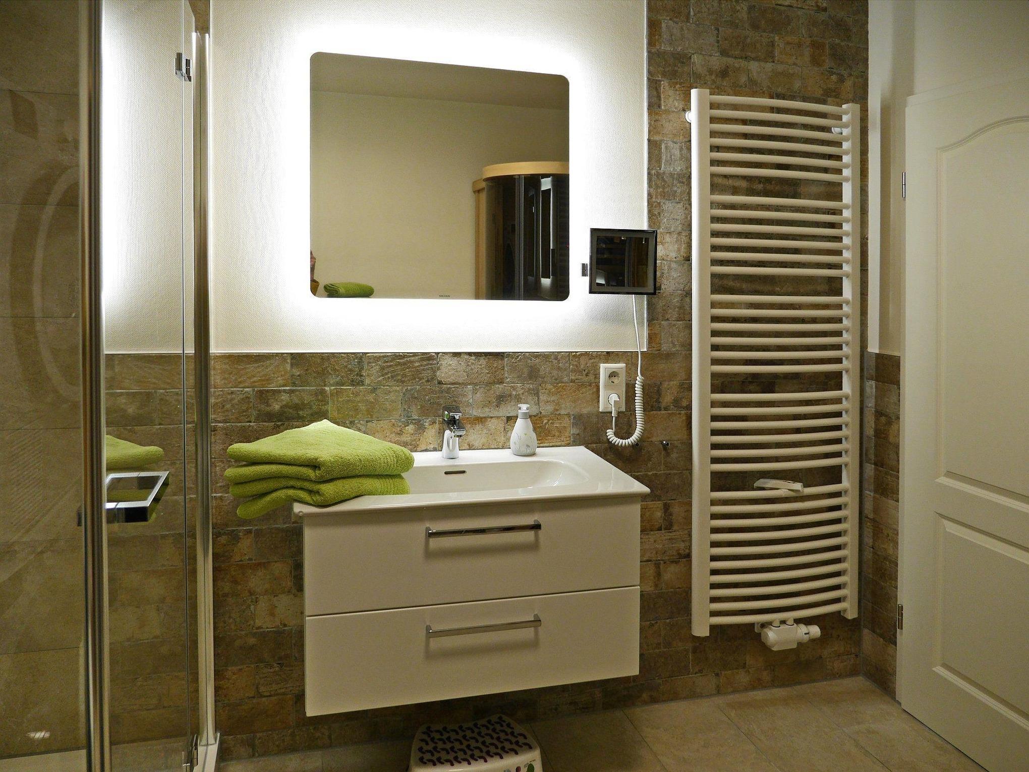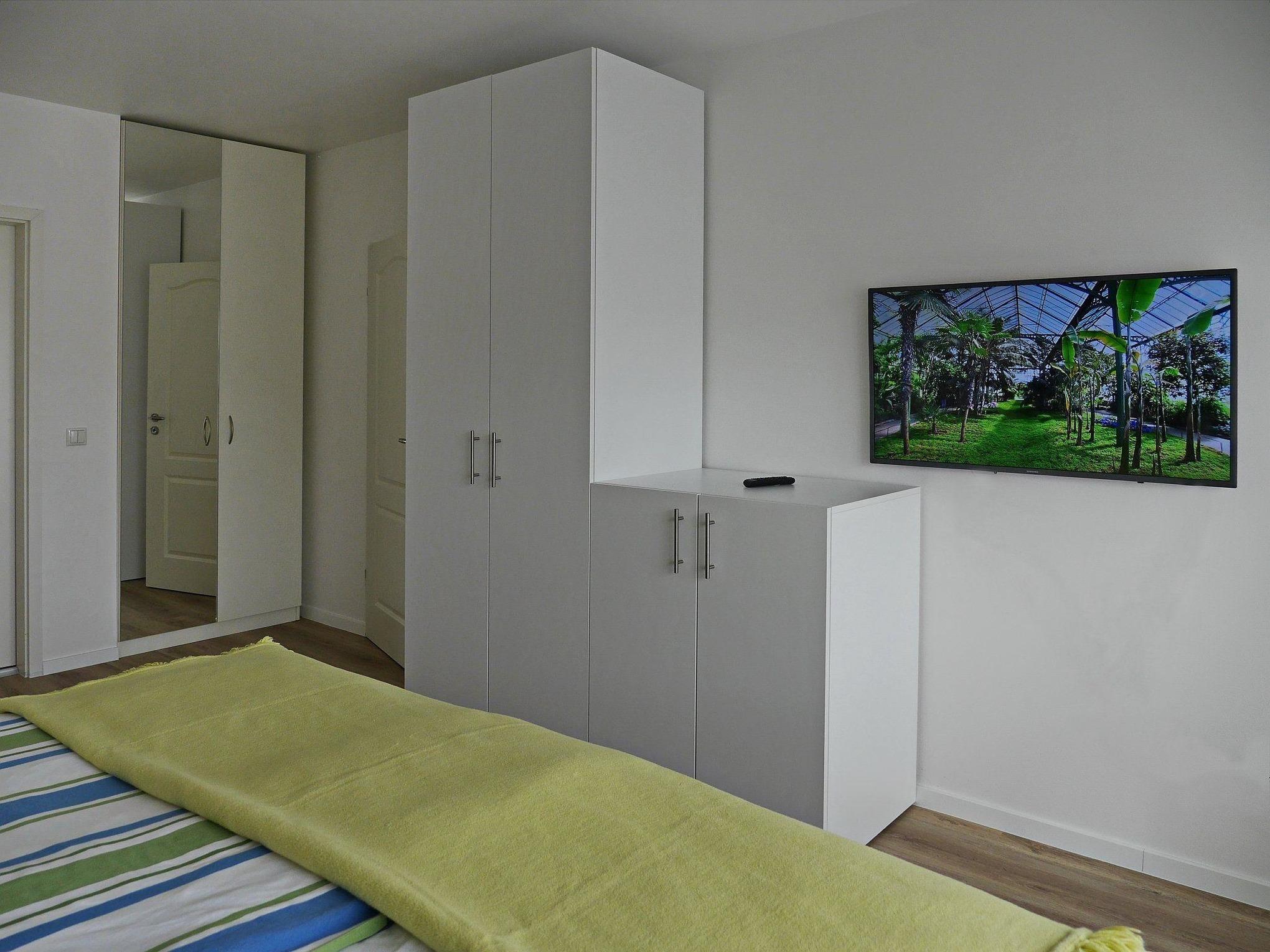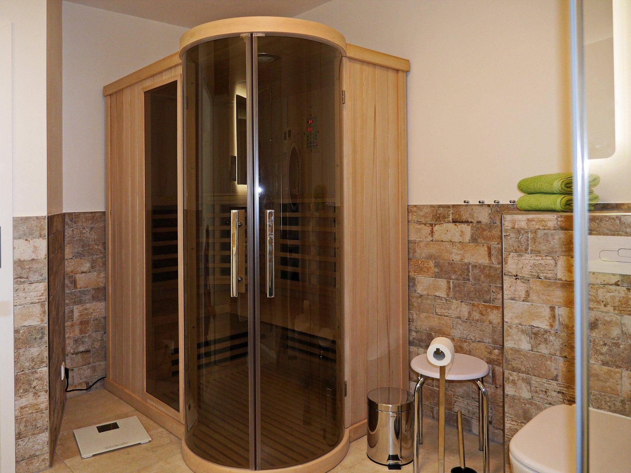 Das Schlafzimmer bietet ein bequemes Boxspringbett. Die Wohnung hat pflegeleichten Vinyl-Designboden und ein gefliestes Bad mit flacher Dusche, WC, Waschtisch und integrierter Infrarot-Sauna. Die Küche ist komplett ausgestattet, inklusive Cerankochfeld, Backofen, Mikrowelle und den wichtigsten Geräten.