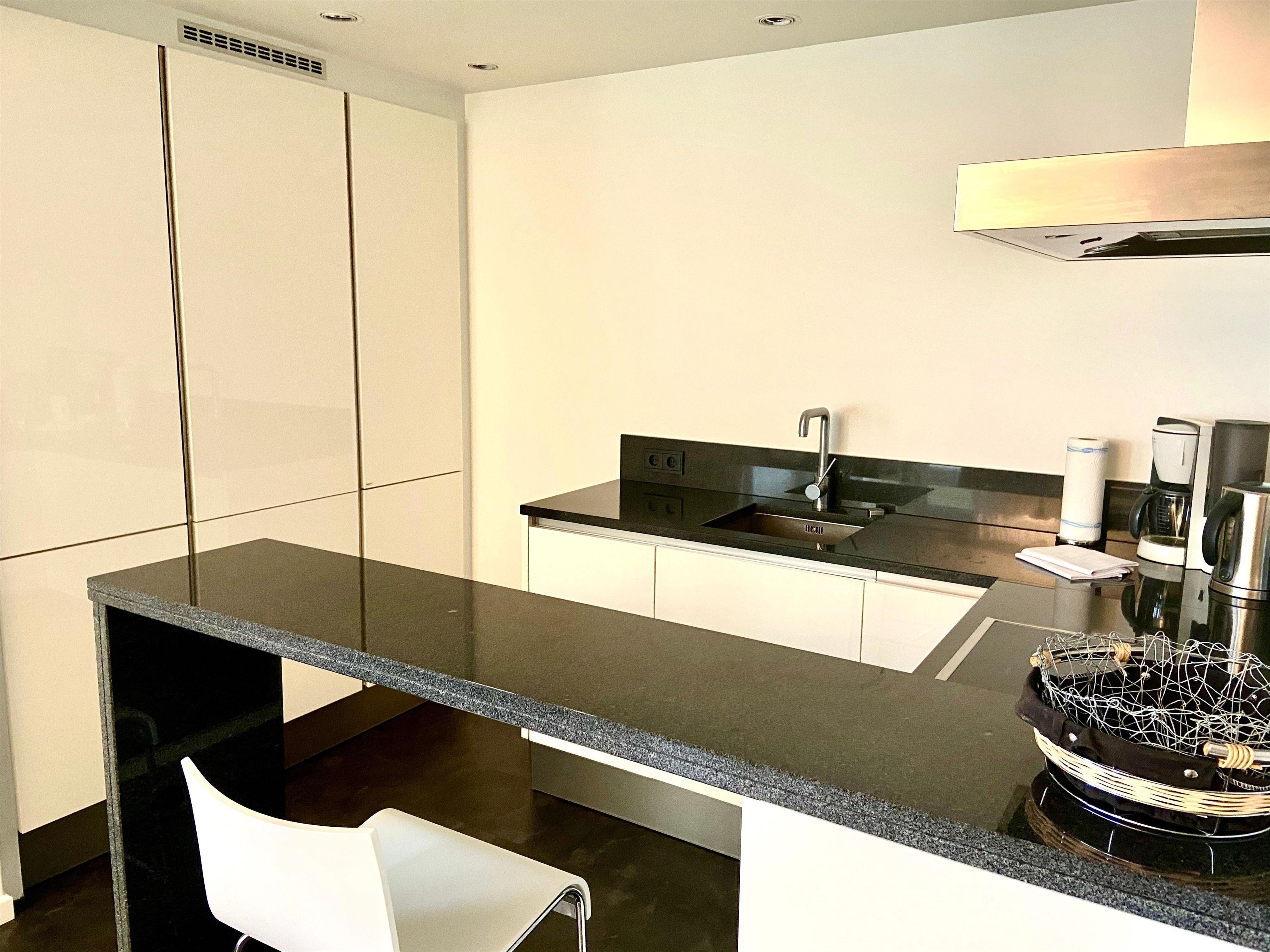 Die Küche ist modern eingerichtet, mit Geschirrspülmaschine, Backofen, 4er-Ceranfeld, Wasserkocher, Kaffeemaschine....