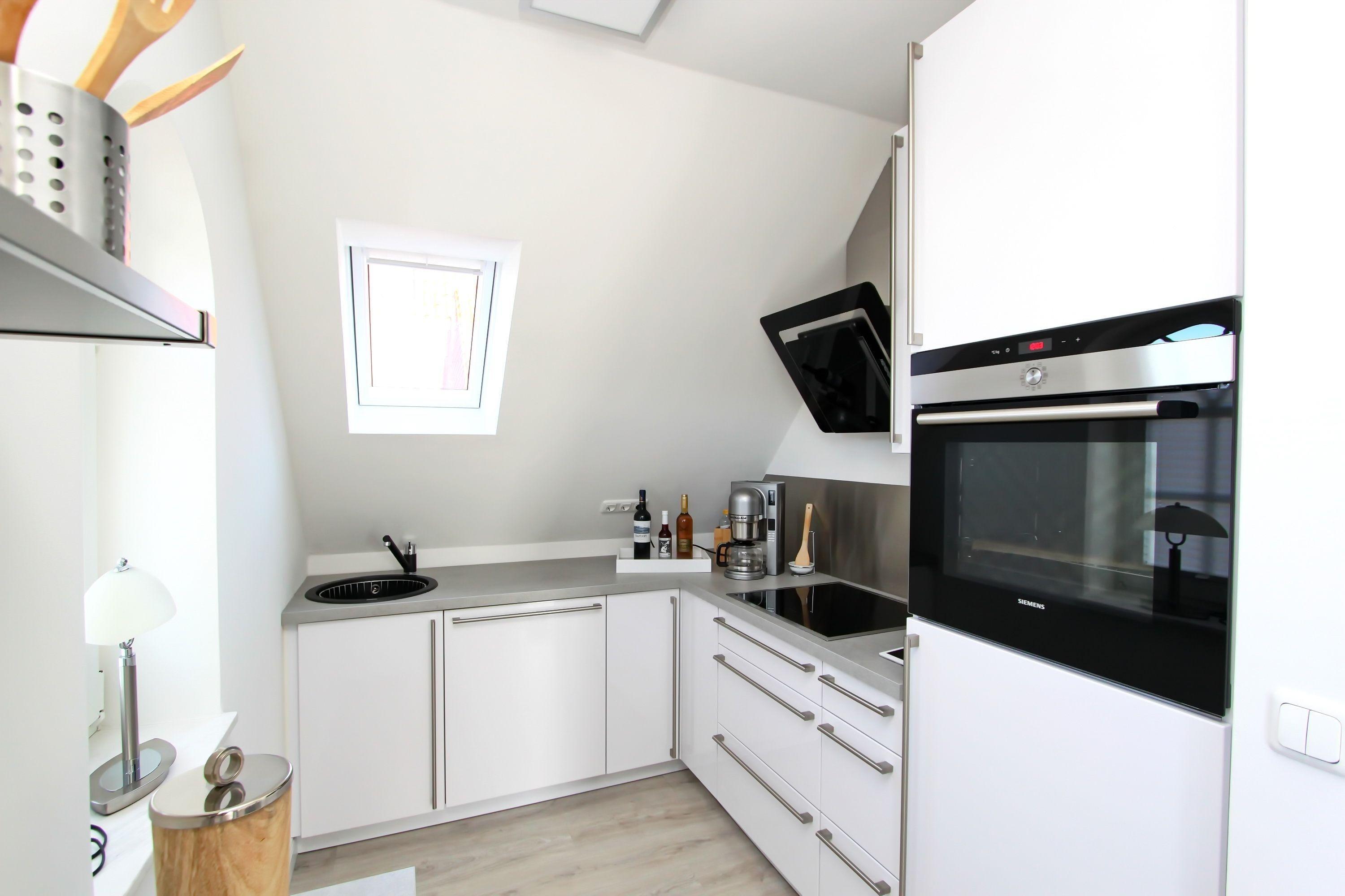Die moderne Einbauküche wurde offen gestaltet und bietet Ihnen alle Annehmlichkeiten für eine sorgenfreie Selbstversorgung. Hierzu gehören neben dem Backofen und dem Cerankochfeld auch ein Kühlschrank mit Gefrierfach und ein Geschirrspüler.