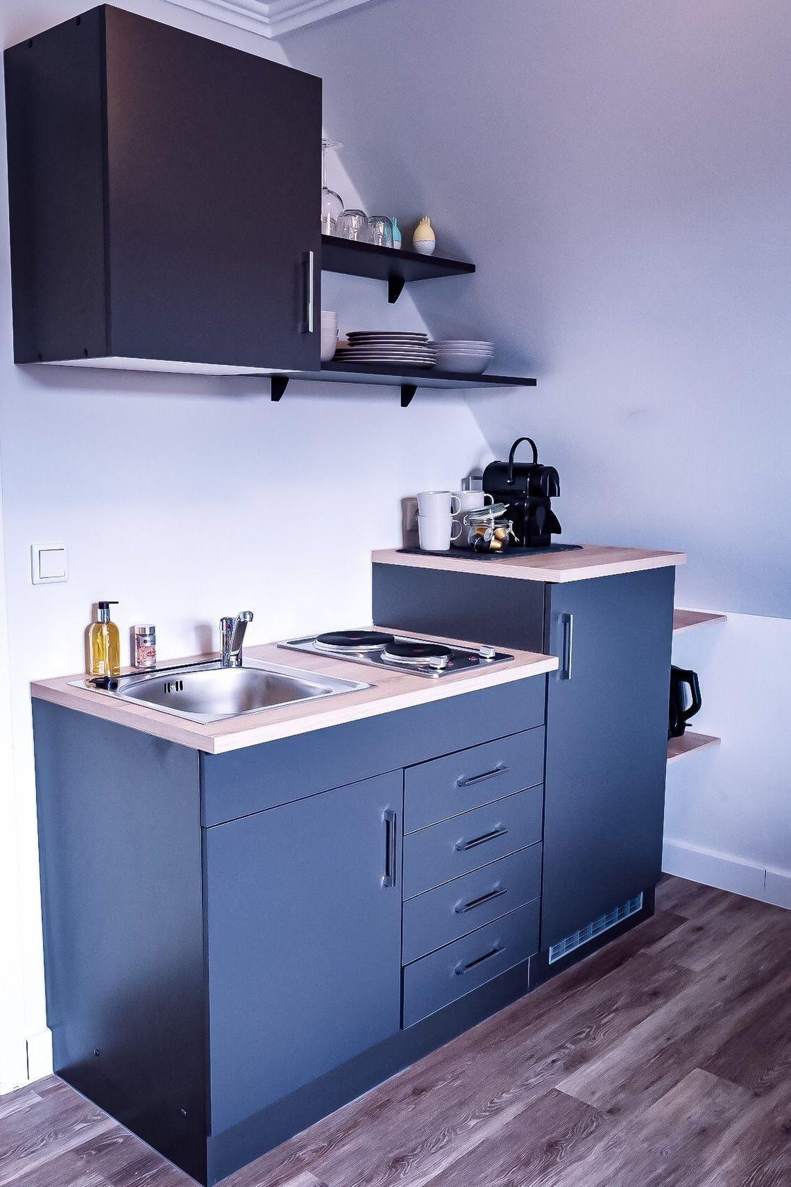 Das Apartment ist in Wohnraum mit kleiner Küchenzeile und Schlafzimmer aufgeteilt.