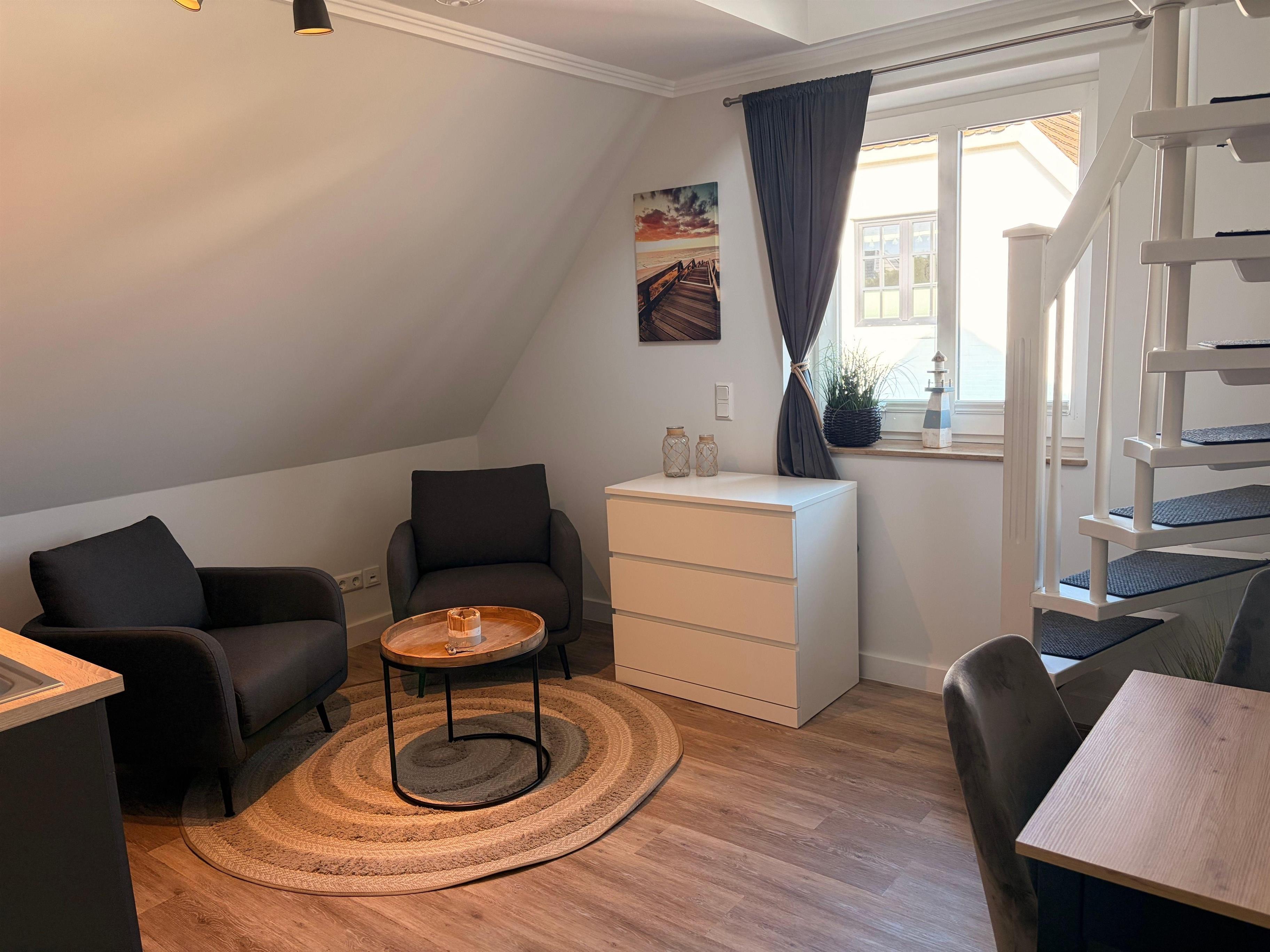 Ihr Apartment verfügt über einen Wohnraum, welcher über eine kleine, gut ausgestattete Küchenzeile für den täglichen Bedarf, einen TV und eine Sitzecke verfügt. Vom Wohnraum gelangen Sie über eine offene Treppe auf den Spitzboden, der zum Schlafzimmer ausgebaut wurde und Sie mit frischer Bettwäsche begrüßt (Bett 160x200cm). Im Duschbad mit Fußbodenheizung erwartet Sie reichlich Platz für Ihre Utensilien und frische Handtücher.