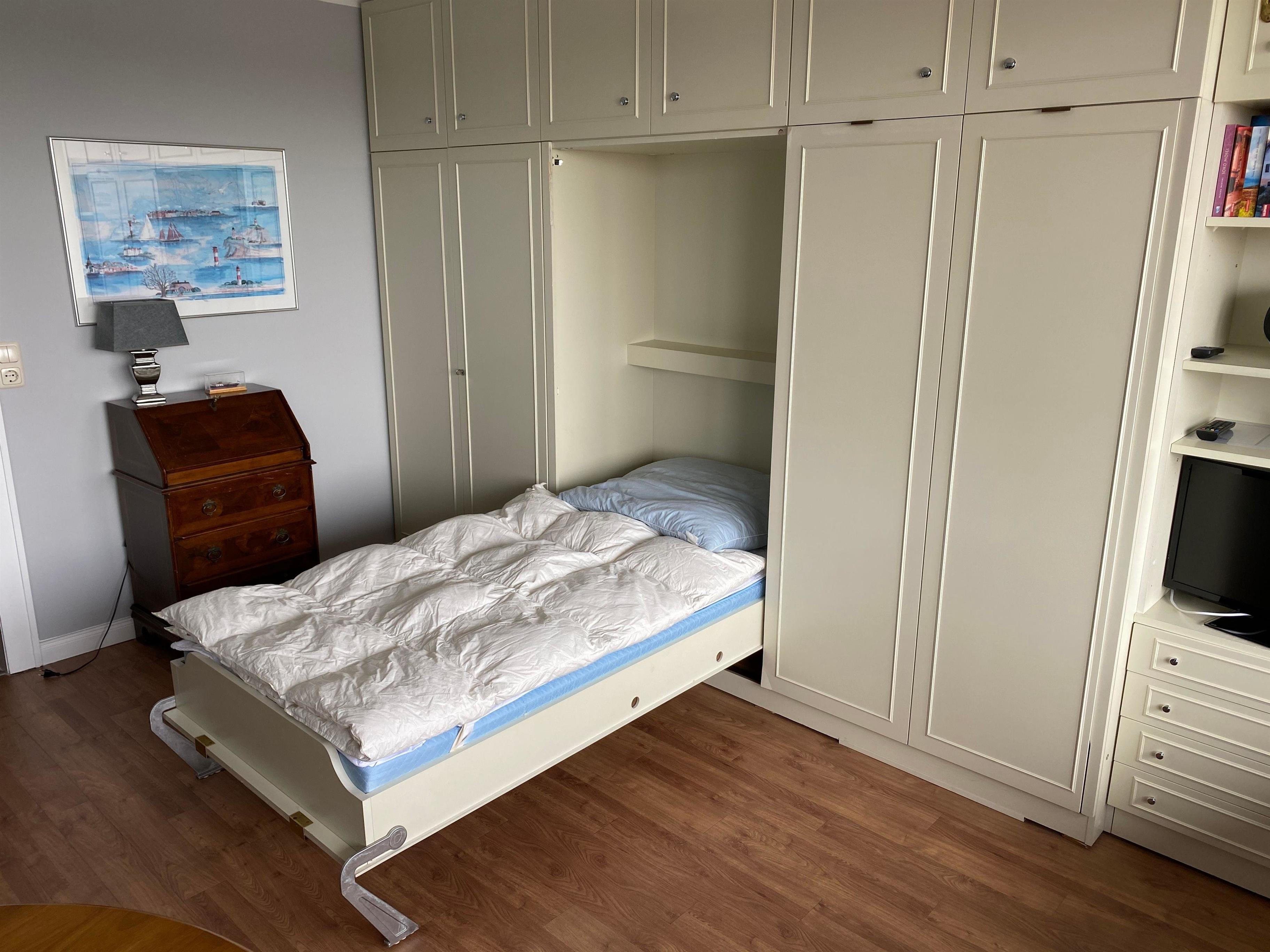 Die maritim und gemütlich eingerichtete 1-Zimmer-Wohnung verfügt über einen großzügigen Ostbalkon, perfekt geeignet für ein sonniges und windgeschütztes Frühstück. Es sind 3 Balkonstühle (mit Sitzauflagen) sowie ein Tisch vorhanden. Die Betten im Wohnbereich können aus einer Schrankwand einzeln ausgeklappt werden und ergeben zusammen ein großes Doppelbett.