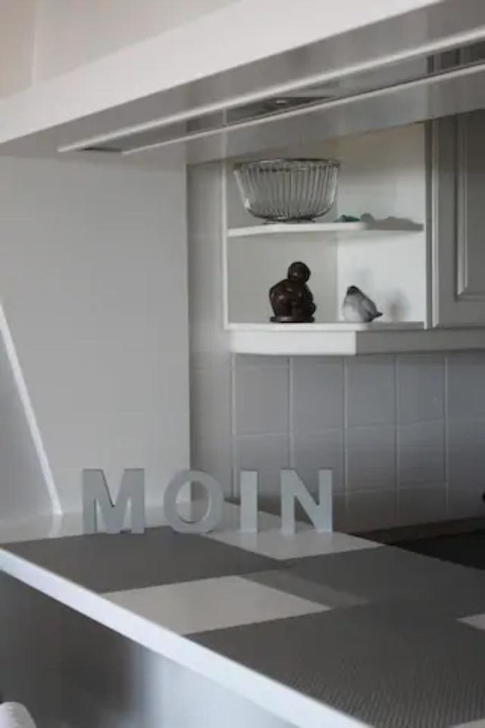 Die separate, aber dennoch offene Küche ist durch einen hellen Tresen vom Wohnbereich getrennt und bietet damit auch beim Kochen einen Blick über die Stadt Westerland. Das Vollbad verfügt über eine Badewanne und zwei Waschbecken. Darüber hinaus sind in der gesamten Wohnung viele Staumöglichkeiten vorhanden. Die vielen kleinen Lampen spenden gemütliches Licht.