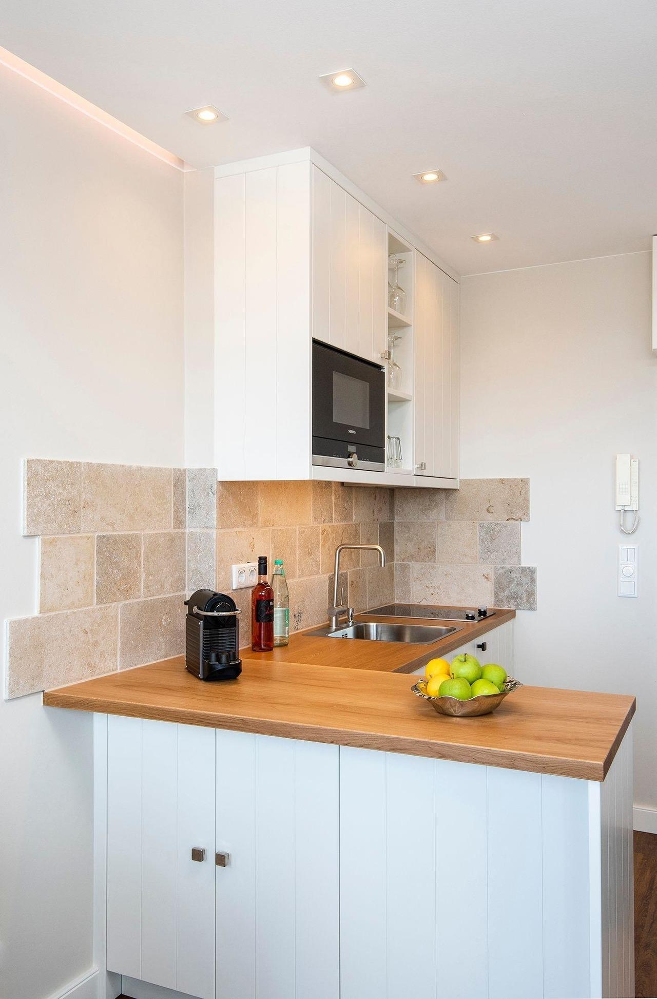 Das 1-Zimmer-Appartement ist geeignet für 1 bis 2 Personen. Das komplette Appartement wurde im Jahr 2021 Kernsaniert und mit hellen hochwertigen Tischlereinbauten versehen. Eine moderne offene Einbauküche aus dem Hause Siemens lässt kaum Wünsche offen. Diese beinhaltet 2 Platten Herd, Spülmaschine, Mikrowelle, Kühlschrank, Kaffeemaschine, Toaster und Wasserkocher. Das Bad ist mit hochwertigen Natursteinfliesen, maßgefertigter Duschabtrennung aus Glas und Rain Shower Brause ausgestattet.