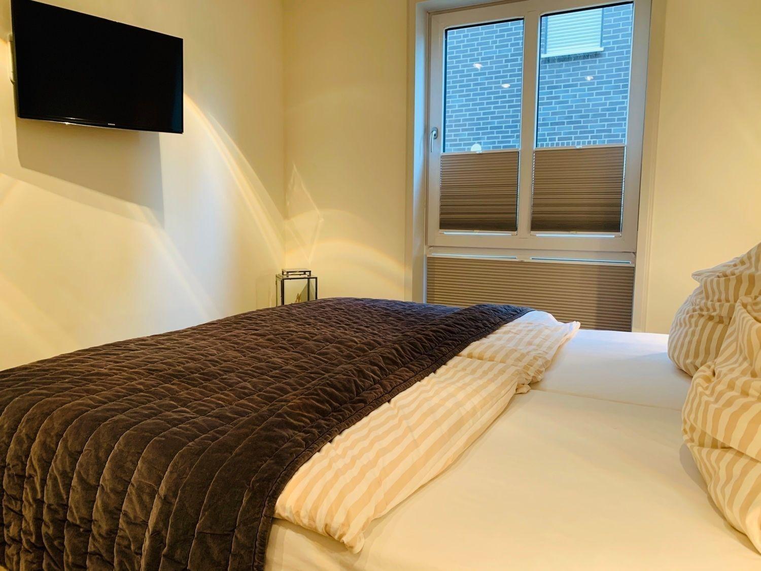 Modern eingerichtet bietet die Ferienwohnung Platz für bis zu 4 Personen. Alle Räume befinden sich auf einer Ebene, erreichbar über das gepflegte Treppenhaus. Vom Flur aus gehen die Schlafzimmer mit Doppelbett, das Bad und das Wohnzimmer mit Terrasse ab. Der Küchenbereich ist als moderne Küchenzeile in das Wohnzimmer integriert.