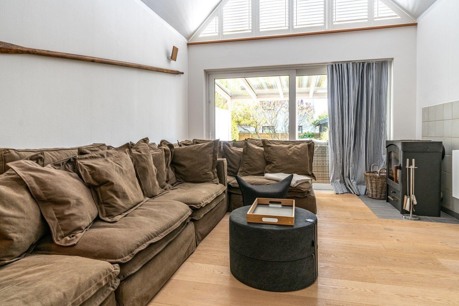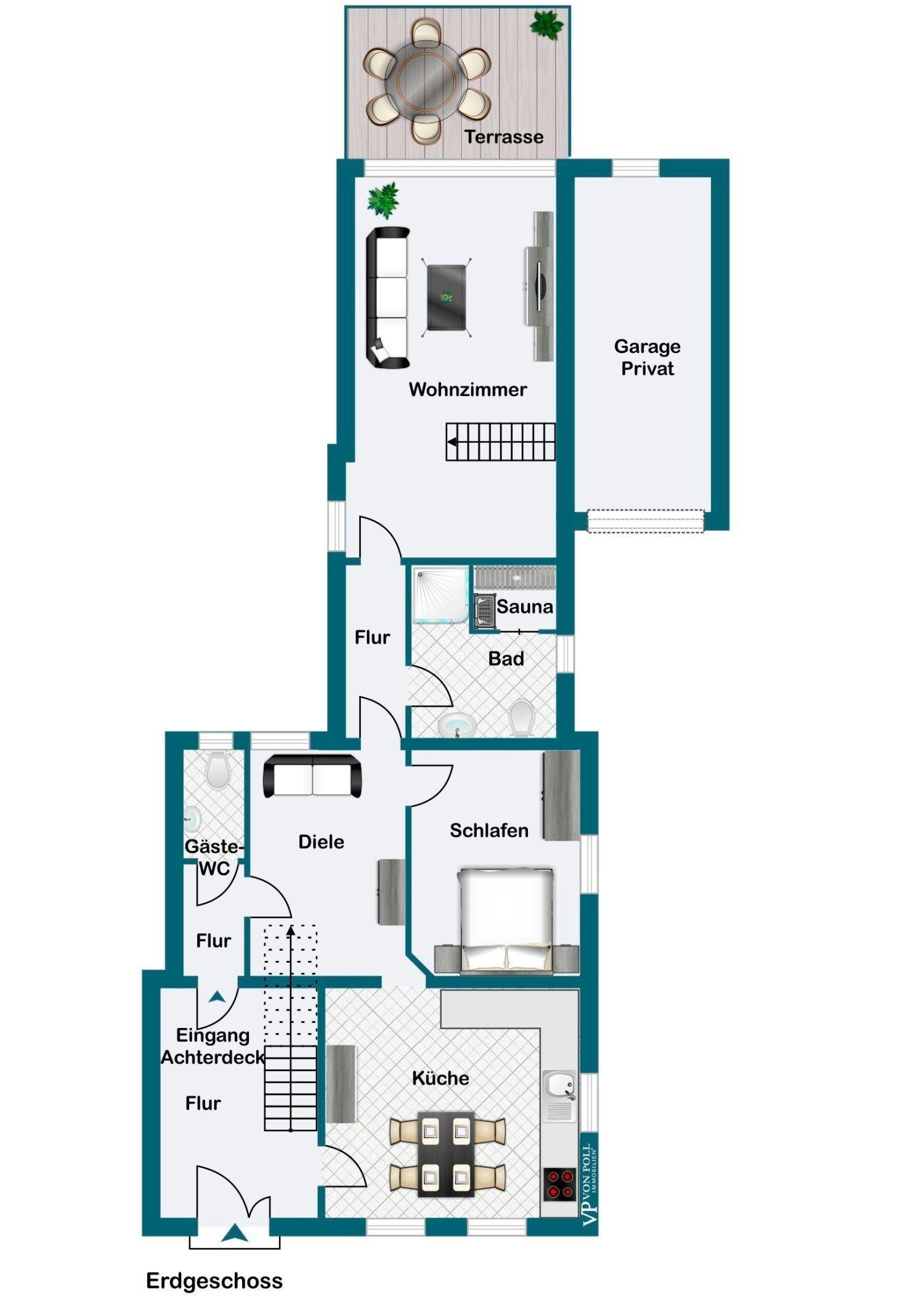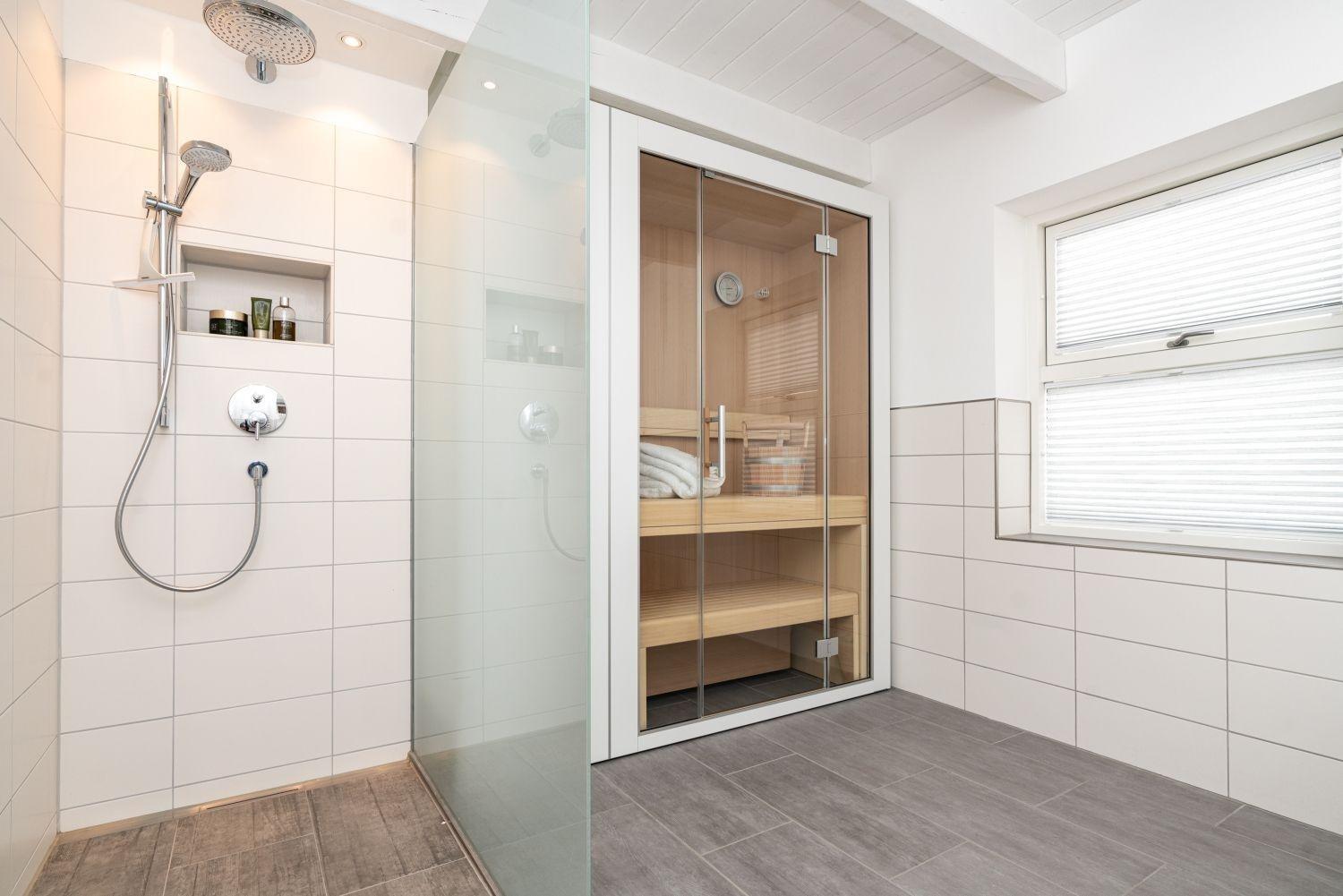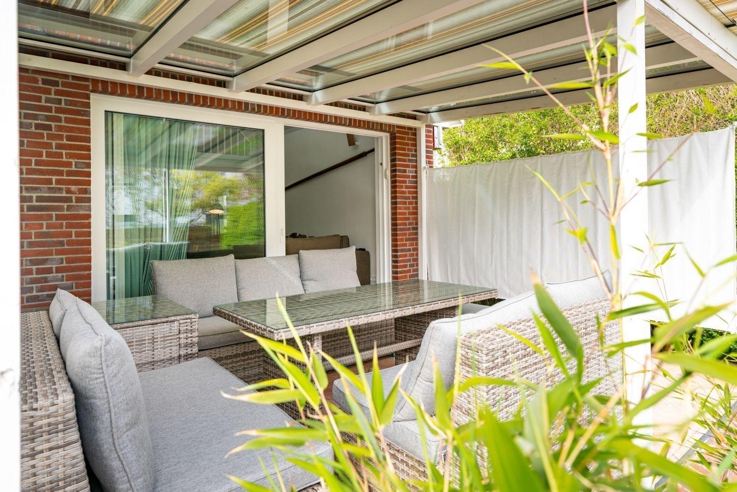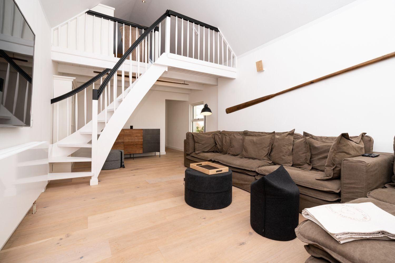 Die Wohnung Achterdeck hat ca.105 qm und liegt direkt ebenerdig im Erdgeschoß. Durch den Flur mit Gäste WC erreichen Sie die besondere Küche - SieMatic BEAUX SE 2002, das erste Schlafzimmer mit Hästens Bett sowie das Bad mit Dusche und einer KLAFS S1 Sauna. Im hinteren Bereich - sprich "achtern" öffnet sich das große Wohnzimmer mit BIG SOFA, Kaminofen und Galerie, auf der sich der 2. Schlafbereich mit Hästens Bett befindet. Am Wohnzimmer angeschlossen befindet sich die überdachte Süd-Terrasse mit bequemen Sitzmöbeln. Im Wohnzimmer und im 1. Schlafzimmer befinden sich moderne HD-TV Geräte.