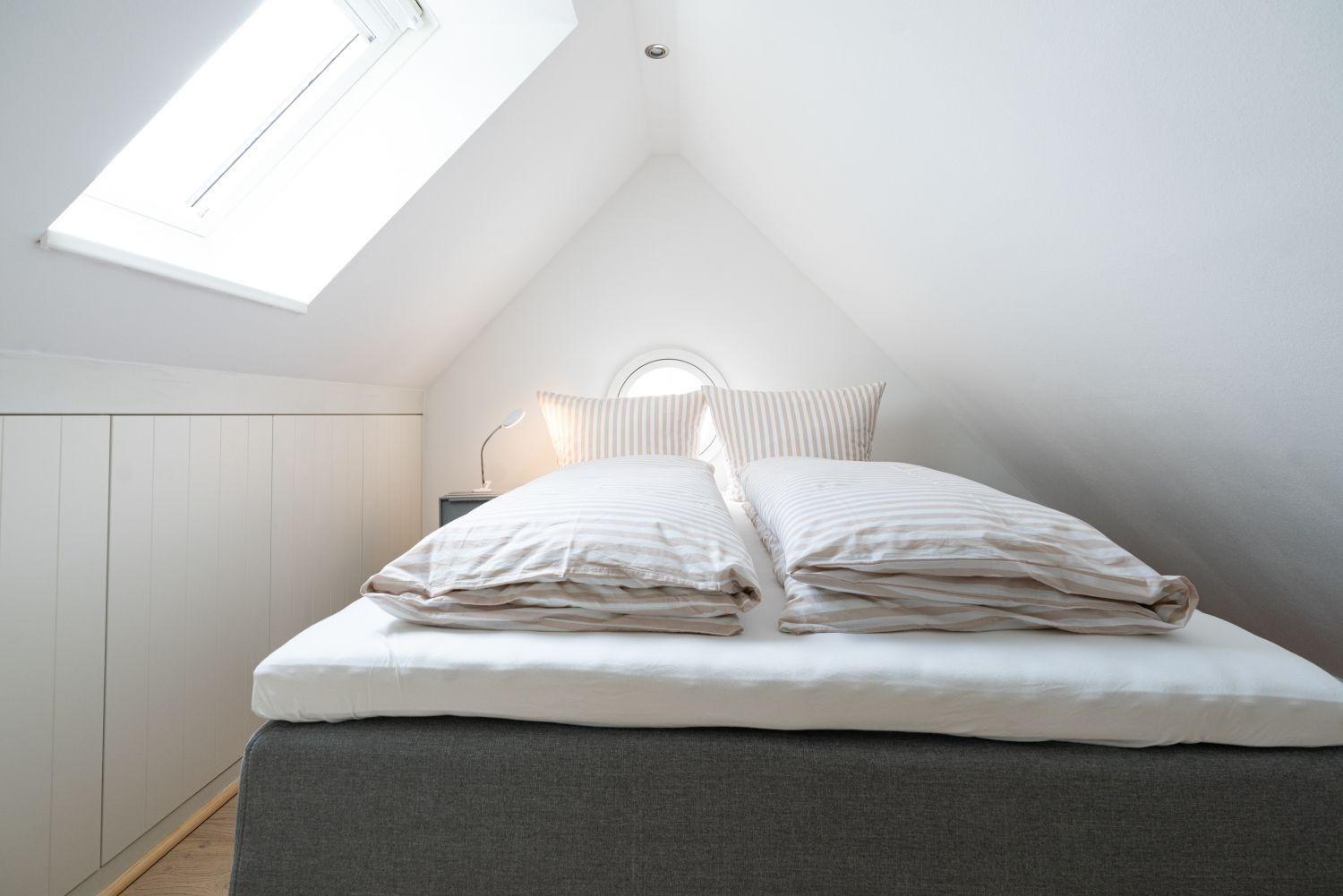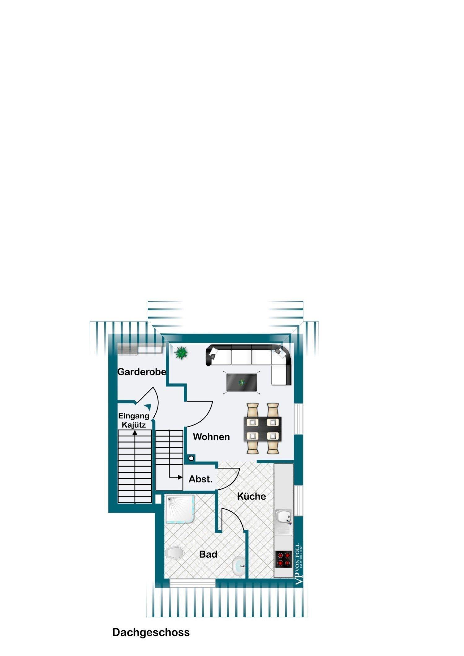 Die Wohnung Kajüte hat ca. 50 qm und liegt im Obergeschoß, das Sie über die Treppe beim Haupteingang erreichen. Über den Flur mit Garderobe erreichen Sie den Wohnbereich mit moderner Einbauküche. Hier befindet sich eine großzügige und gemütliche Schlafcouch der Essbereich und der HD-TV. Ebenso befindet Sie hier das Bad mit bodenebener Dusche. Das Schlafzimmer erreichen Sie über die interne Treppe vom Flur aus, Sie finden dort Einbauschränke und ein 160/200 Boxspringbett.