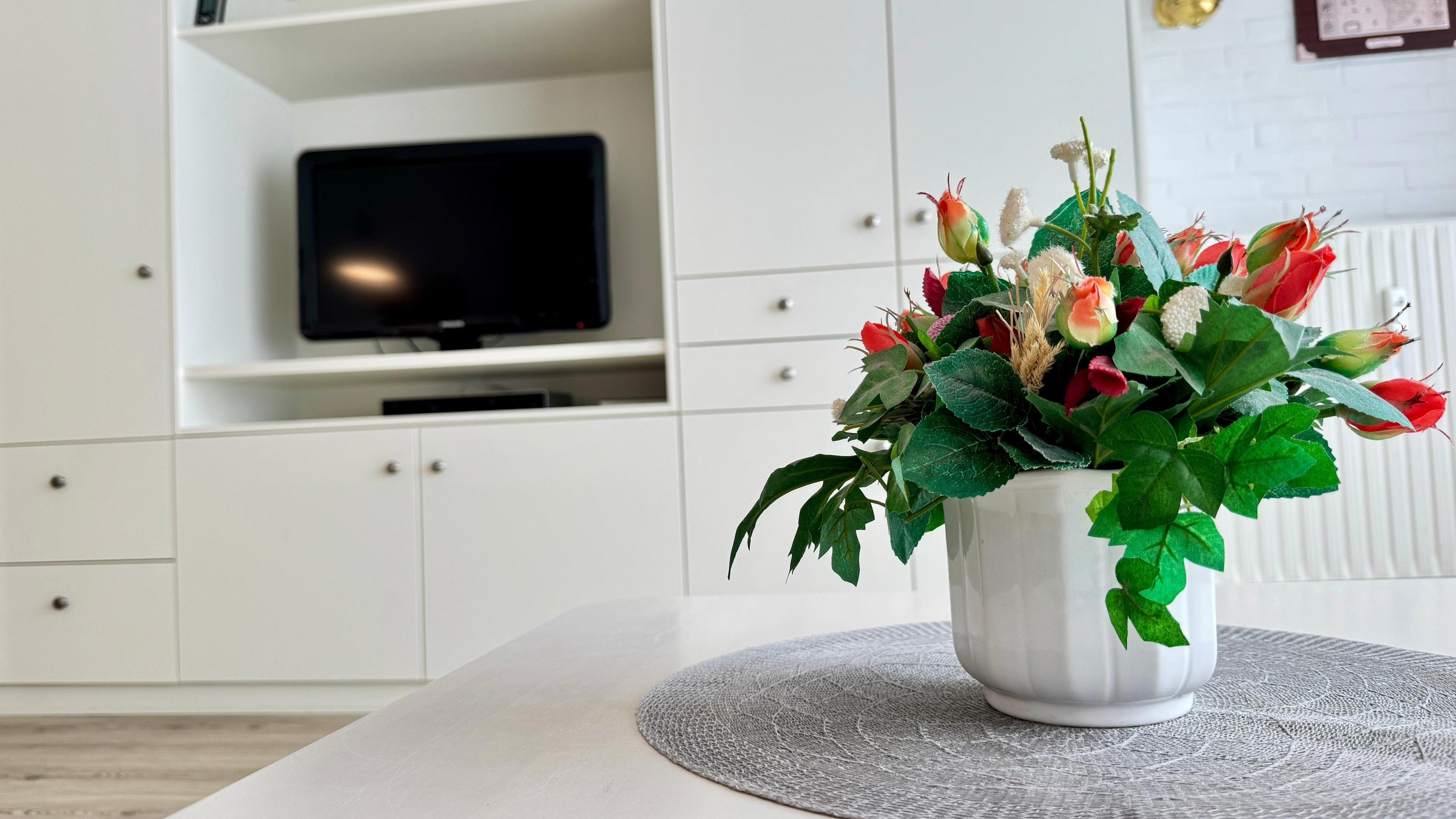Im hellen Wohnbereich befindet sich ein Vinyl-Designboden. Im Wohnzimmer, mit Ausgang zur Südterrasse, befindet sich ein Esstisch mit 4 Stühlen, ein sehr hochwertiges (Schlaf-)Sofa, welches im ausgeklappten Zustand eine durchgehende Liegefläche bietet. Die maßgefertigte Schrankwand bietet zusätzlichen Stauraum. Dort befindet sich auch ein Flachbildfernseher und ein DVD-Festplattenrekorder ( Sie können also Ihre Sendung aufzeichnen während Sie am Strand noch Ihren Wein genießen ). Festnetztelefon ( kostenlos nutzbar im dt. Festnetz ), mehrere DAB+ Radios sowie Internet mit WLAN sind ebenfalls vorhanden.