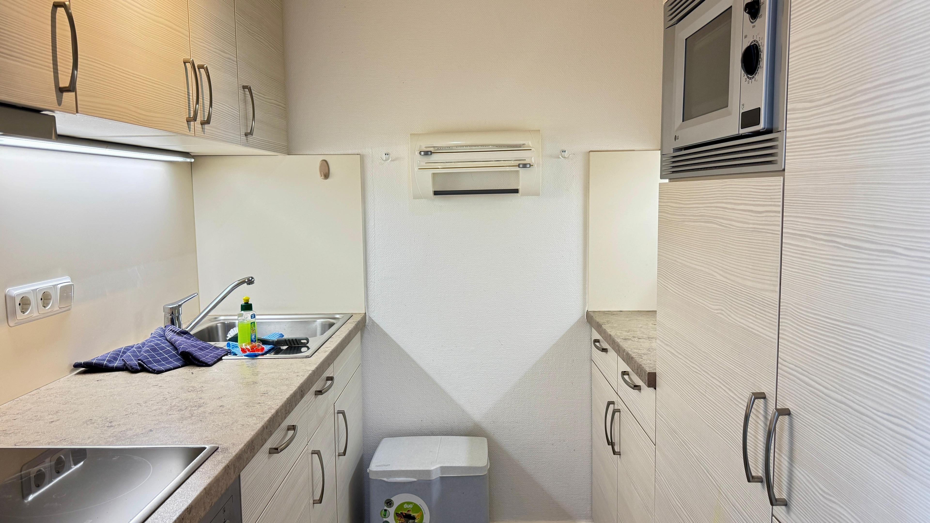 Verbrauchsmaterial, wie Mülleimerbeutel, Toilettenpapier, Spülmittel, Geschirrspültabs sind als Erstausstattung im Appartement vorhanden.