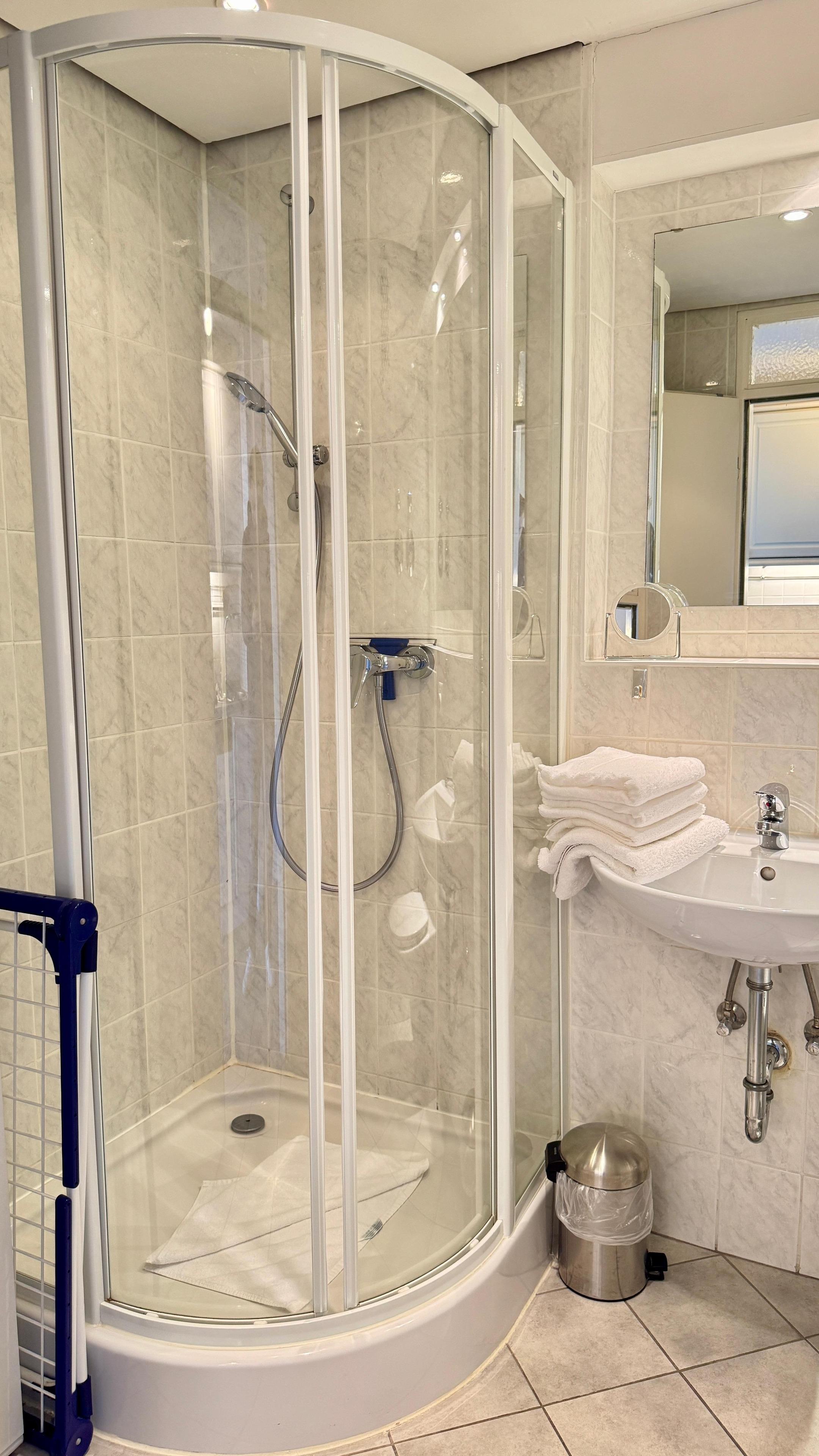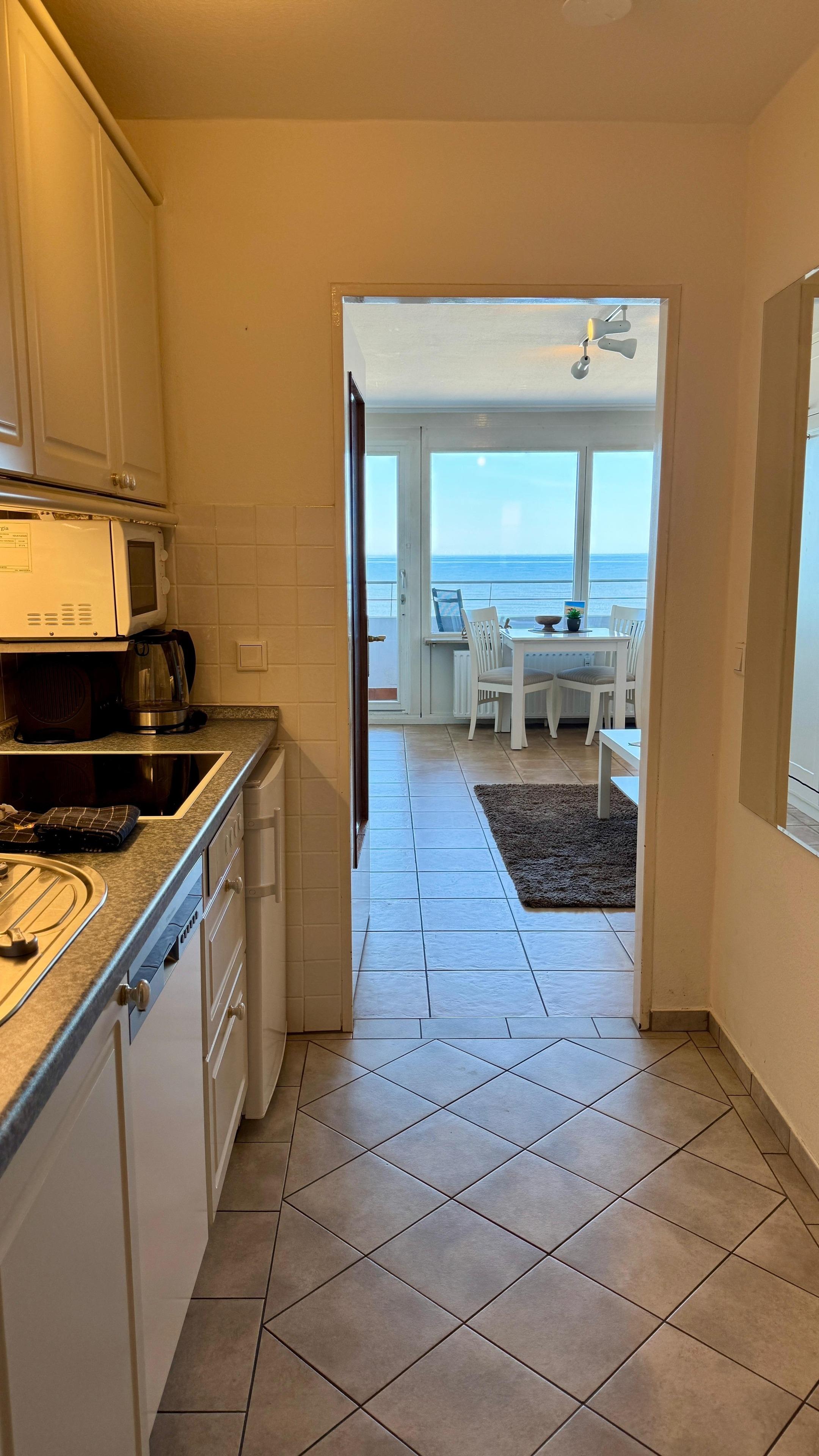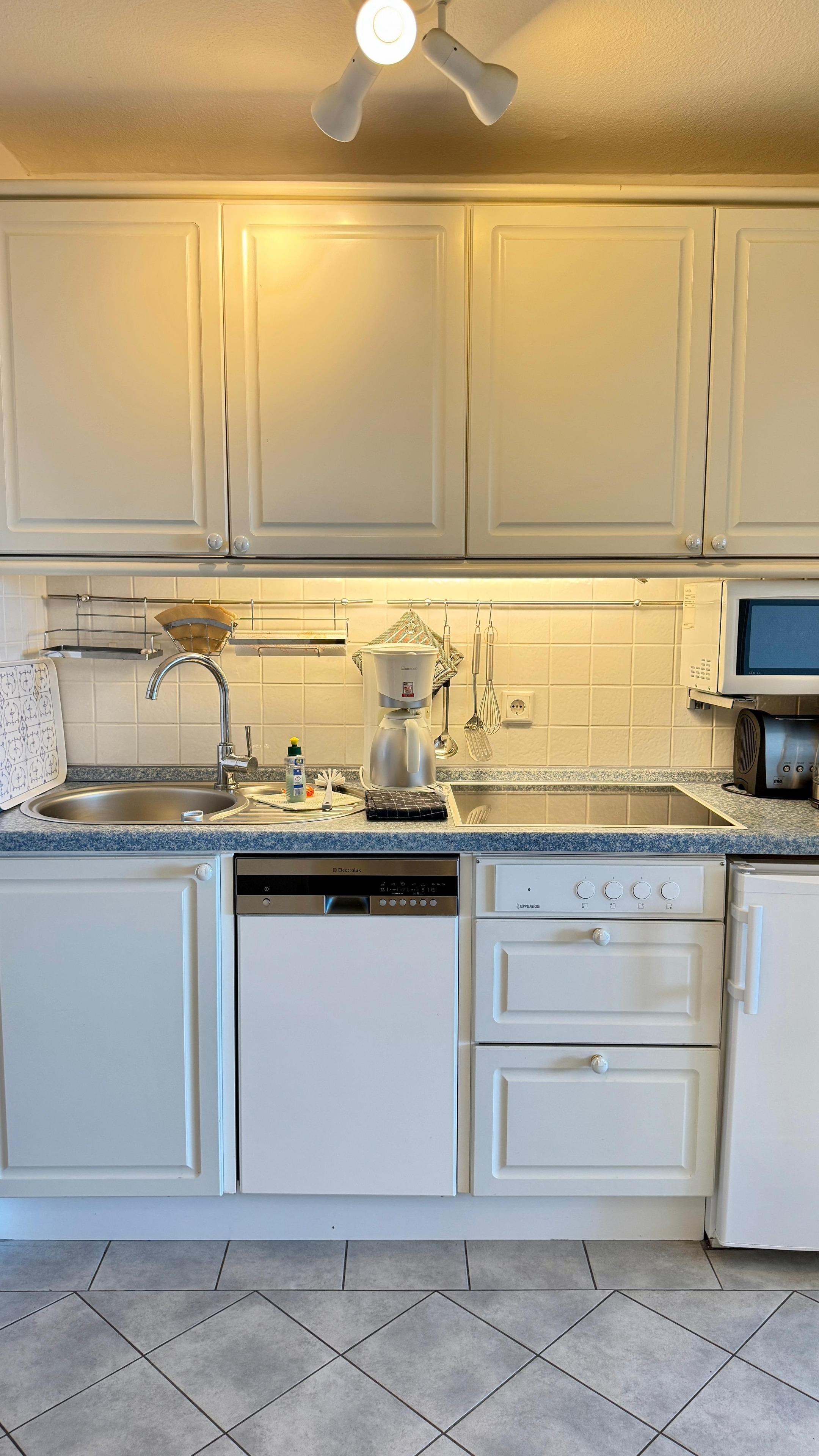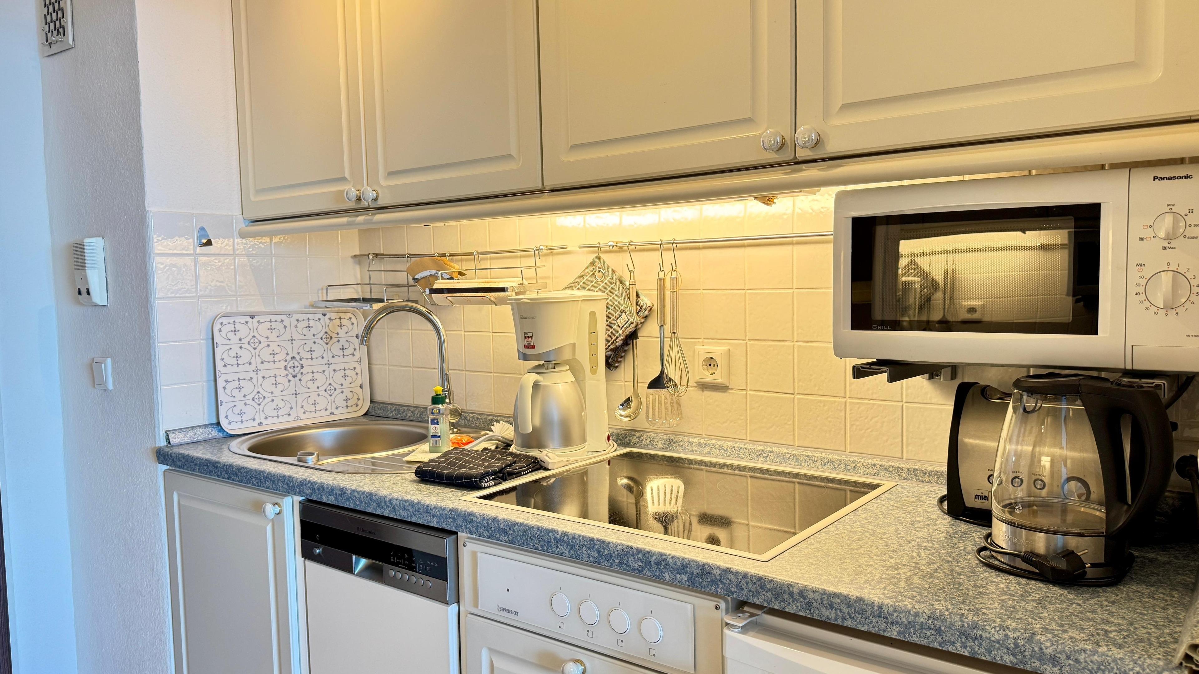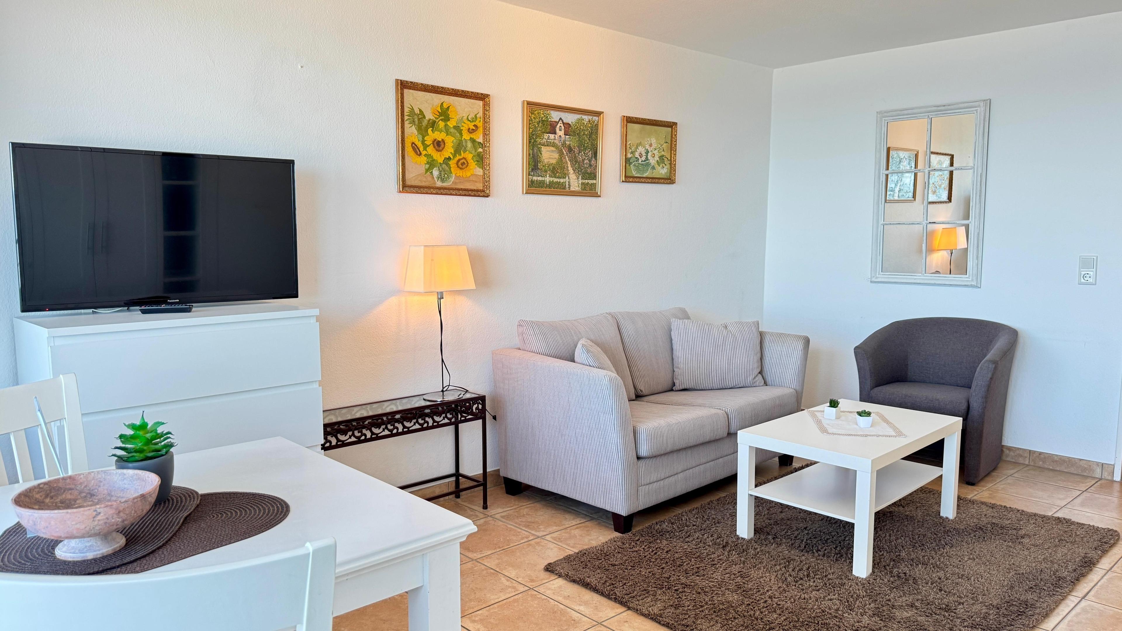 Im gefliesten Wohnraum steht Ihnen eine weiße Appartementwand mit Einzelbetten zur Verfügung. Der Essbereich mit Blick auf die Nordsee ist mit einem weißen Esstisch und 2 Stühlen ausgestattet. Eine hochwertige Couch, ein Clubsessel und ein Tischchen, sowie ein neuer Flachbildfernseher (an der Wand hängend) runden das Bild ab. Im Duschbad befindet sich eine Runddusche und eine Handtuchheizung. Es ist hell gefliest. Im Flurbereich steht Ihnen eine voll ausgestattete Küchenzeile mit 4-Platten-Ceranfeld, Mikrowelle und Geschirrspüler zur Verfügung. Der große Westbalkon lädt zum Sonnenbaden ein und bietet einen herrlichen Seeblick.