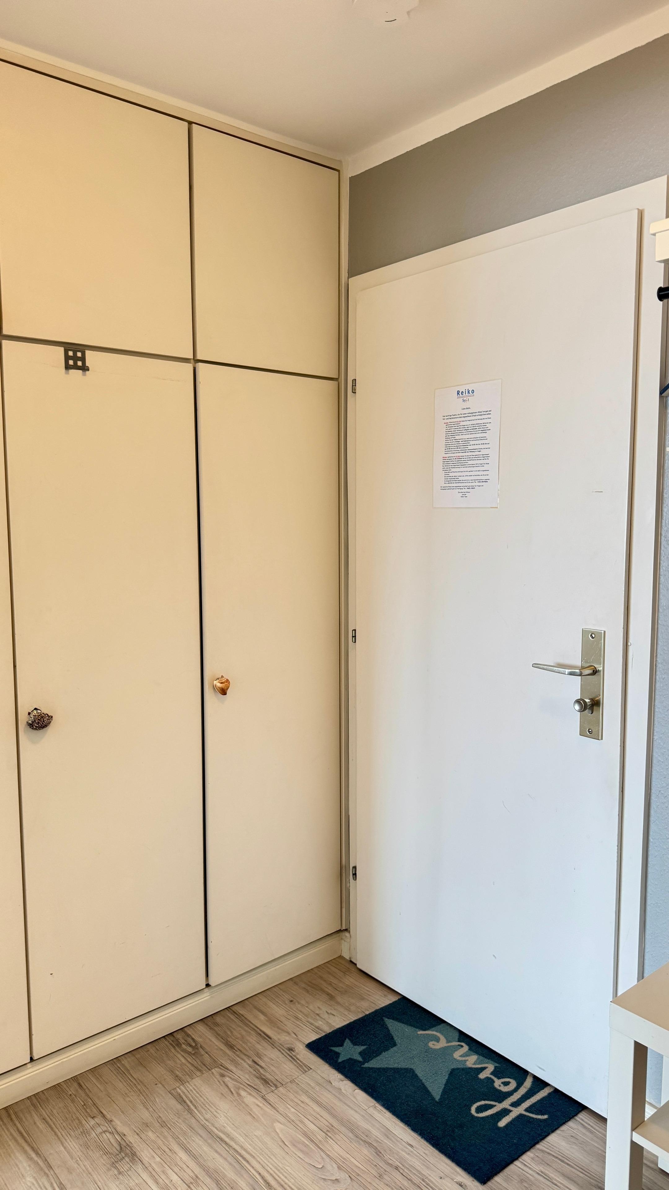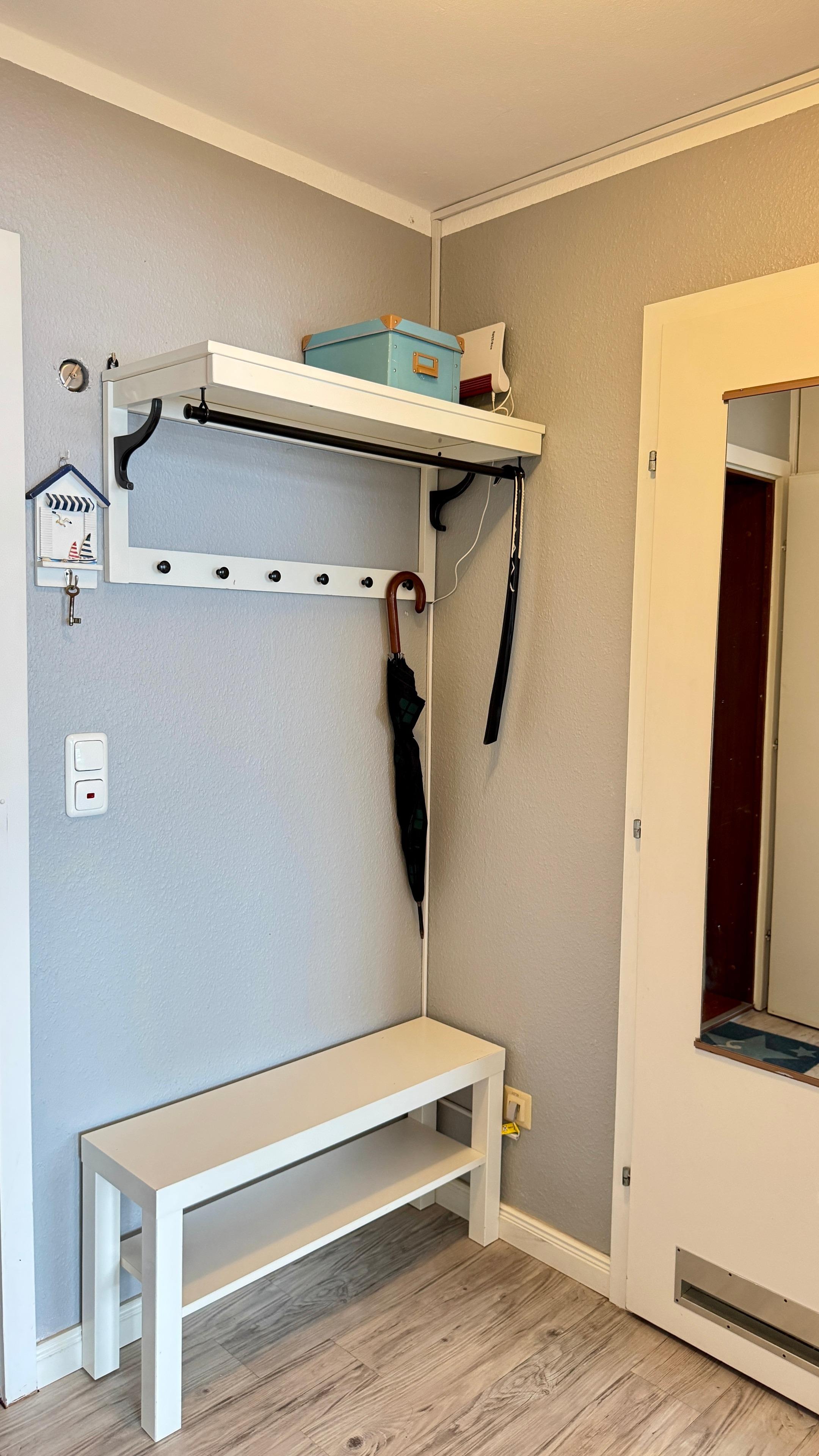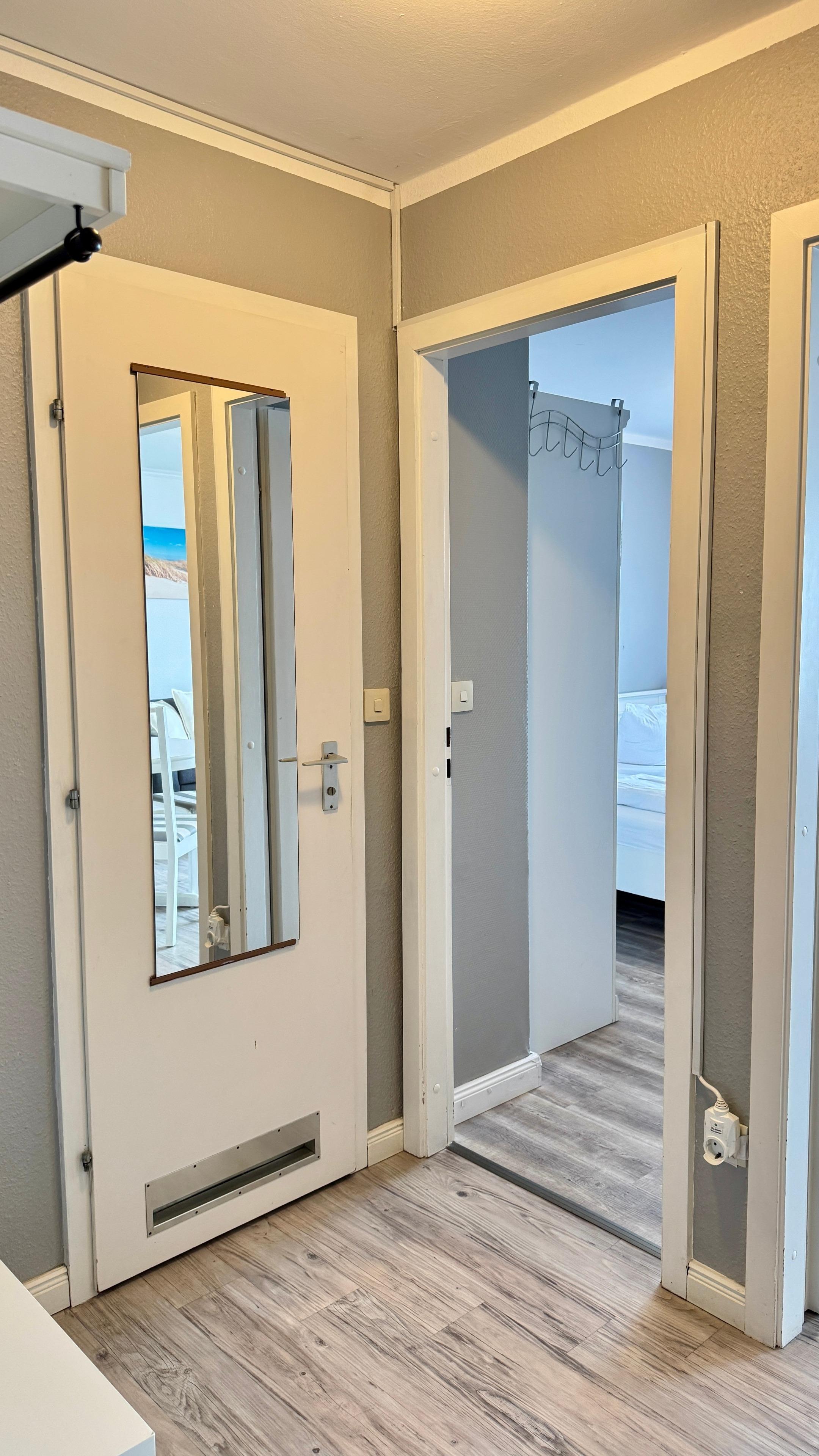 Im Wohn- und Schlafzimmer sowie im Flur- und Küchenbereich ist ein hochwertiger Vinyl-Designerboden verlegt. Im Jahr 2020 wurde das Schlafzimmer komplett ereuert und bietet Ihnen nun ein weißes, klassisches Doppelbett und einen geräumigen Kleiderschrank, sowie ein weiteres TV-Gerät an der Wand hängend, für einen Fernsehgenuß vom Bett aus. Im Wohnzimmer befindet sich eine kleine weiße Schrankwand mit einem 40 Zoll großen Flachbild-TV, eine schwarze Schlafcouch, ein weißer Couchtisch mit Glaseinlage, Radio mit CD Player und ein kleiner Esstisch mit 3 Stühlen. Die kleine Küche ist mit einem 4 Flammen-Ceranfeld, einem Kühlschrank und einer Mikrowelle ausgestattet. Eine Kaffeemaschine, ein Wasserkocher, ein Eierkocher und ein Toaster sind selbstverständlich auch vorhanden.
