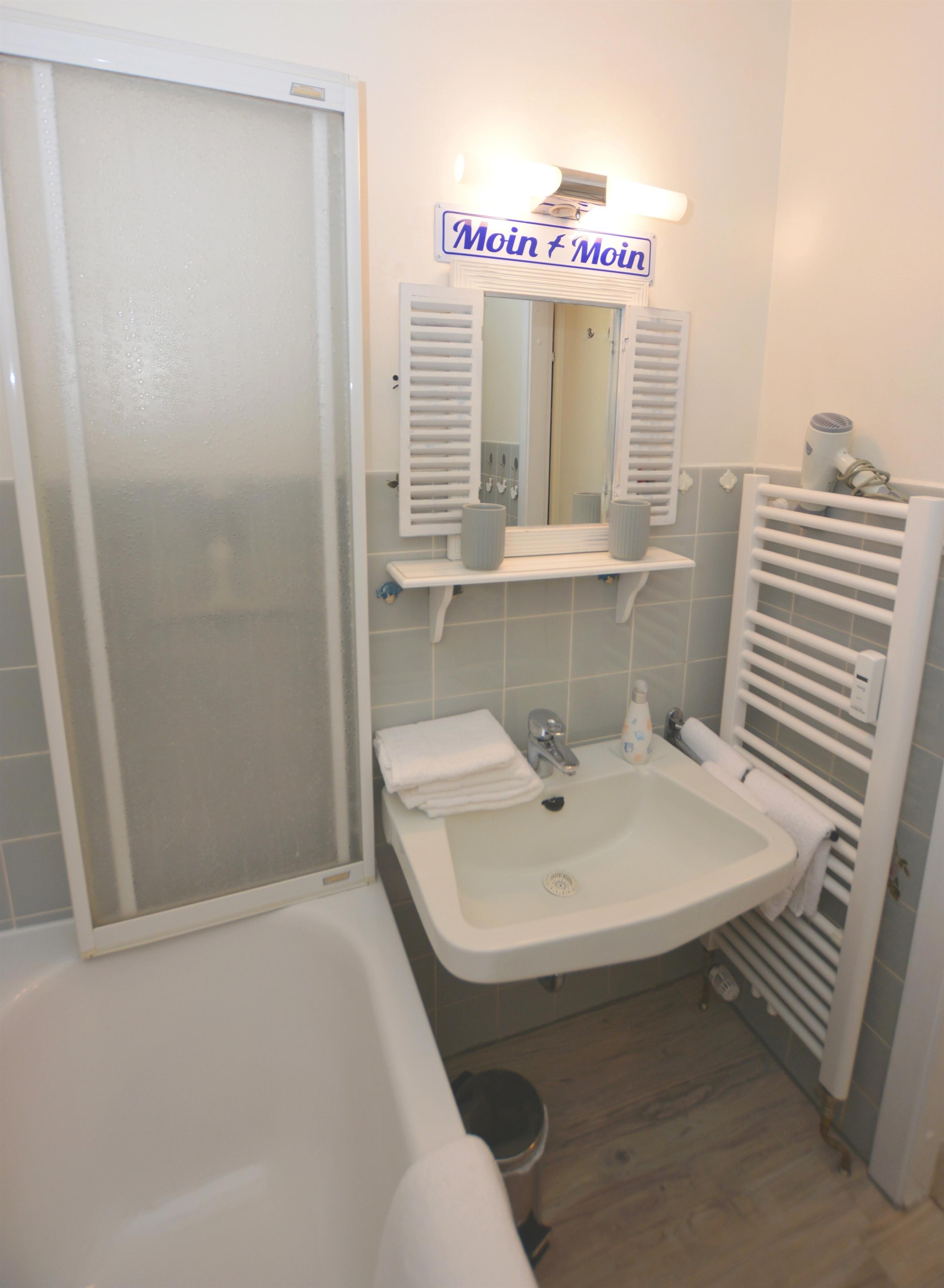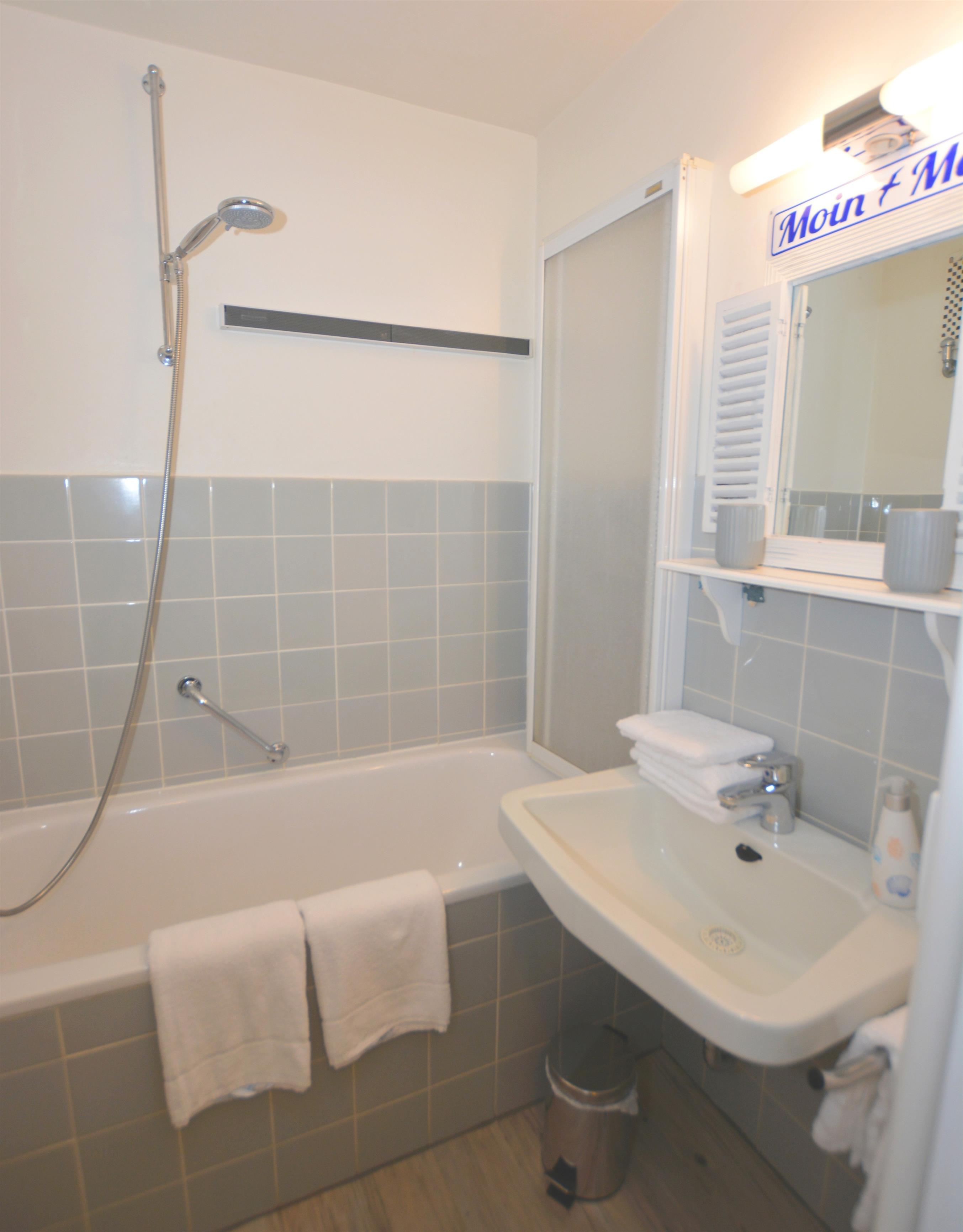 Im Bad befindest sich ein Vollbad mit Duschvorrichtung mit einer modernen Handtuchheizung.