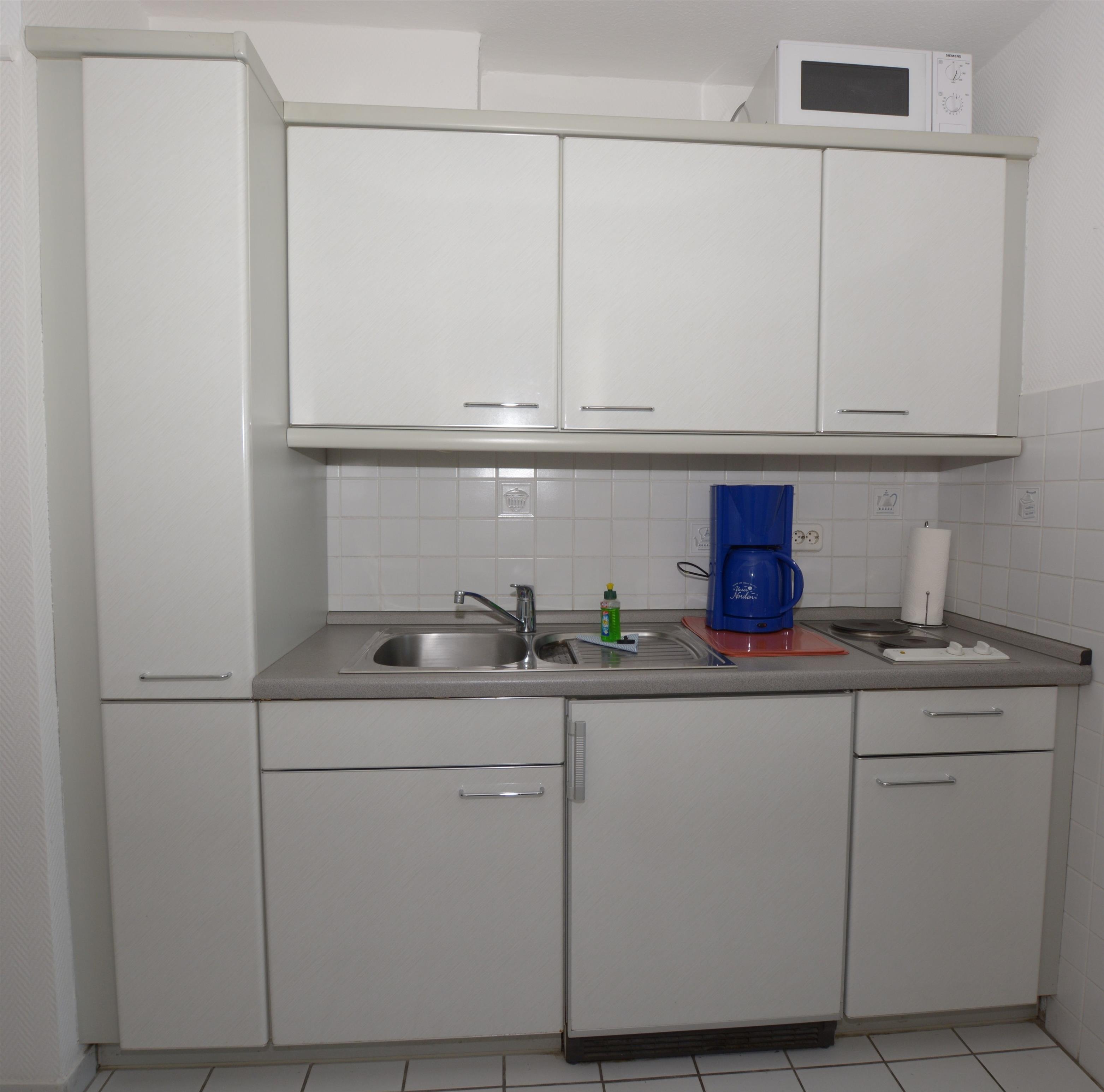 Im weißgefliesten Flurbereich befindet sich eine helle Küchenzeile mit 2-Platten-Herd, Kühlschrank und Mikrowelle. Das helle und moderne Duschbad verfügt über eine großzügige Doppeldusche mit Flacheinstieg, eine Handtuchheizung, einen Föhn und einem Waschtisch mit Unterschrank. Das Wohnzimmer ist mit einem weiß/blauem PVC-Fußboden ausgelegt. Eine neue Schlafcouch (140x200), Esstisch mit zwei Stühlen, Kleiderschrank, Flachbild-TV, sowie ein Arbeitsplatz und ein großer Balkon mit Blick über Westerland und die Insel Sylt sind ebenfalls vorhanden. Im gesamten Haus steht Ihnen ein freier WLAN-Zugang (ohne Gewähr) zur Verfügung.