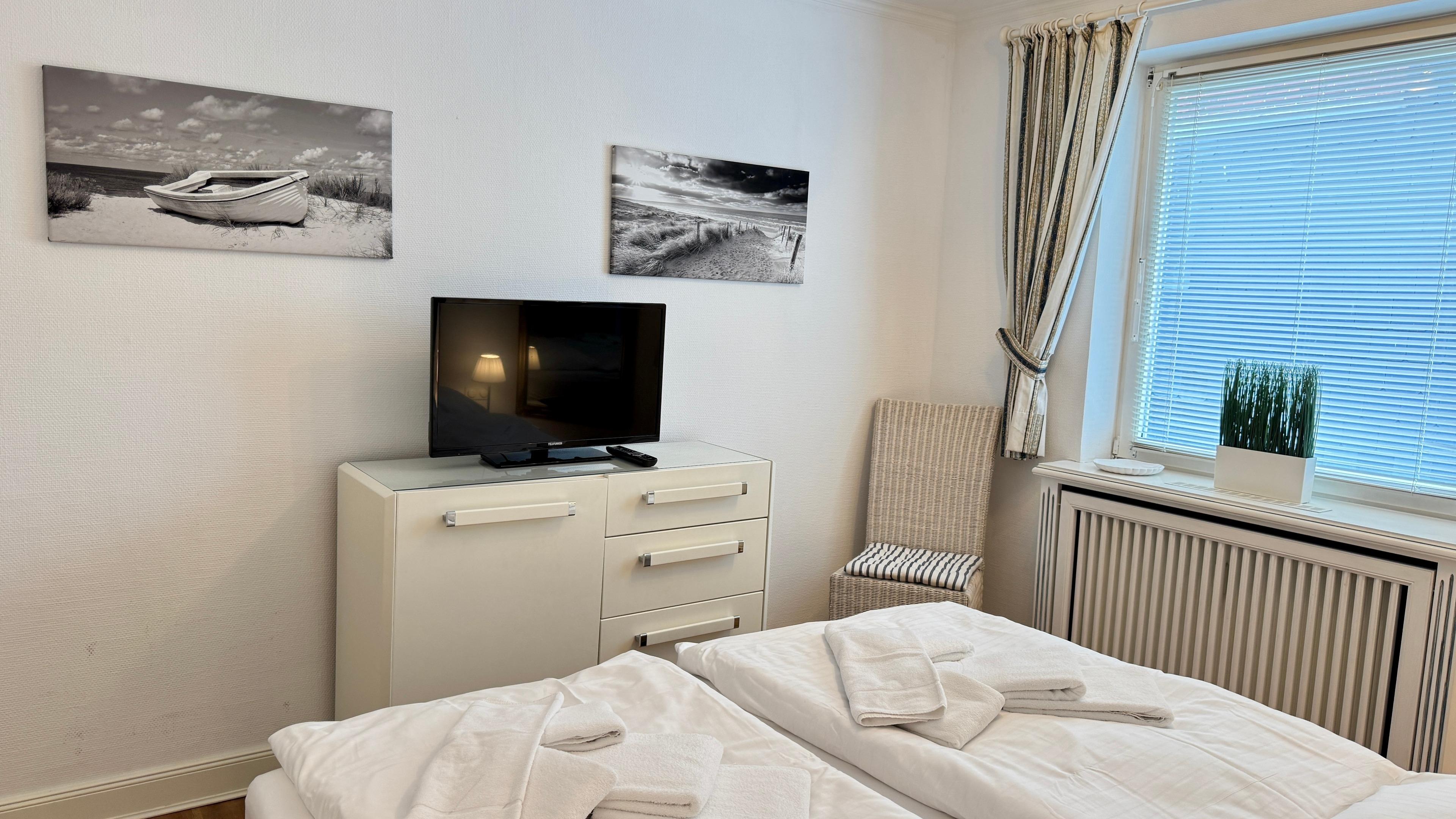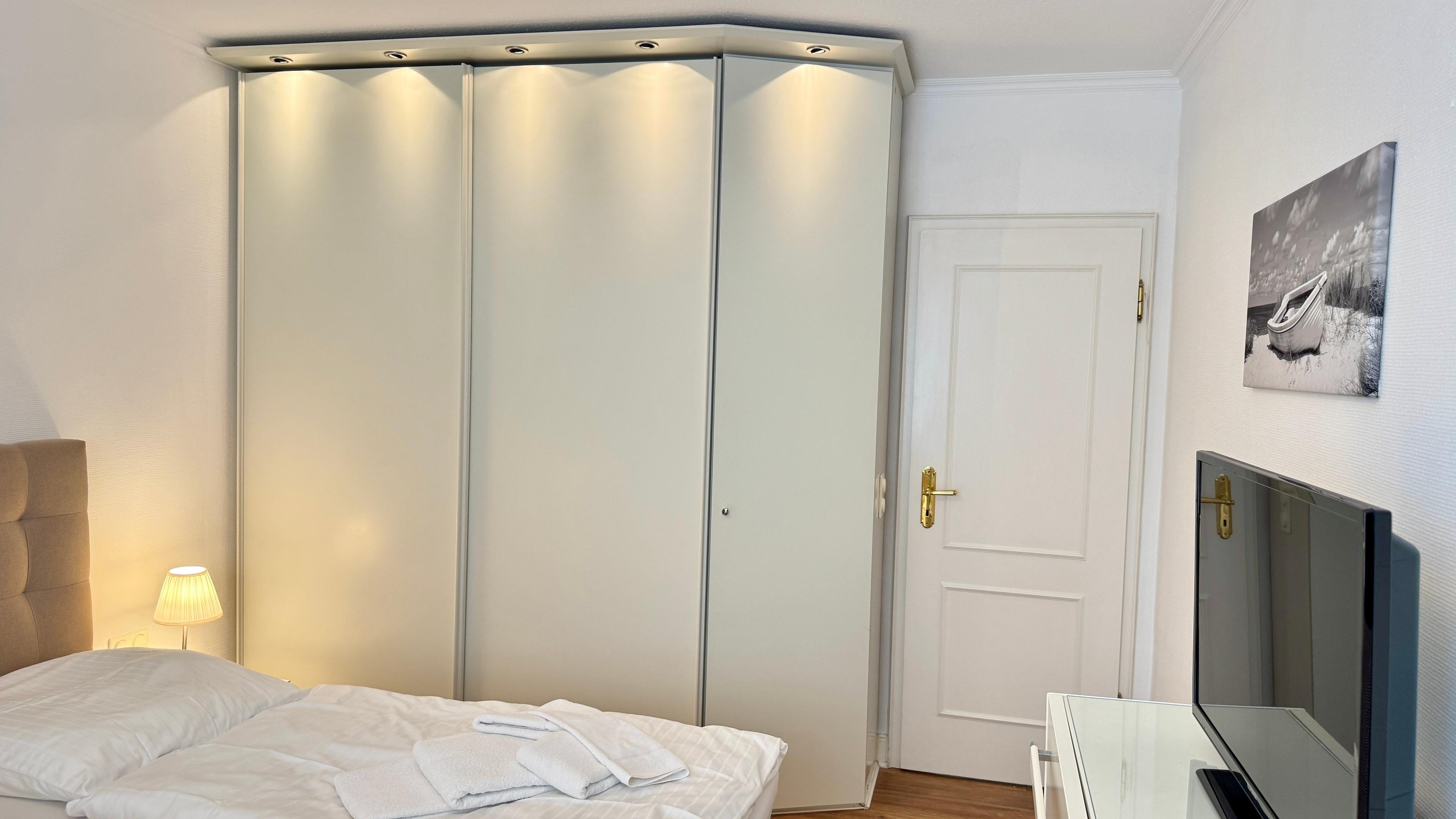 Das großzügige Schlafzimmer ist mit einem komfortablen Boxspringbett und einem geräumigen Einbauschrank ausgestattet. Auch hier steht Ihnen ein zusätzlicher Flachbild-TV zur Verfügung.