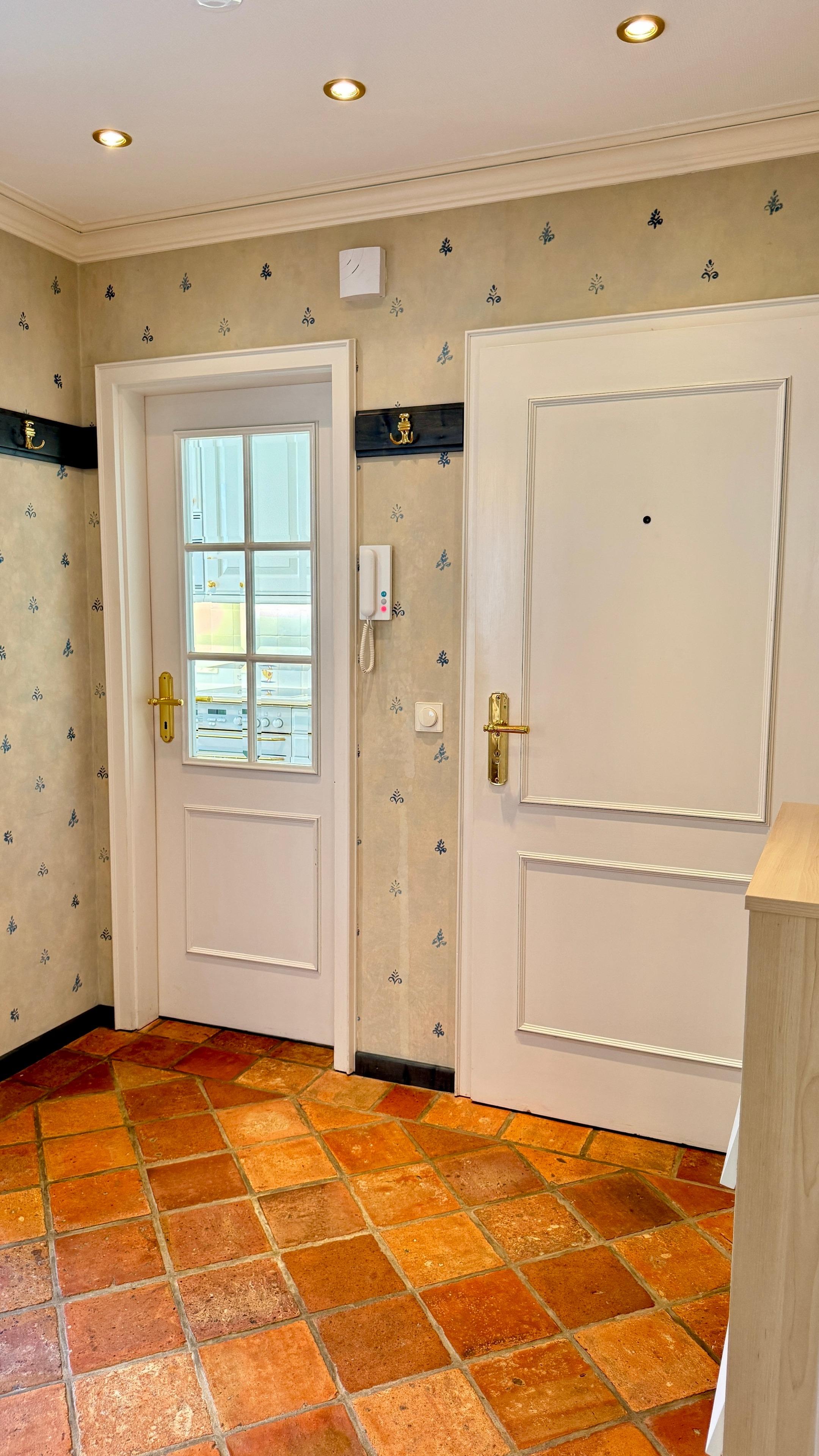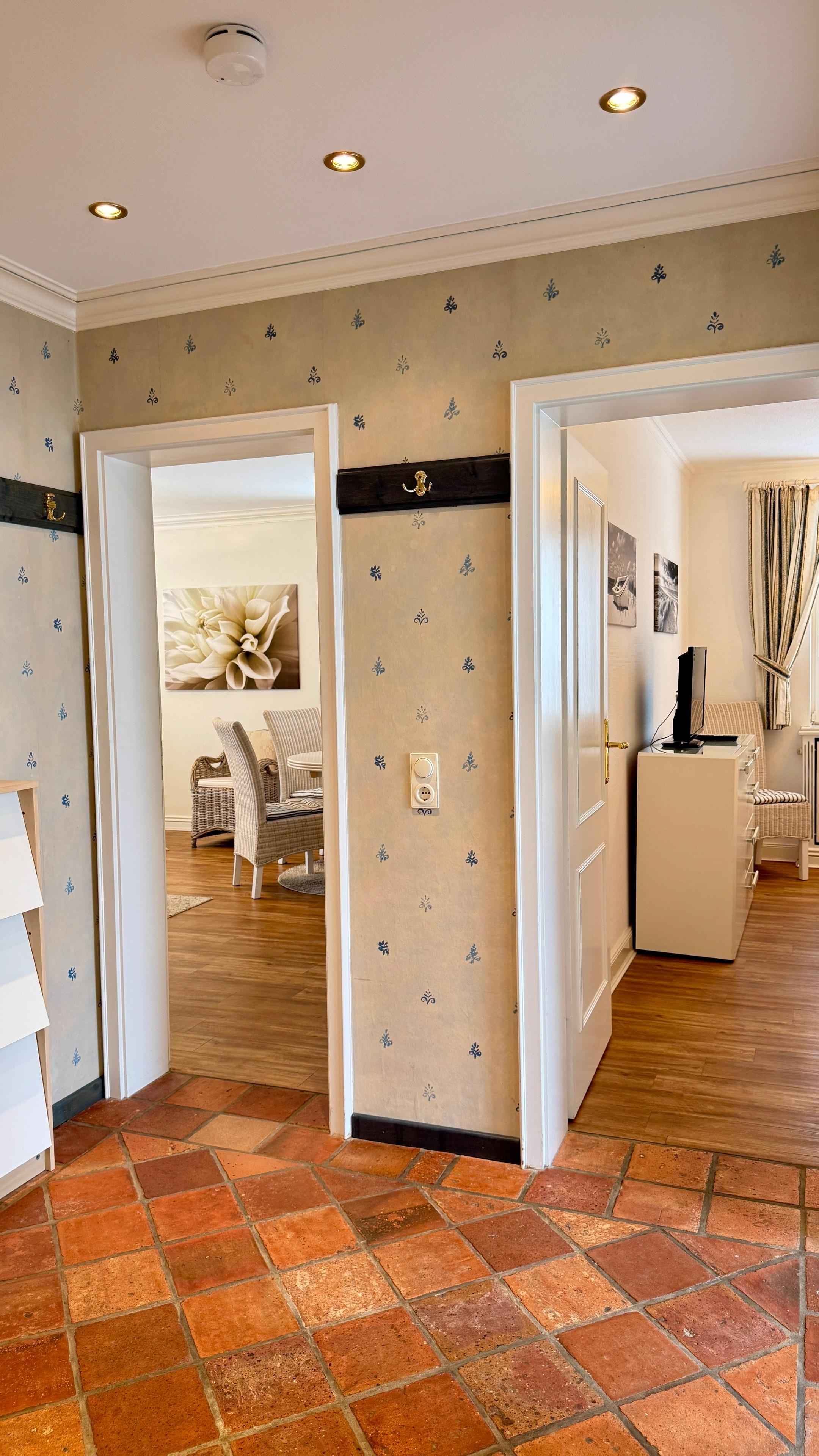 Das moderne Duschbad überzeugt mit WC, Waschbecken, Spiegelschrank und Föhn. Im Eingangsbereich stehen Ihnen zudem eine Garderobe sowie ein praktischer Schuhschrank zur Verfügung.