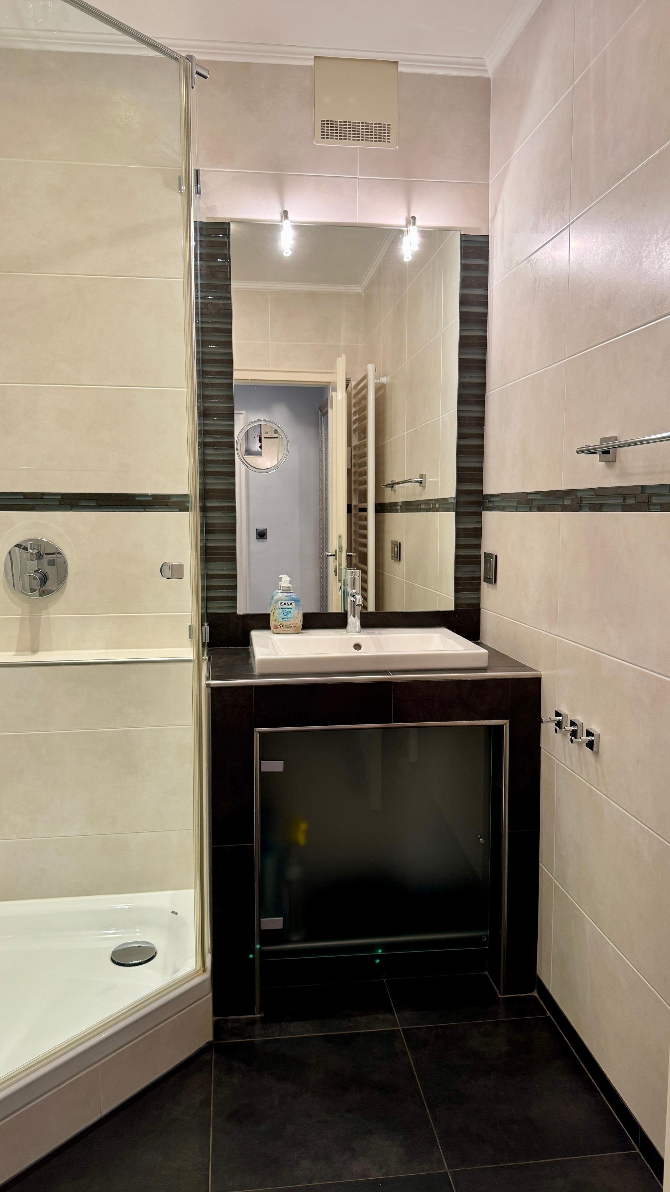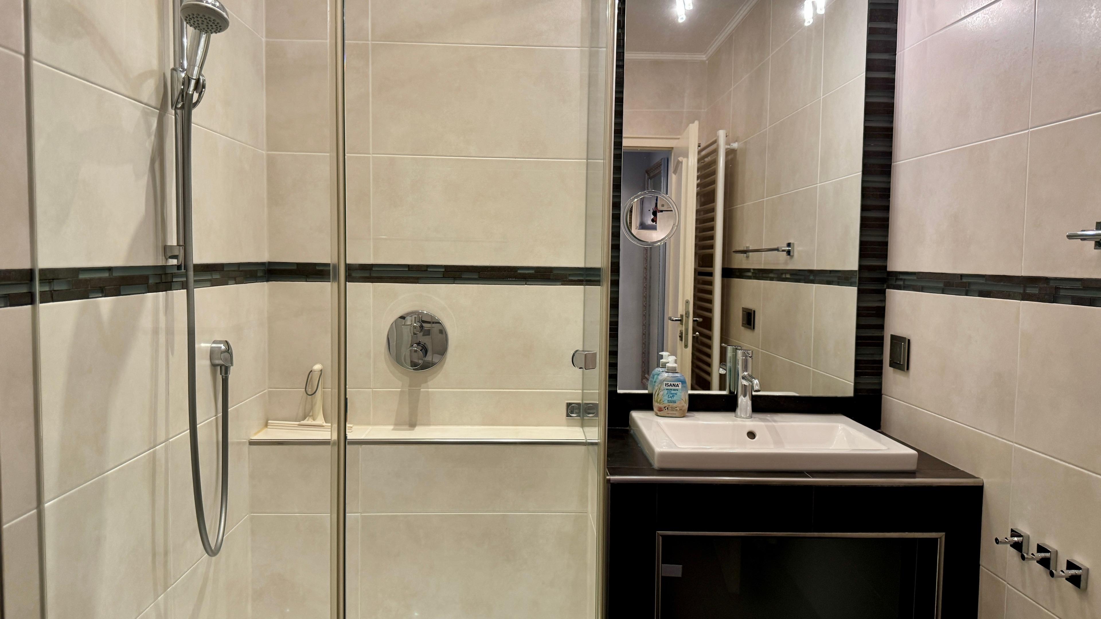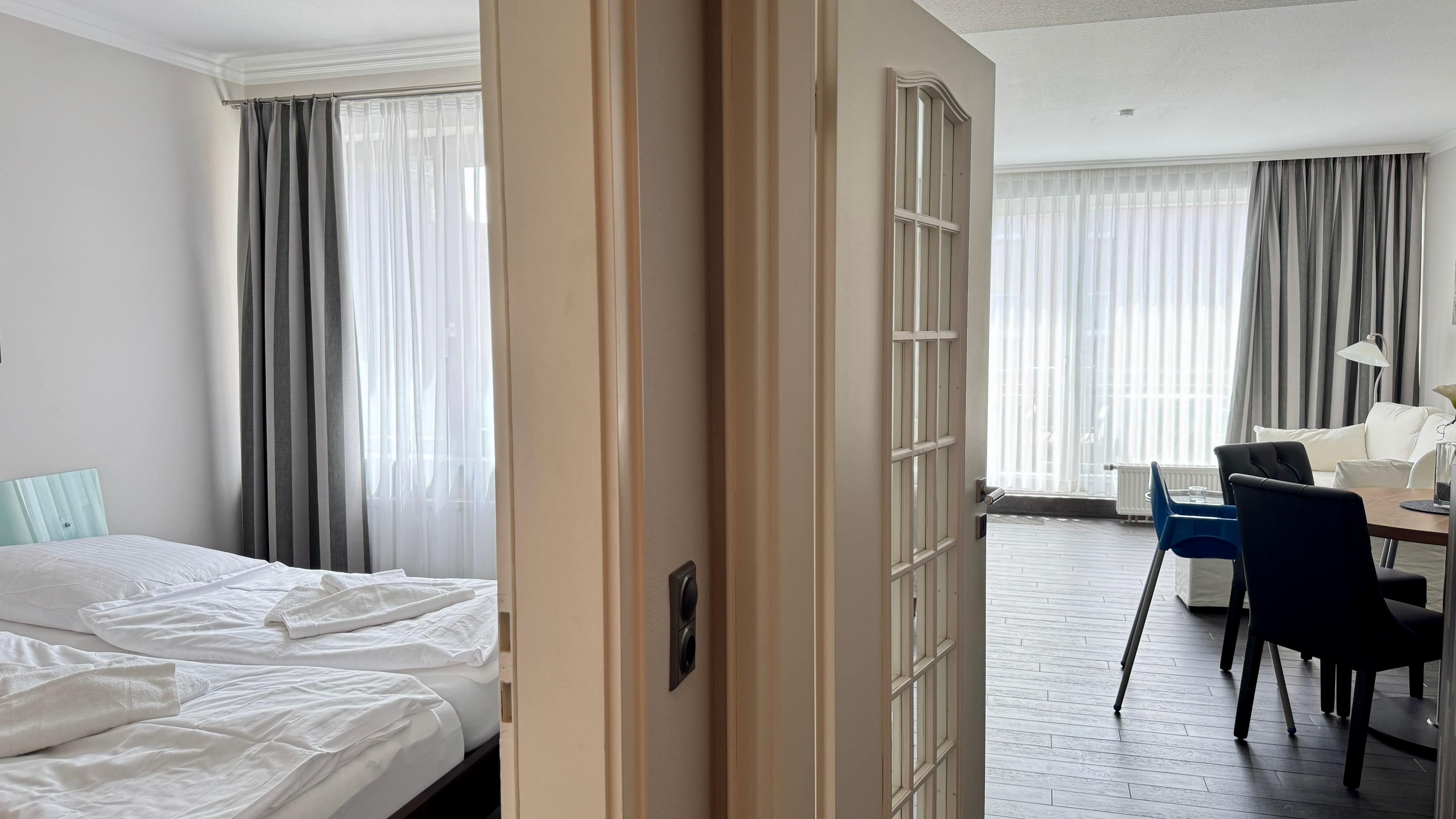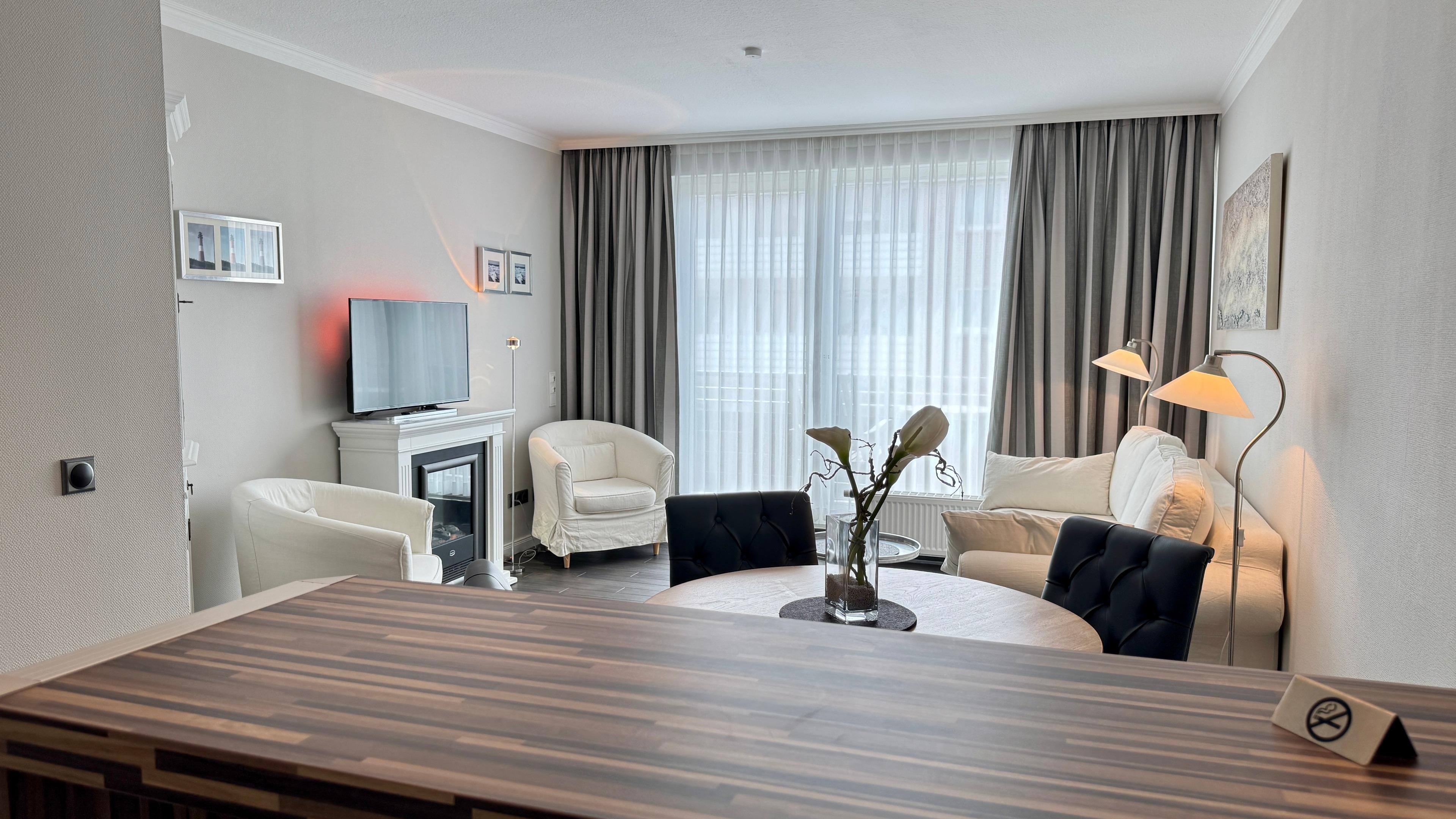 Das Appartement für maximal zwei Personen verfügt über ein großzügiges Wohnzimmer mit Essecke. Die offene Wohnküche ist durch einen verschiebbaren Frühstückstresen optisch abgeteilt. Neben einem modernen Touch-Control-Induktions-Kochfeld und einem kompakten Kombibackofen gehört ein superleiser Geschirrspüler zu ihrer Grundausstattung. Sowohl im Wohnzimmer, in dem ein Elektrokamin in der stürmischen Jahreszeit für Wohlbehagen sorgt, als auch im Schlafzimmer befindet sich jeweils ein LCD-Fernseher. Internet ist via WLAN (ohne Gewähr) vorhanden. Das Doppelbett entspricht ebenso der gängigen Comforthöhe wie die Toilette im Bad. Die großzügige Vollglasdusche ist dort der optische Blickfang, das Touch-Control-Wandradio einer der vielfältigen technischen Raffinessen im Appartement. Probieren Sie es aus - Sie werden sich verlieben.