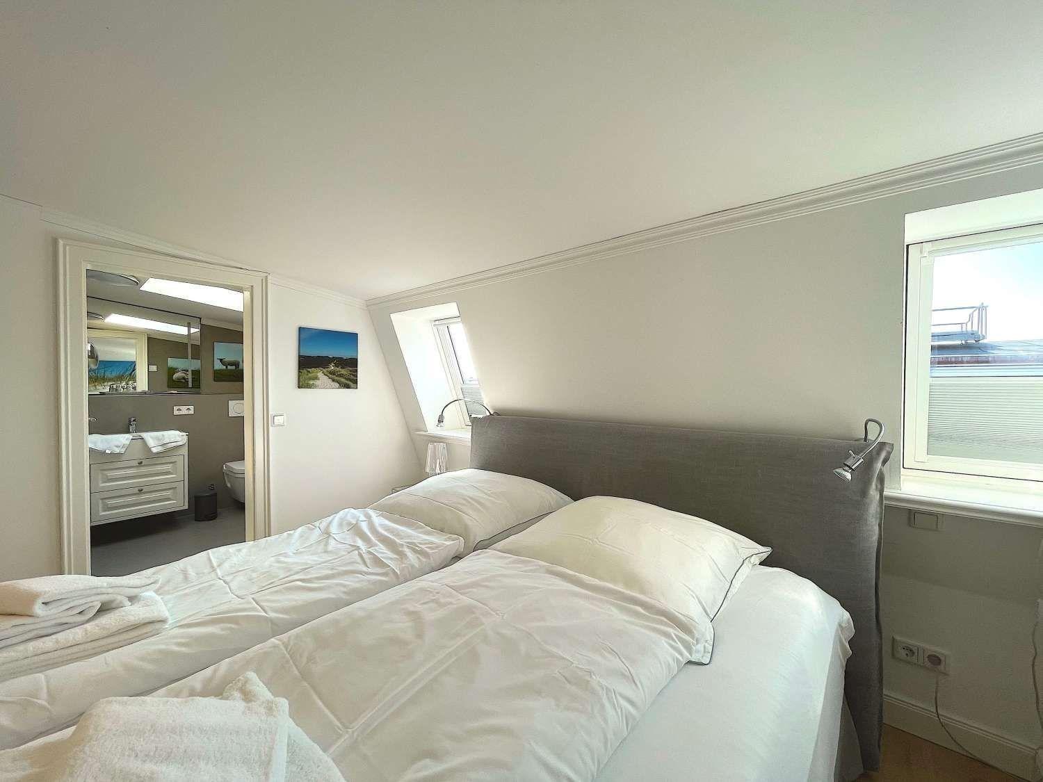 Durch die interne Treppe erreichen Sie die beiden Schlafzimmer, die jeweils über ein Bad en Suite verfügen . Beide Schlafzimmer verfügen über hochwertige Einbauten und Betten des Herstellers Schramm.