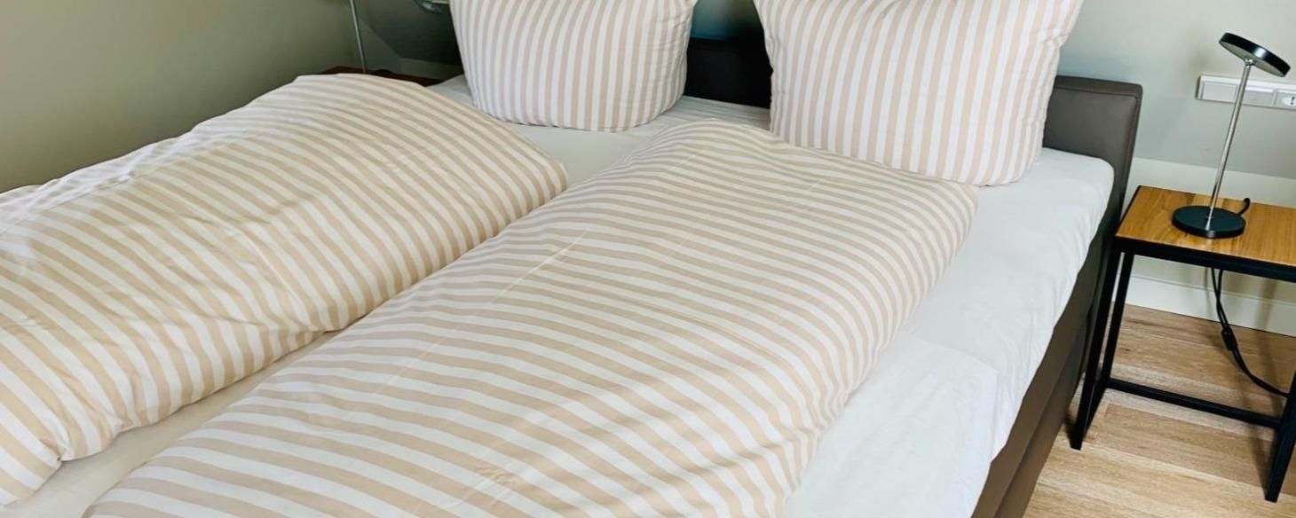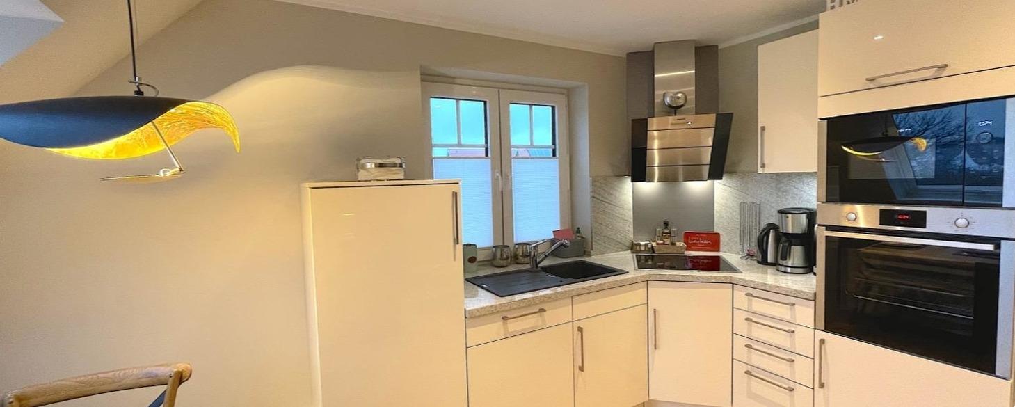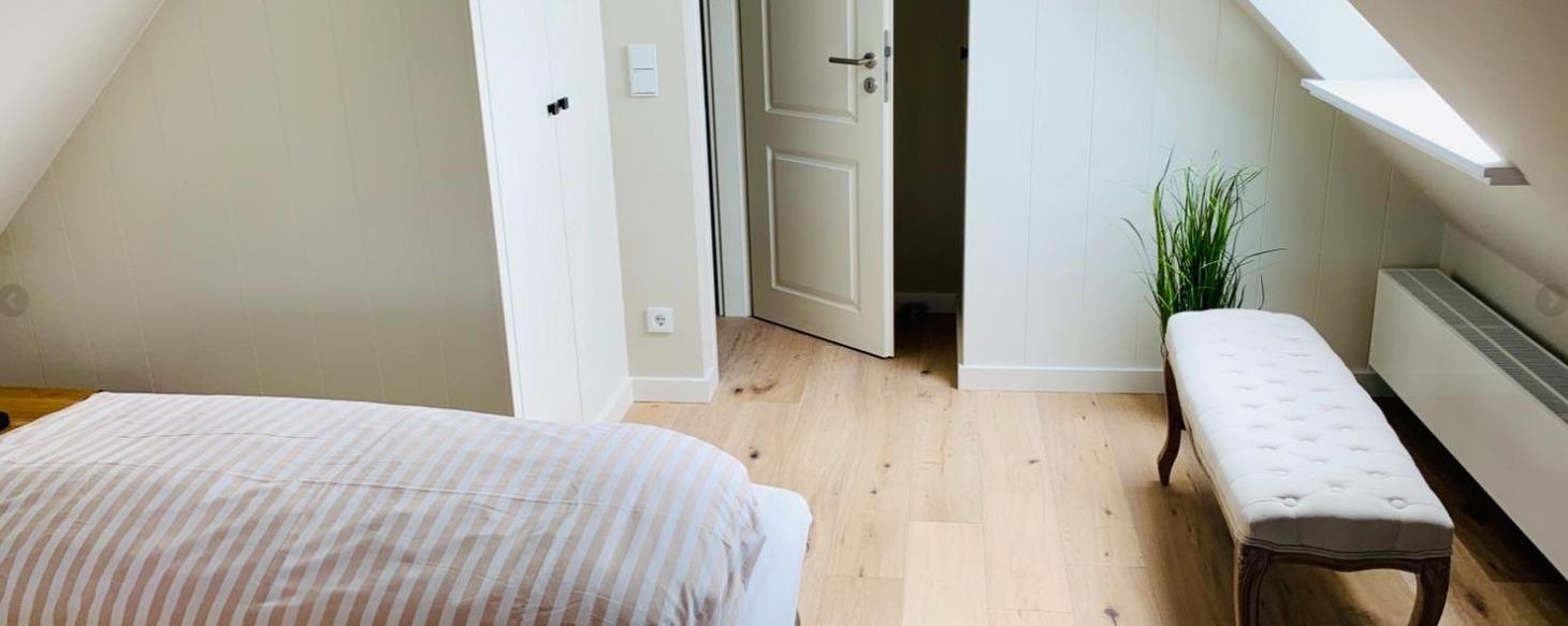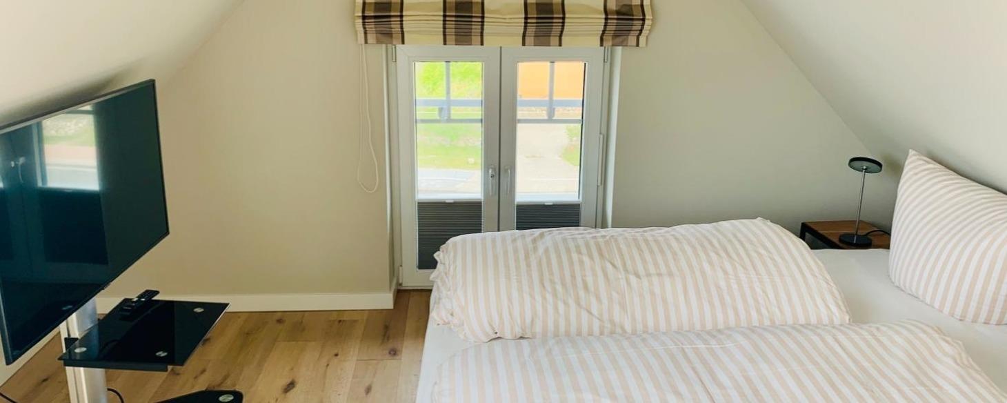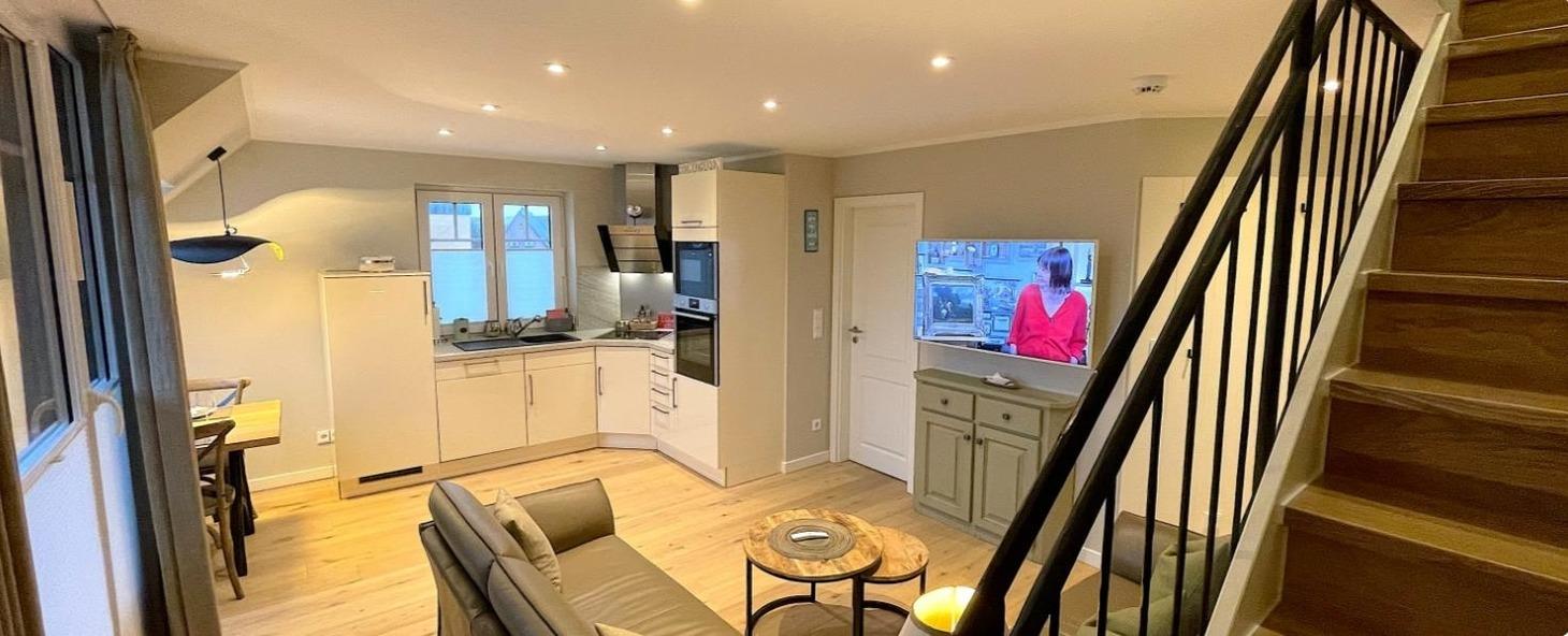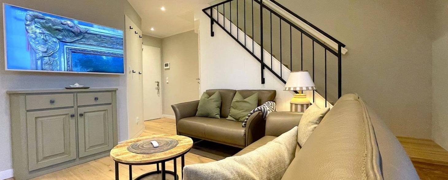 Modern eingerichtet bietet die Ferienwohnung Platz für bis zu 4 Personen. Die Wohnung liegt im Obergeschoss, erreichbar über das gepflegte Treppenhaus. Vom Flur aus gehen Schlafzimmer mit Doppelbett, das Bad und das Wohnzimmer mit Südbalkon ab. Das weitere Schlafzimmer mit Doppelbett erreichen Sie durch die interne Treppe nach oben, dort befindet sich ein weiteres Bad. Der Küchenbereich ist als moderne Küchenzeile in das Wohnzimmer integriert.