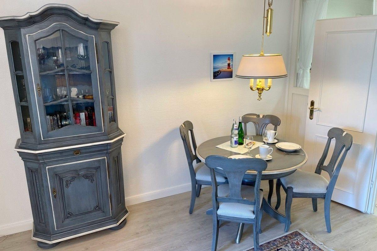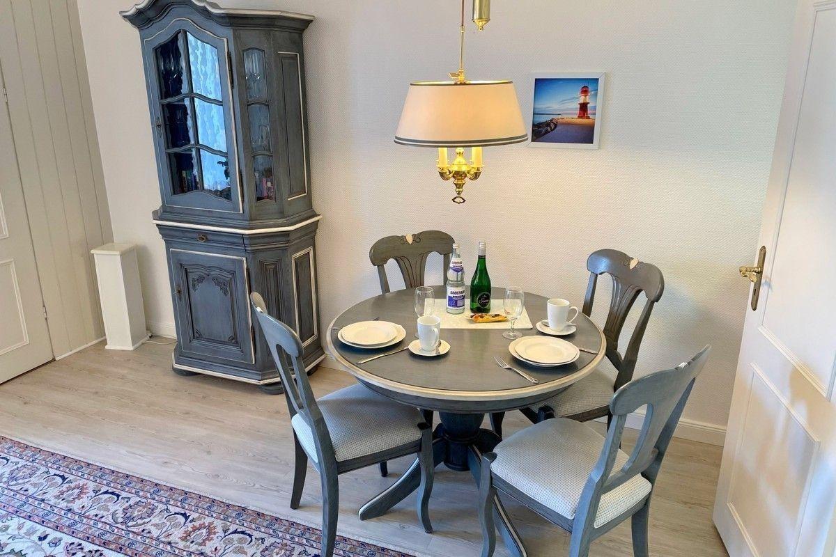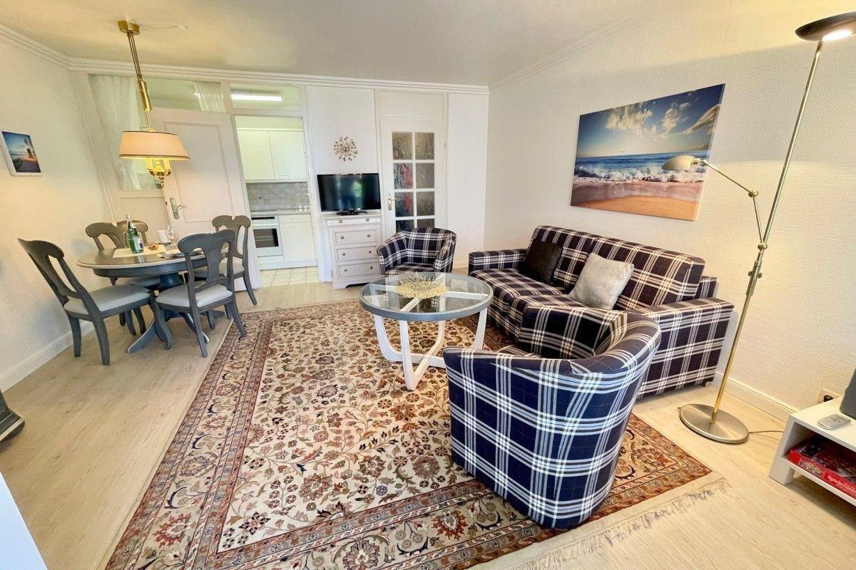 Das charmante Appartement liegt im Hochparterre und besticht durch seine Nord-West-Ausrichtung. Genießen Sie die Nachmittage auf der Loggia und lassen Sie den Alltag hinter sich! Sollte das Wetter mal typisch norddeutsch sein, können Sie es sich in der kuscheligen Sofaecke gemütlich machen – ausgestattet mit einem Flachbild-TV, Radio, CD-Player, Deckenfluter und Leselampe, ist hier Entspannung garantiert. Der großzügige Esstisch mit stilvoller Pendelleuchte lädt zu langen, geselligen Abenden mit Familie oder Freunden ein.