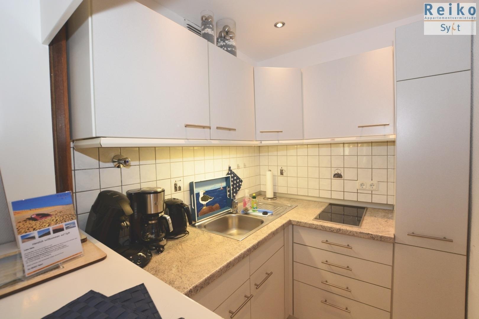 Die Küchenzeile verfügt über ein 2er-Ceran-Kochfeld, Kaffeemaschine, Wasser- und Eierkocher, Toaster, Bügelbrett und Bügeleisen