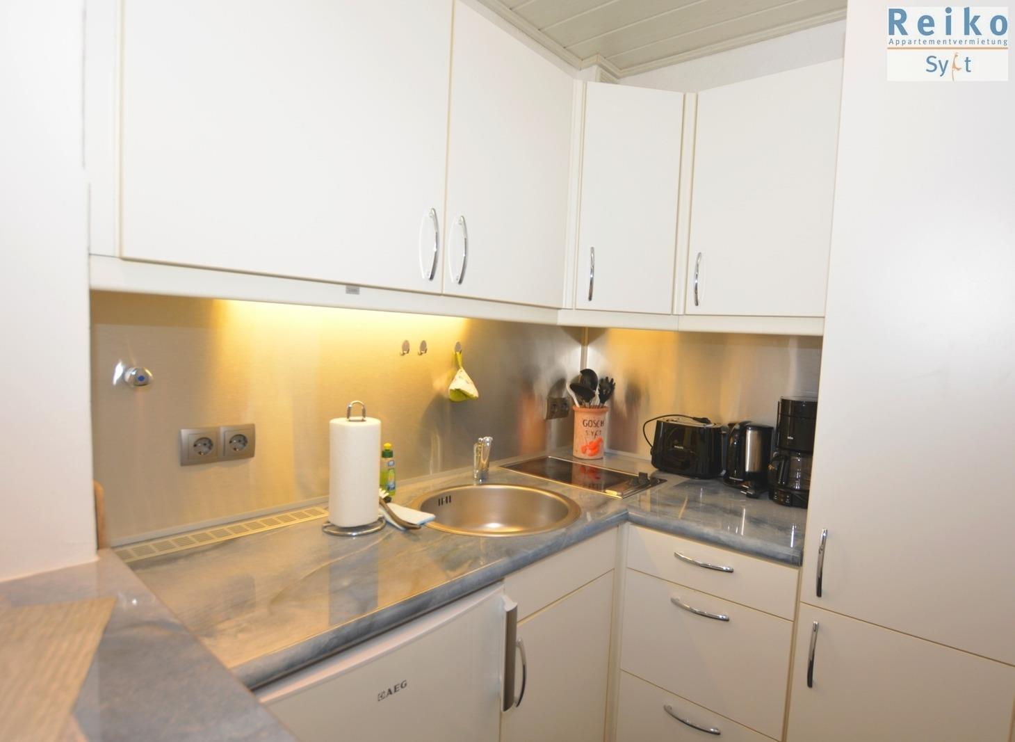Die Küchenzeile verfügt über ein 2er-Ceran-Kochfeld, Kaffeemaschine, Wasser- und Eierkocher, Toaster, Bügelbrett und Bügeleisen.