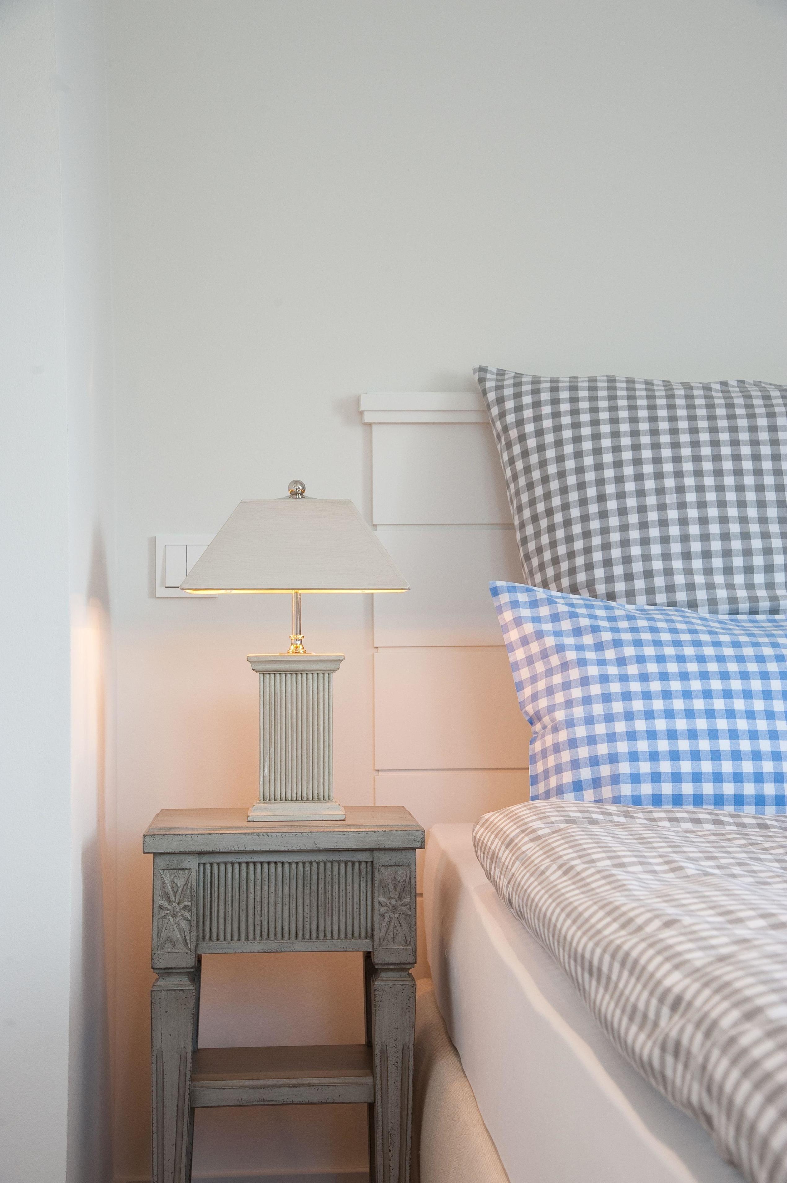 Im Obergeschoss befindet sich das helle Schlafzimmer mit hochwertigem Boxspring-Doppelbett, Safe und TV sowie ein Badezimmer mit großzügiger Regendusche.