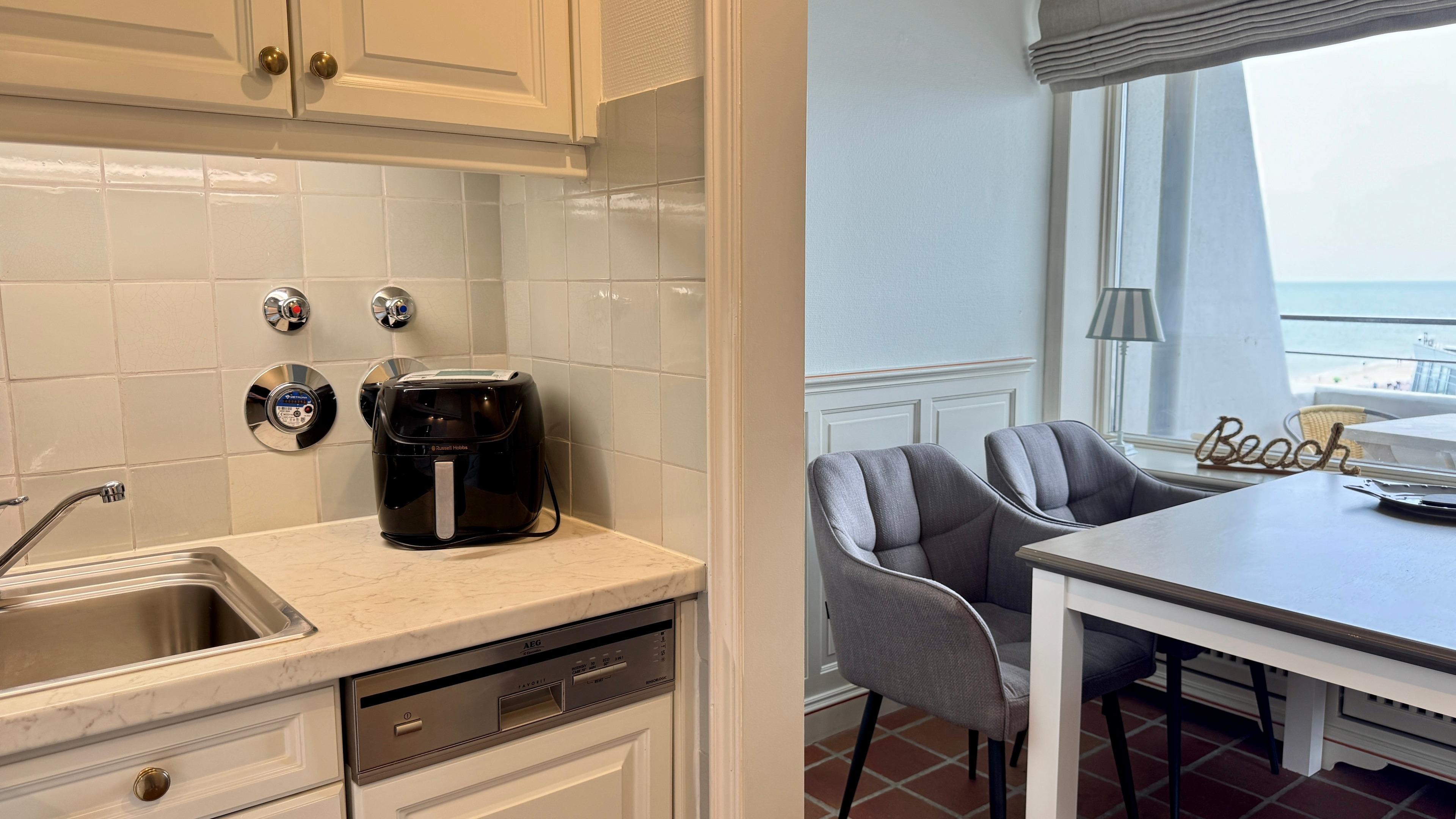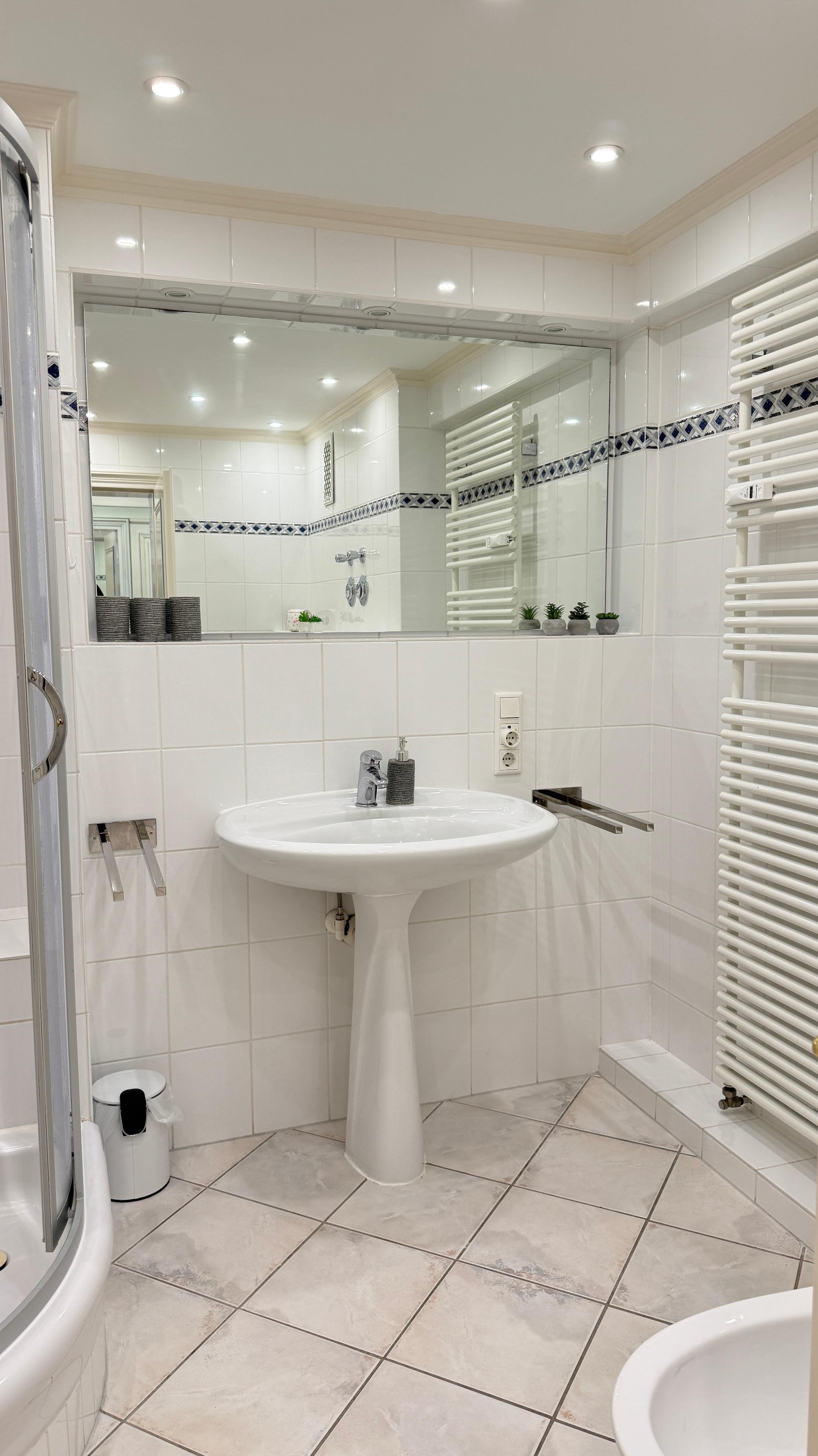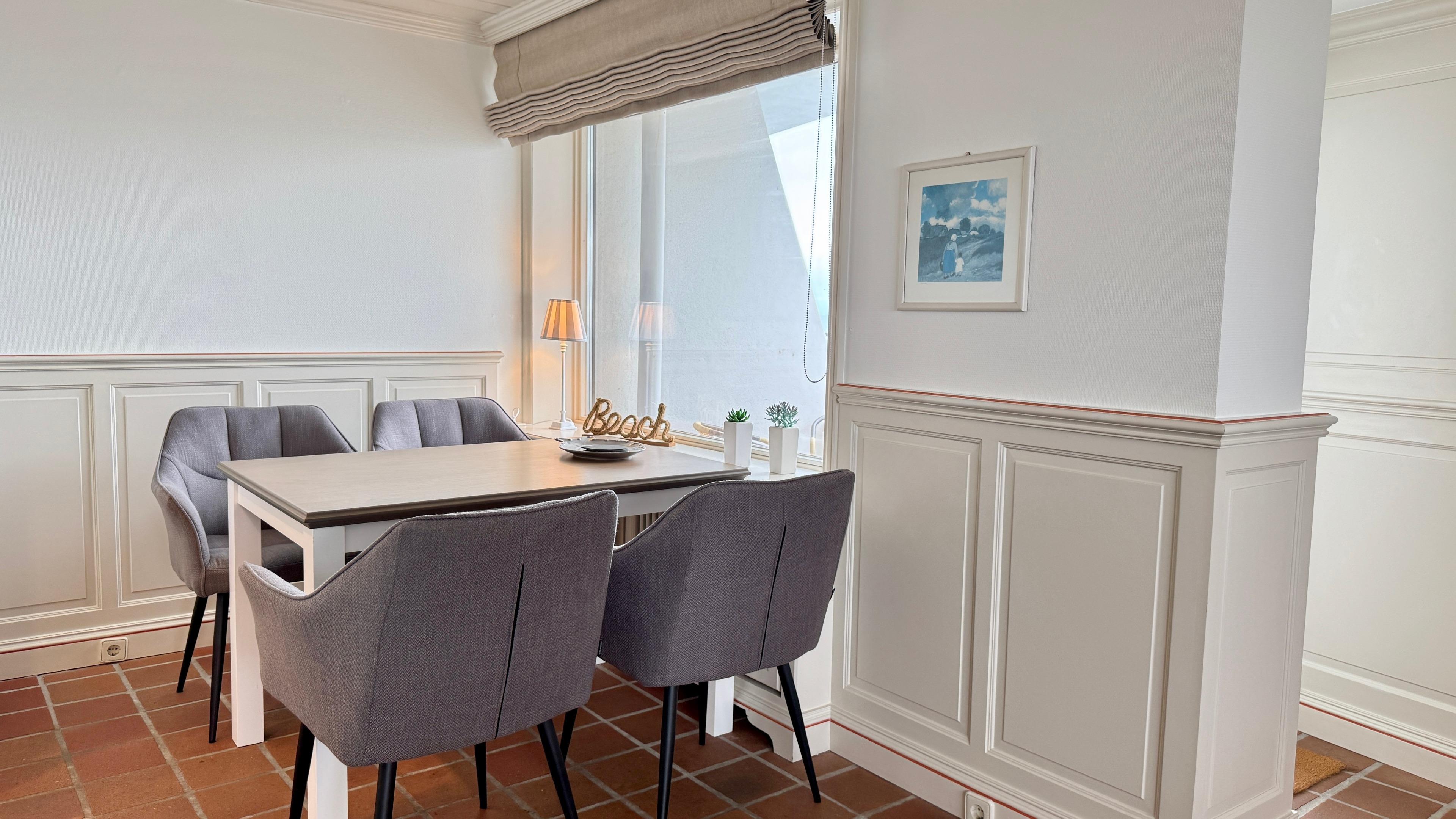 Im Eingangsbereich befindet sich ein geräumiger Flur mit Garderobe und großer Spiegelfläche. Zur rechten Seite befindet sich das hellgeflieste, großzügige innenliegende Duschbad, das mit WC, Bidet, Waschbecken, Handtuchtrockner und Haarföhn ausgestattet ist. Der lichtdurchflutete und großzügige Wohnraum bietet komfortabel Platz für 3 Personen und ist mit einem gemütlichen 2er-Sofa, Sessel, einem Einzelschrankbett (für eine dritte Person), Flachbild-TV, sowie einem wohnungseigenem WLAN (ohne Gewähr) ausgestattet. Von hier haben Sie einen Zugang zum großen Ostbalkon und einen Zugang zum Nord-Westbalkon. Der Essplatz am Fenster ermöglicht einen herrlichen Blick auf die Nordsee und den Strand. Die offene Küche ist voll ausgestattet mit Geschirrspüler, Airfryer, Mikrowelle, Kaffeemaschine, Cerankochfeld und Wasserkocher.