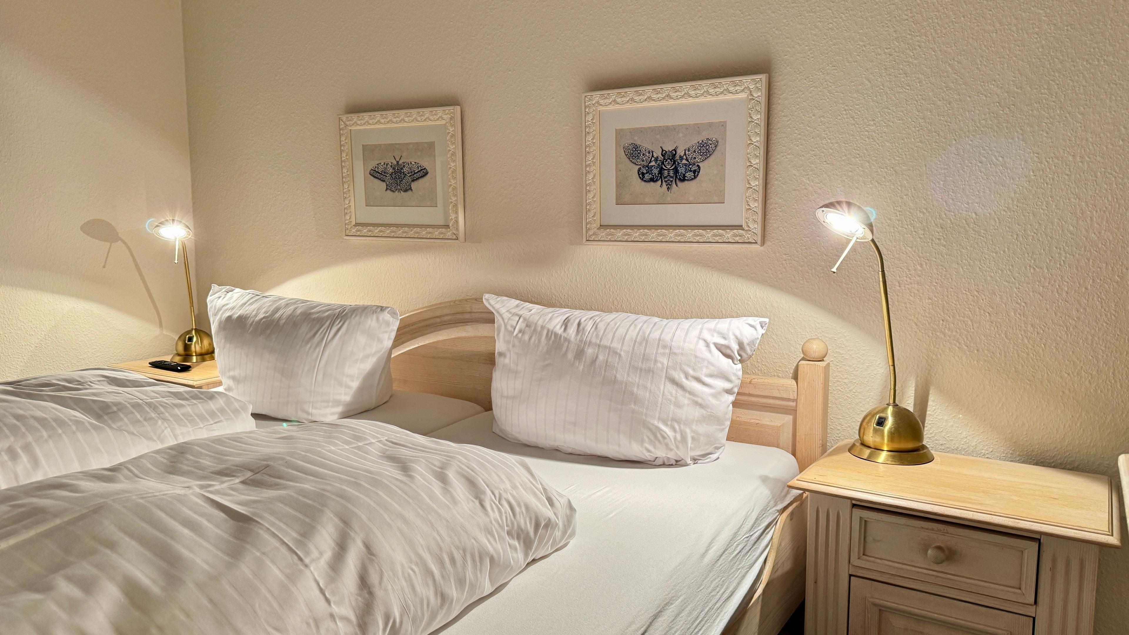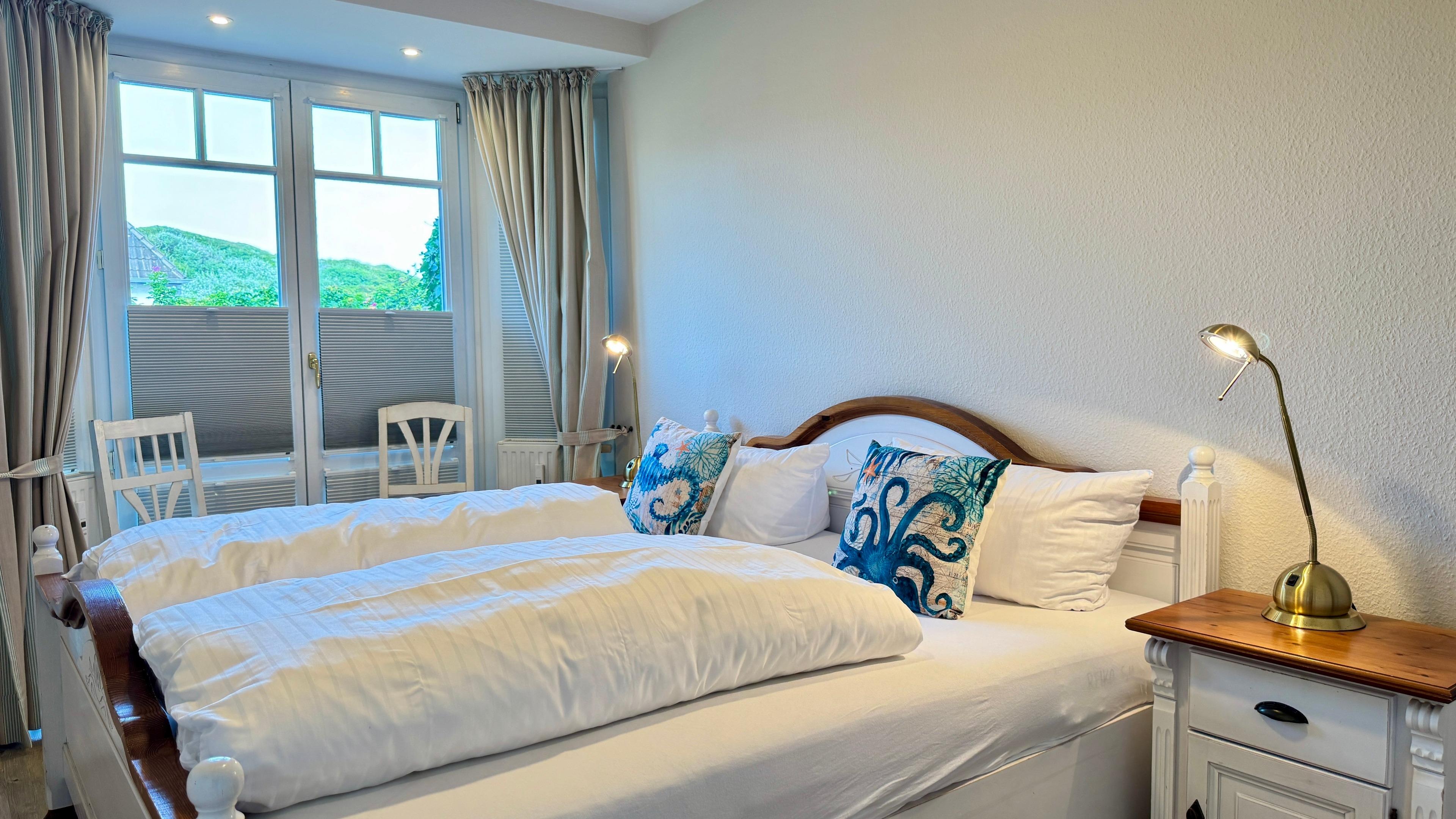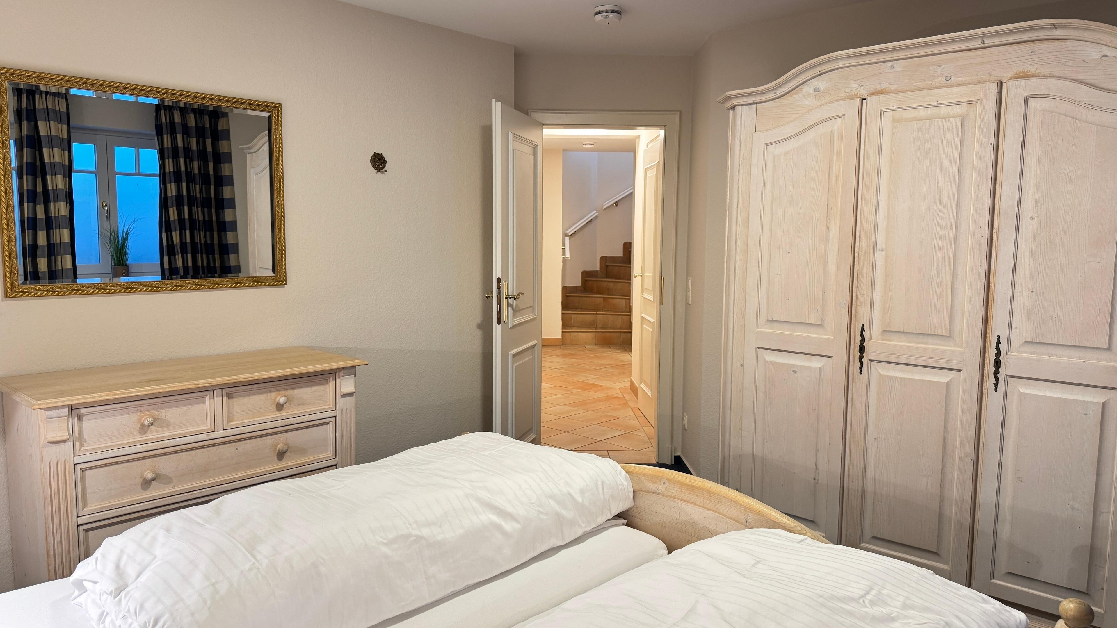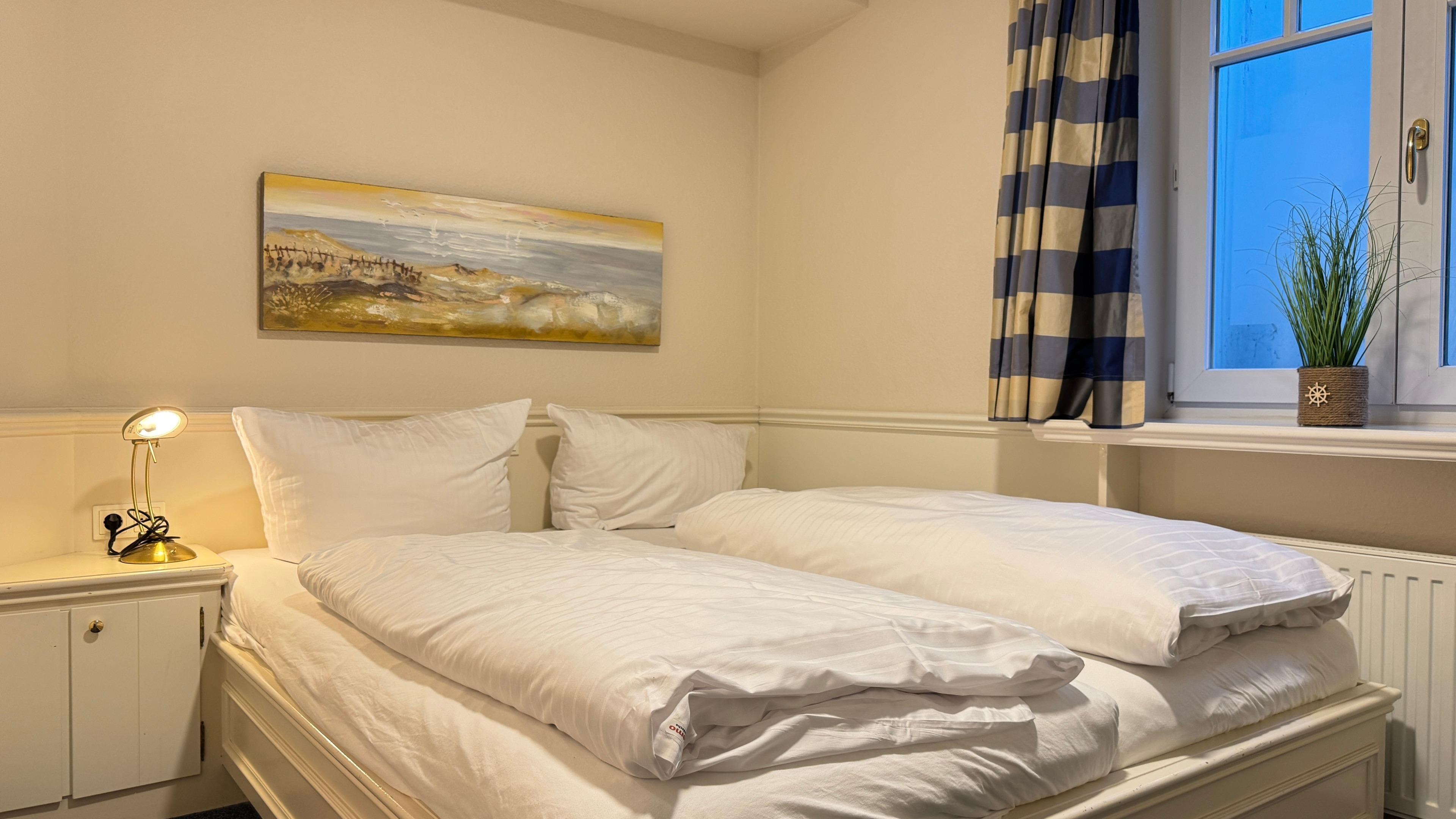 Im Erdgeschoss befinden sich der Wohnraum mit gemütlicher Sitz- und Essecke (im Erker), eine offene Küche, ein Schlafzimmer mit Doppelbett, ein Duschbad/WC sowie eine Südwest-Terrasse mit Strandkorb (April–Oktober). Im Untergeschoss erwarten Sie zwei weitere Schlafzimmer – eines mit Doppelbett, eines mit französischem Doppelbett – sowie ein Vollbad/WC mit Waschmaschine und Trockner.